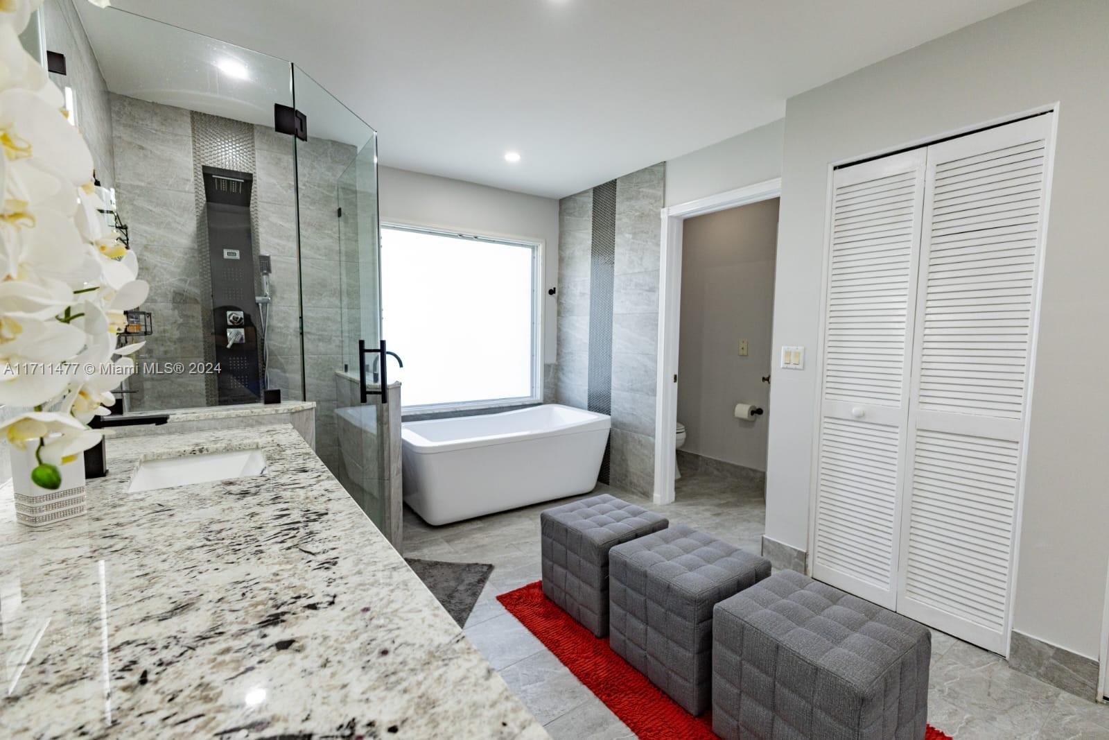 Welcome to this fully remodeled home offers a blend of elegance and comfort, featuring 5 bedrooms, 3 bathrooms. Upon entry, you are greeted by a Living room & grand open concept boasting a dramatic high ceiling, creating an impressive sense of space and light. Adjacent is the office which can be used as a room. Enjoy the dream master suite with modern's bathtub and shower in the bathroom. The kitchen offers white shaker cabinets, stunning glass tile backsplash and ample quartz countertops, a center island, stainless steel appliances, high hat lighting, a convenient coffee station inside cabinets. The heart of the home is the inviting family room, ideal for relaxation and entertainment. Other highlights include the spacious backyard with brand new pool and enclosure.