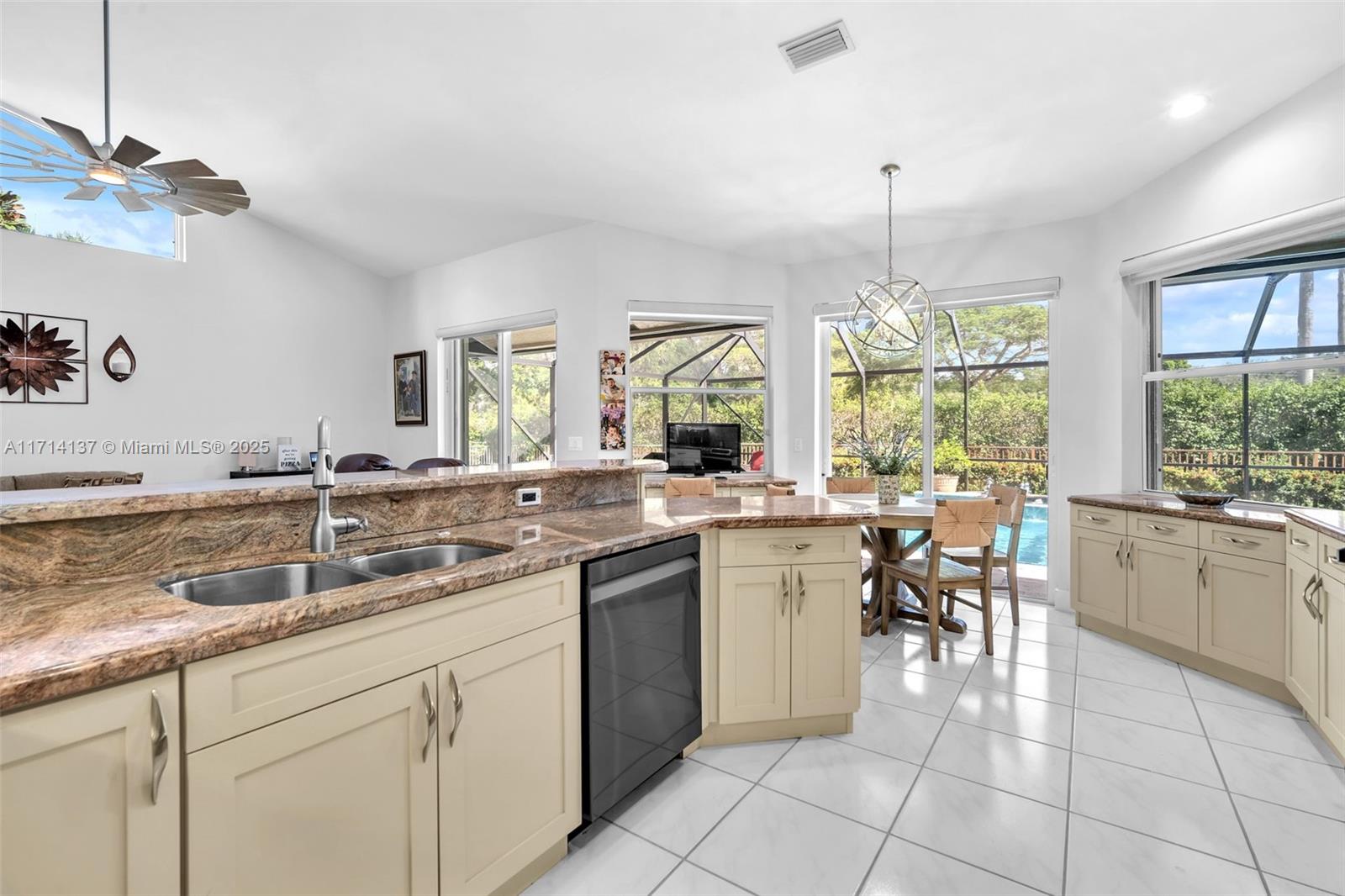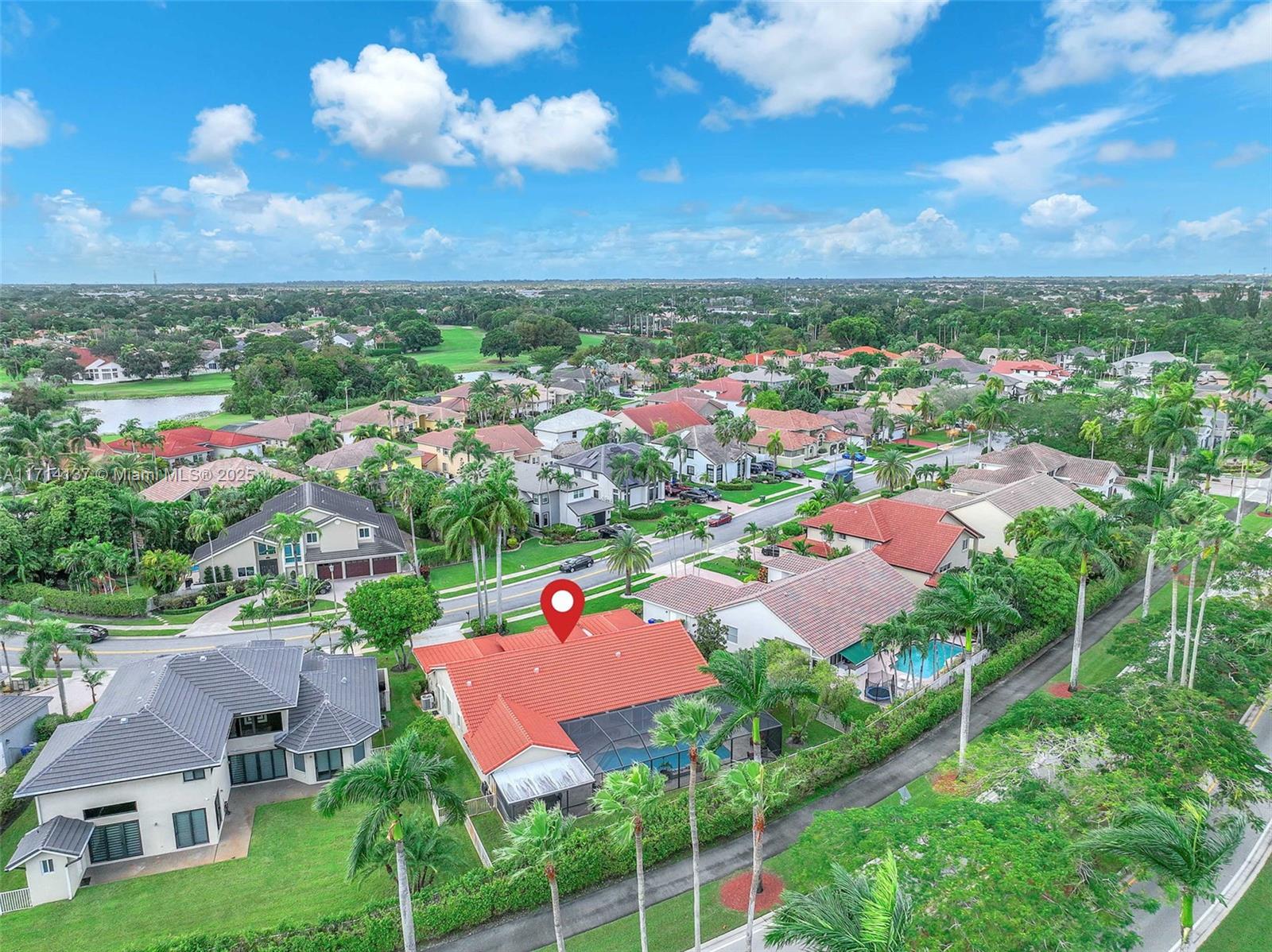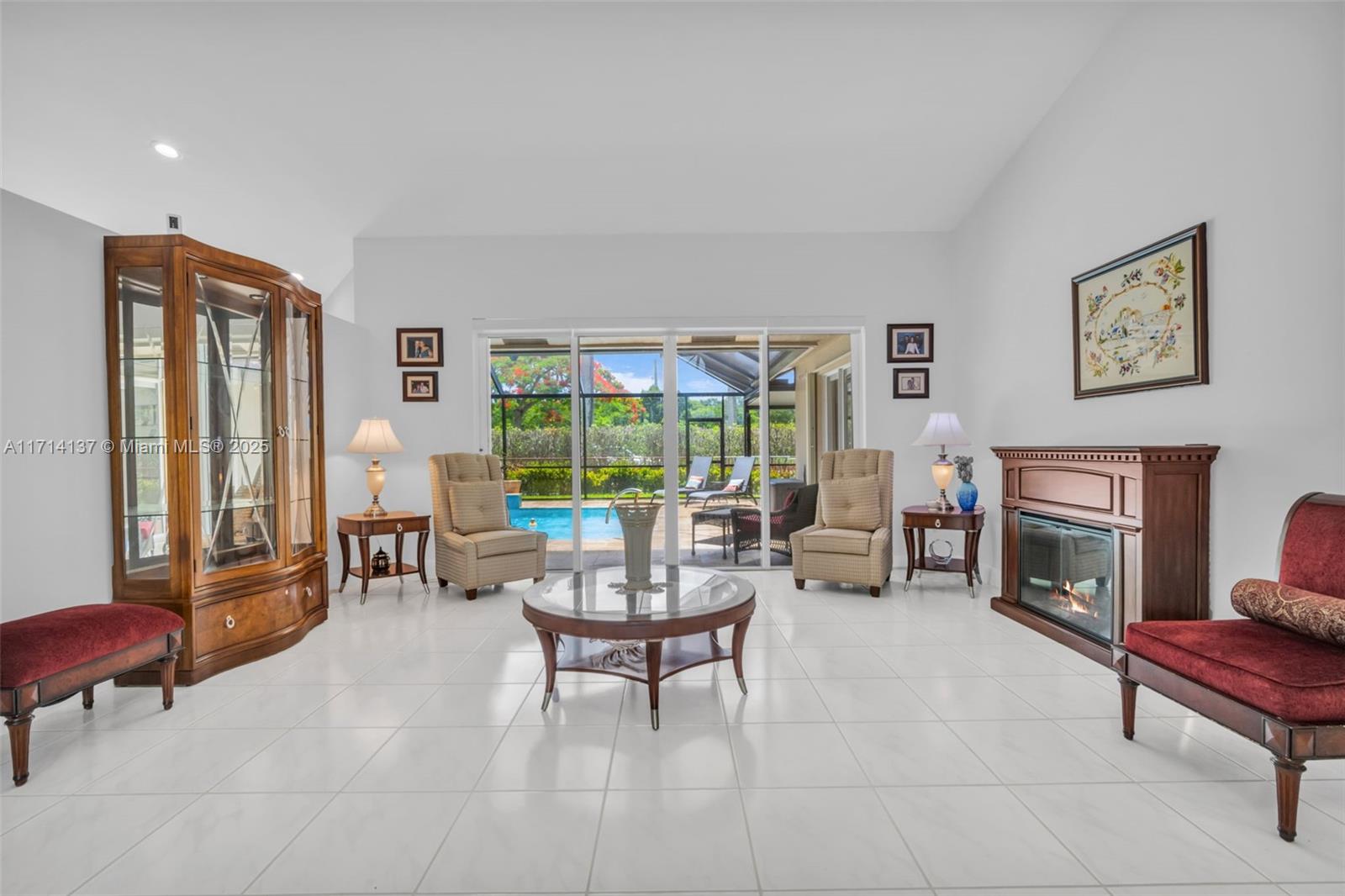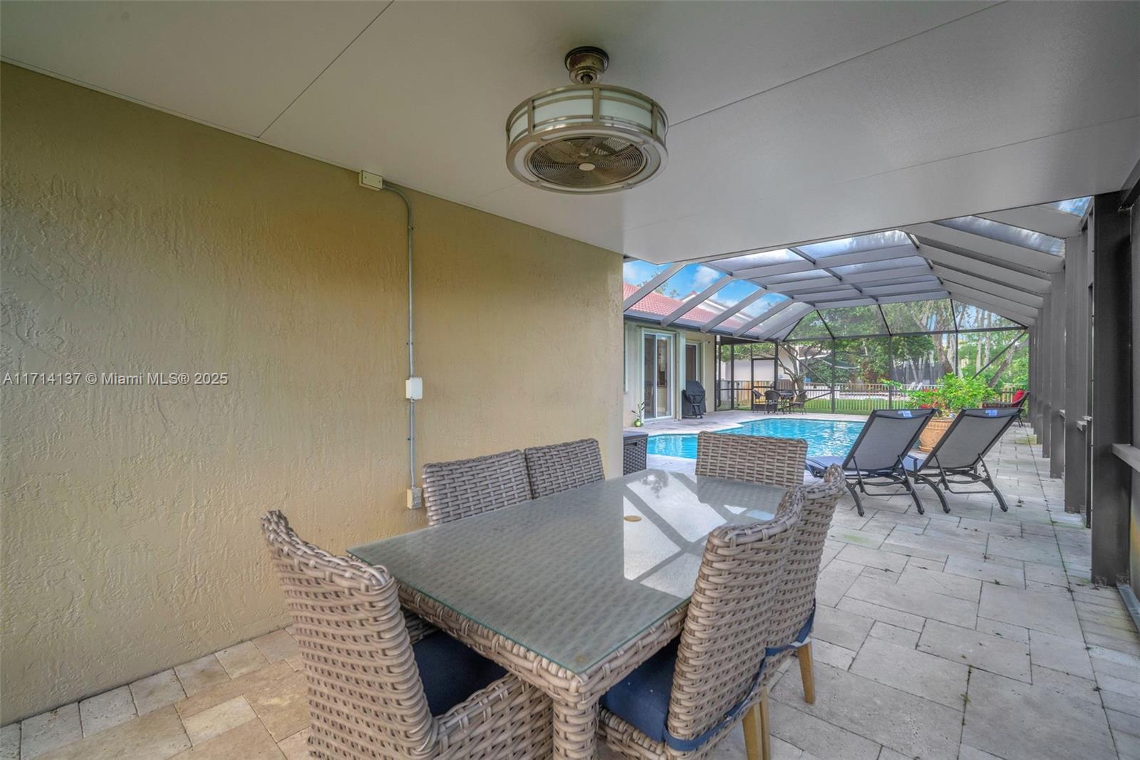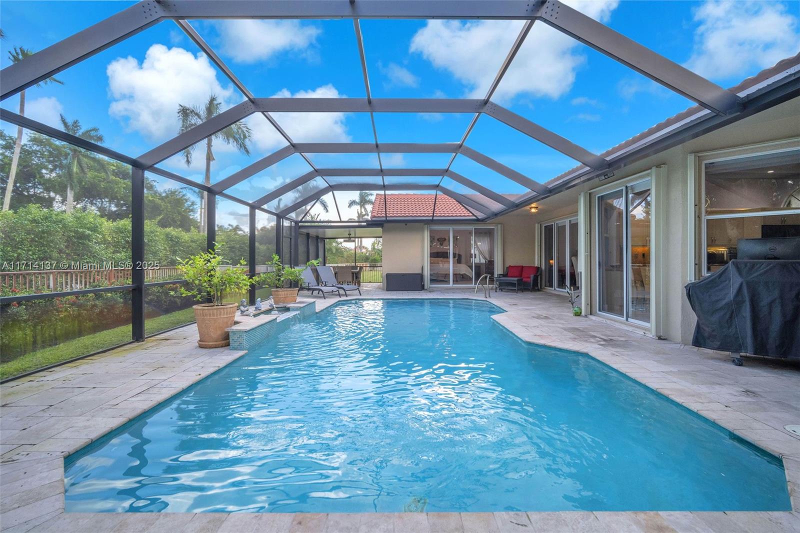 Golf daily and enjoy relaxing or entertaining in your very own backyard screened-in HEATED pool! Enjoy gatherings with an open upgraded kitchen, upgraded bathrooms, and separate living areas with volume ceilings throughout. Stay worry free for years to come for the ROOF, pool surface, travertine patio, screen, front impact/surrounding accordion shutters are all 5 years new. Want more? A long list of desirables includes a split-bedroom floor plan, remote controlled window treatments, a spacious partially covered patio/pool, no rear neighbors, auto sprinklers, fenced-in yard, and a long pavered driveway. This home is so clean, a true must see. Grand Palms is a guard gated GOLF community that is conveniently located near I-75, parks, schools, hospitals, restaurants, and shopping.