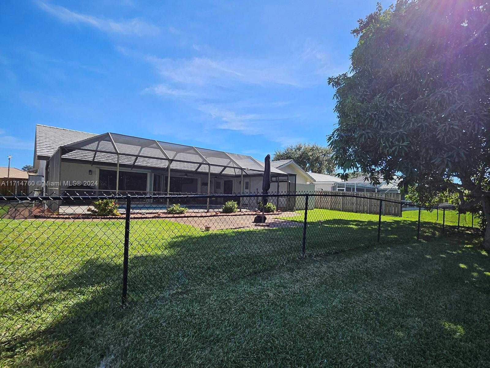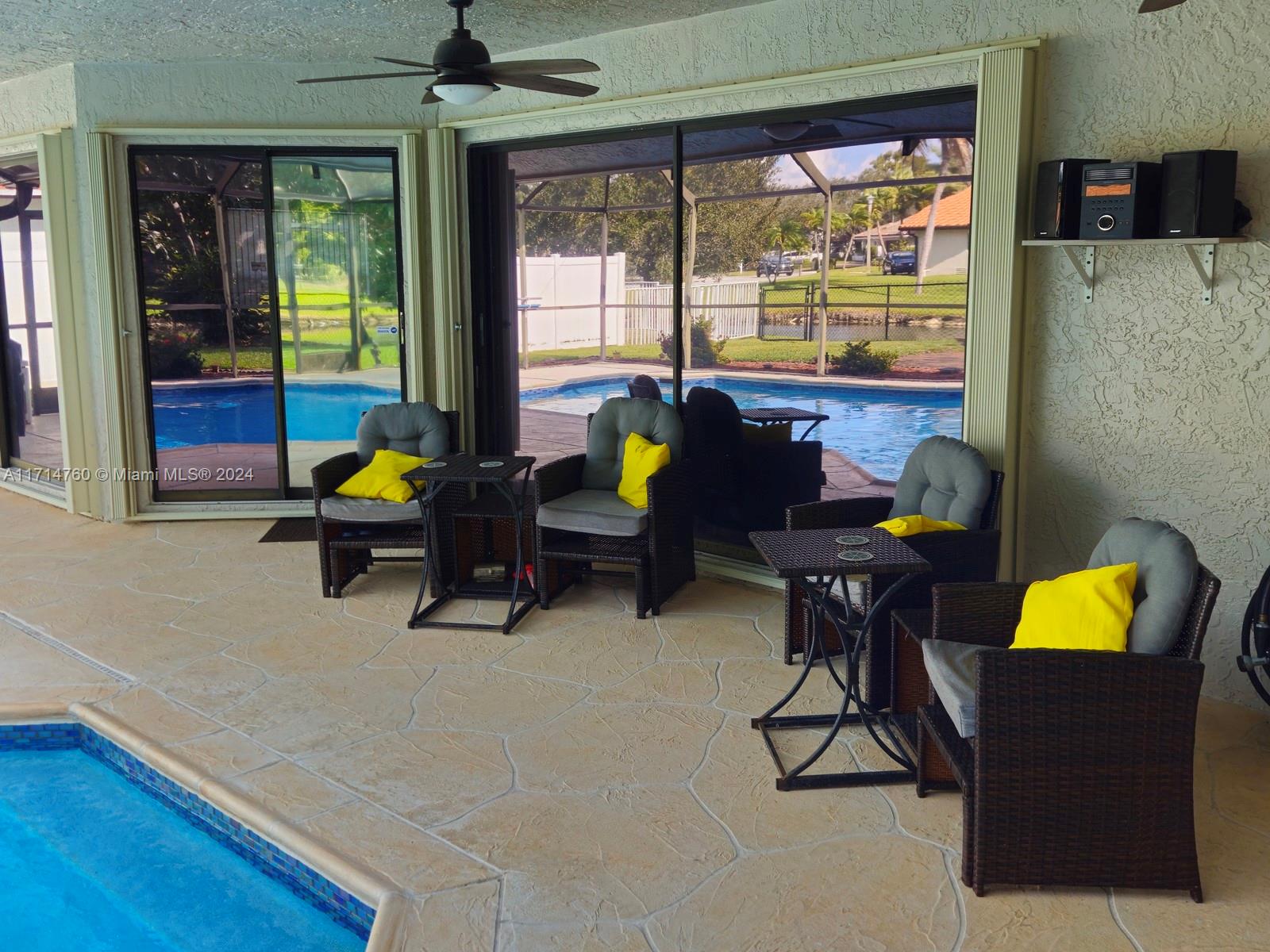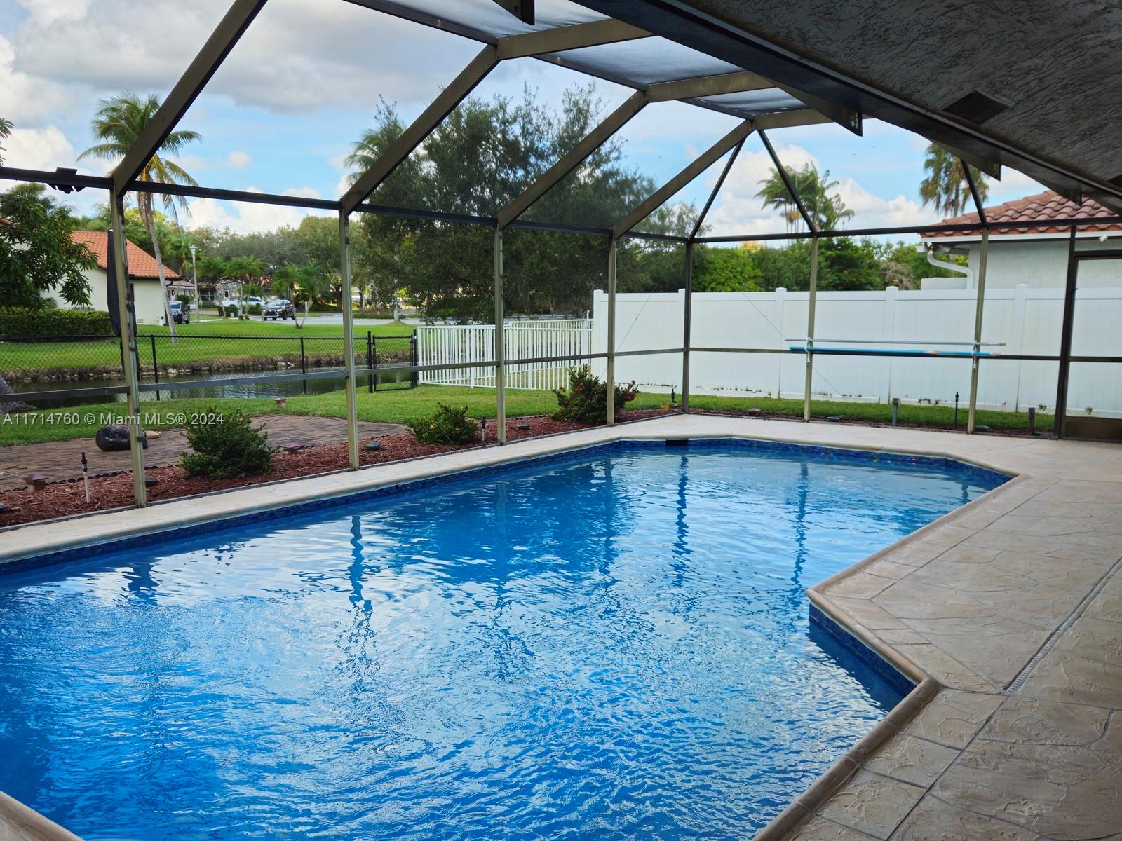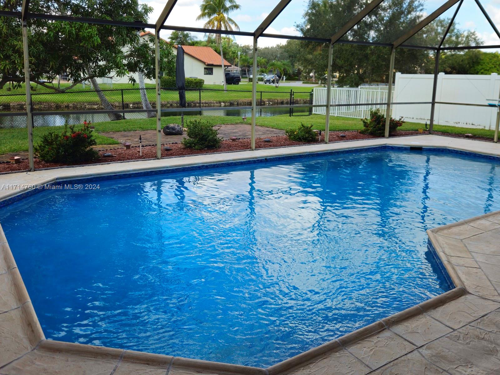 This Gorgeous 4/2.5 waterfront home is located in fabulous Jacaranda Lakes. The open floor plan showcases a beautifully updated kitchen with quartz counter-tops and upgraded appliances. The Laundry/pantry has upgraded Samsung washer and dryer, storage cupboards, and shelves. All bathrooms were newly updated in 2023. The garage is large enough to fit two full-size cars, leaving the circular driveway free and clear for guest parking. The sparkling pool, equipped with an automatic chlorine generator system, has a fully-screened, partially covered deck for lounging. The yard is completely fenced with fruited trees. The A/C unit was installed in 2020 and a new air handler was installed 2023. This house is a must see.