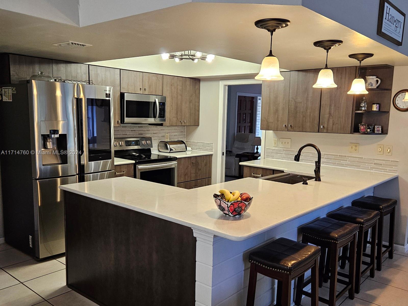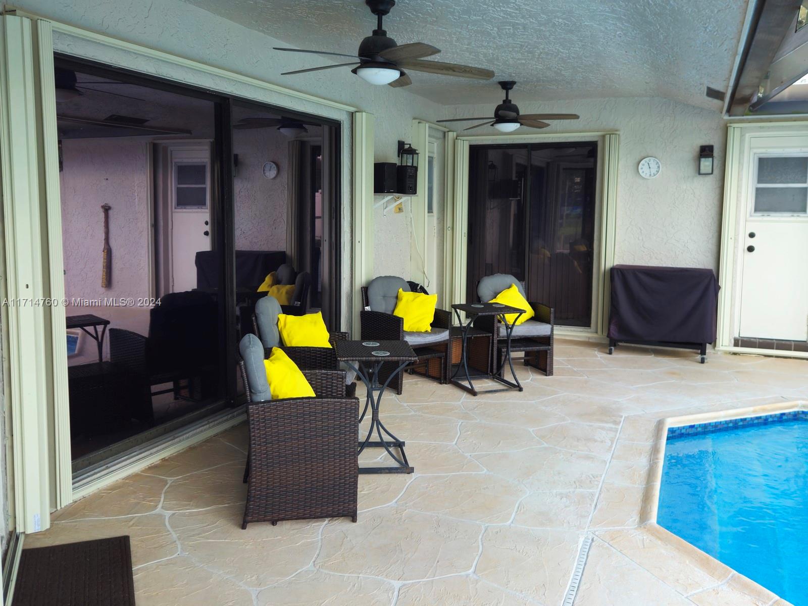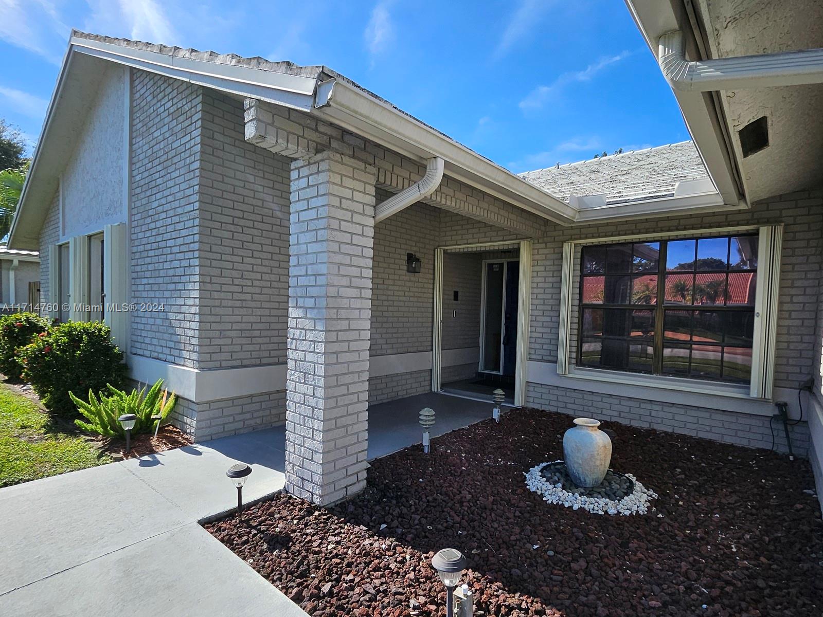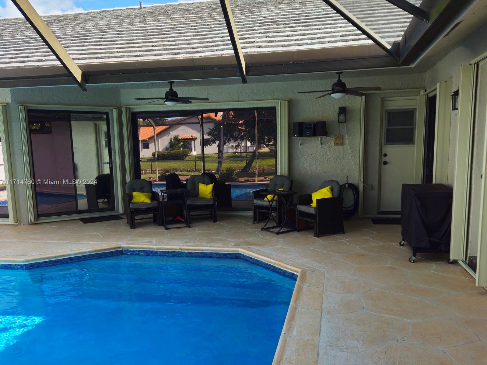 This Gorgeous 4/2.5 waterfront home is located in fabulous Jacaranda Lakes. The open floor plan showcases a beautifully updated kitchen with quartz counter-tops and upgraded appliances. The Laundry/pantry has upgraded Samsung washer and dryer, storage cupboards, and shelves. All bathrooms were newly updated in 2023. The garage is large enough to fit two full-size cars, leaving the circular driveway free and clear for guest parking. The sparkling pool, equipped with an automatic chlorine generator system, has a fully-screened, partially covered deck for lounging. The yard is completely fenced with fruited trees. The A/C unit was installed in 2020 and a new air handler was installed 2023. This house is a must see.