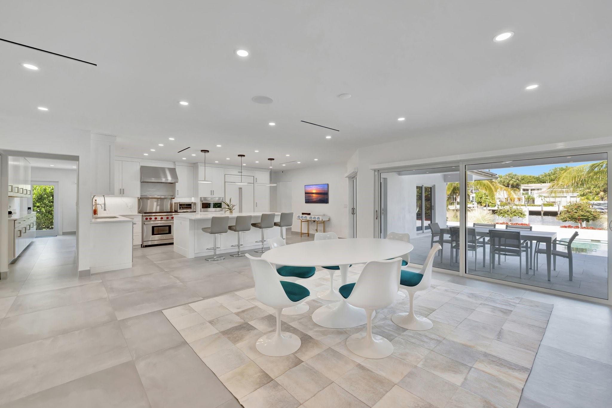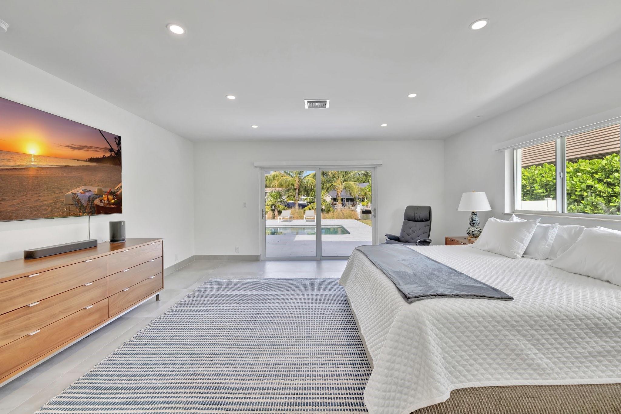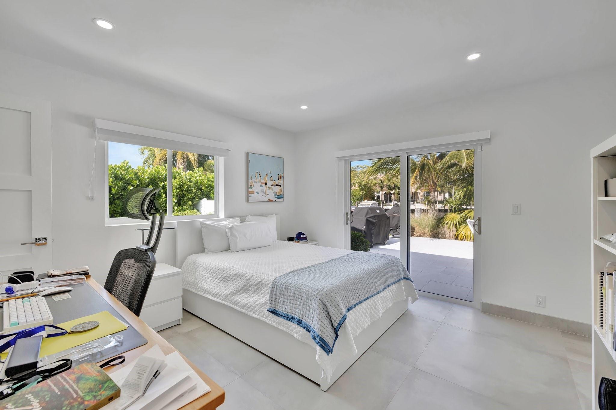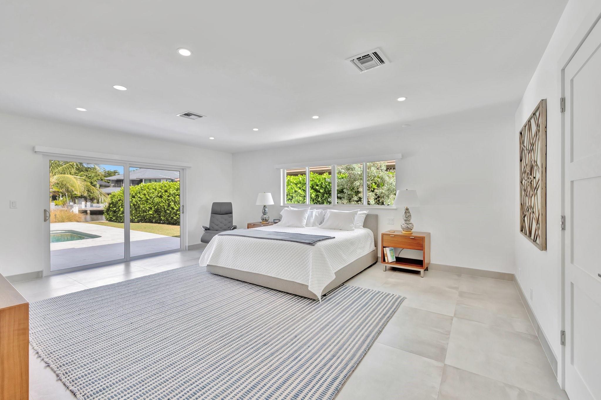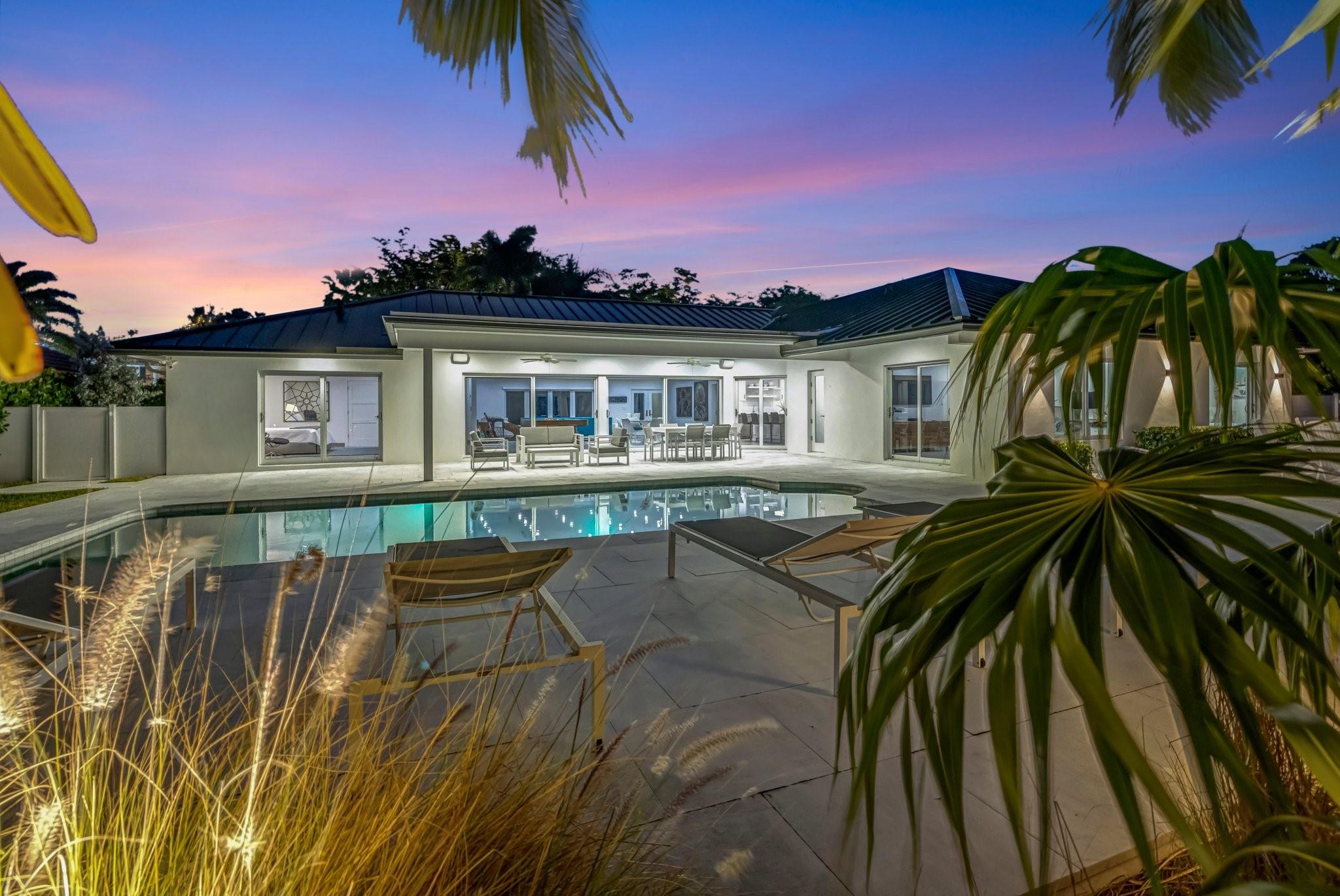 Located in Fort Lauderdale's premier 24/7 armed security guard-gated deepwater community. Enjoy stunning simplicity & functionality. Custom island-inspired single level residence. 2022 total renovation shows as NEW: metal roof, plumbing to street, all new electrical, air conditioners, tankless water heater & generator. Latest open concept living, great room, new Chef's kitchen, porcelain tile floors, new impact glass & interior doors. Private Primary Suite, dual closets, new modern spa style bath, enclosed water closet, soaking tub & floating vanities. Split floorplan: 2 secondary bedroom suites, office (4th bed) + cabana bath, air-conditioned garage. Most rooms access pool & wide-open radius turning basin views, 95 ft protected dockage. Perfectly Pine Crest & other A rated school location