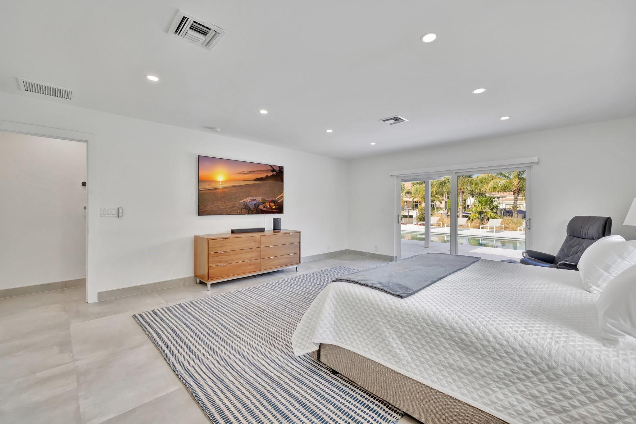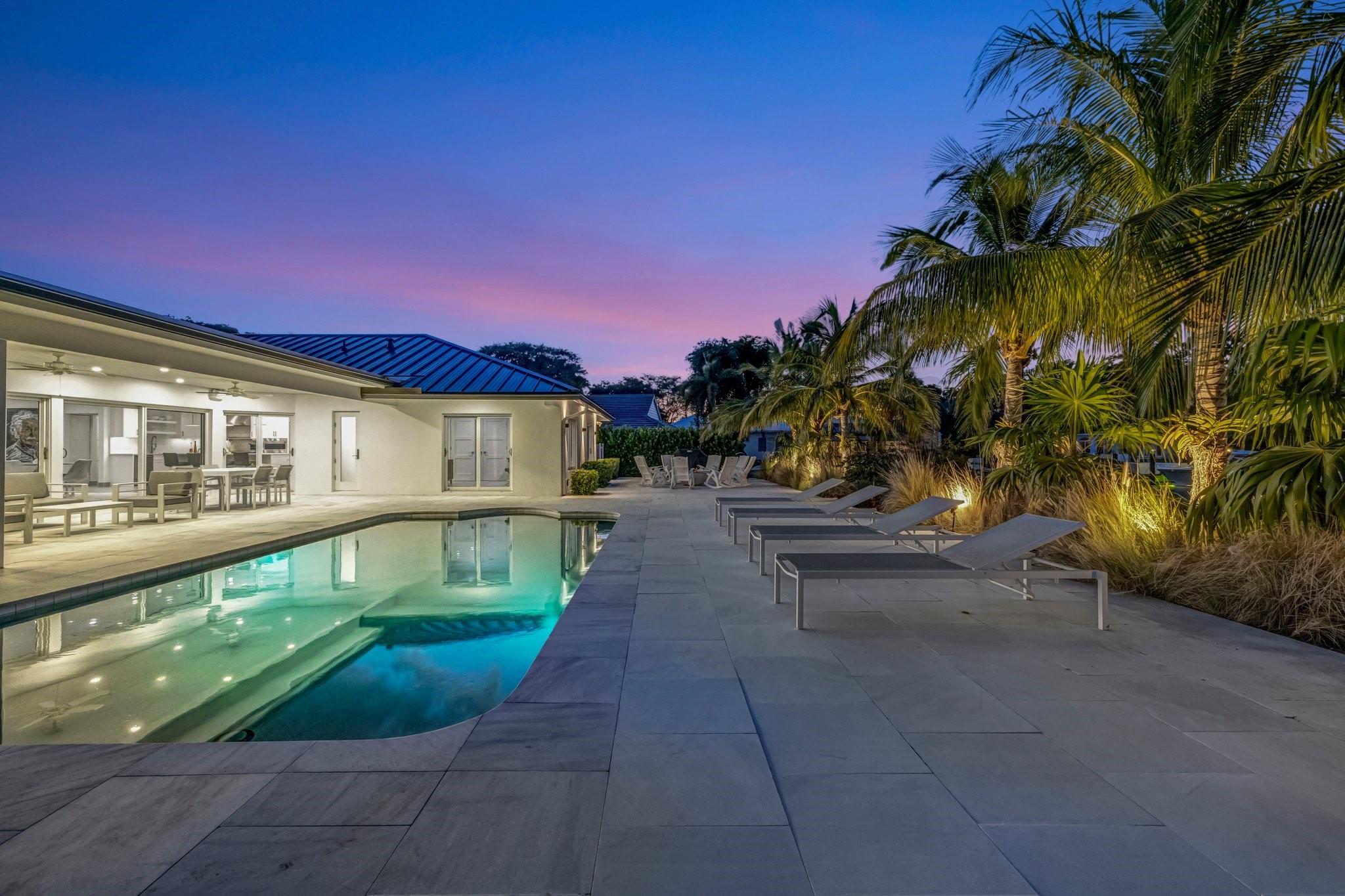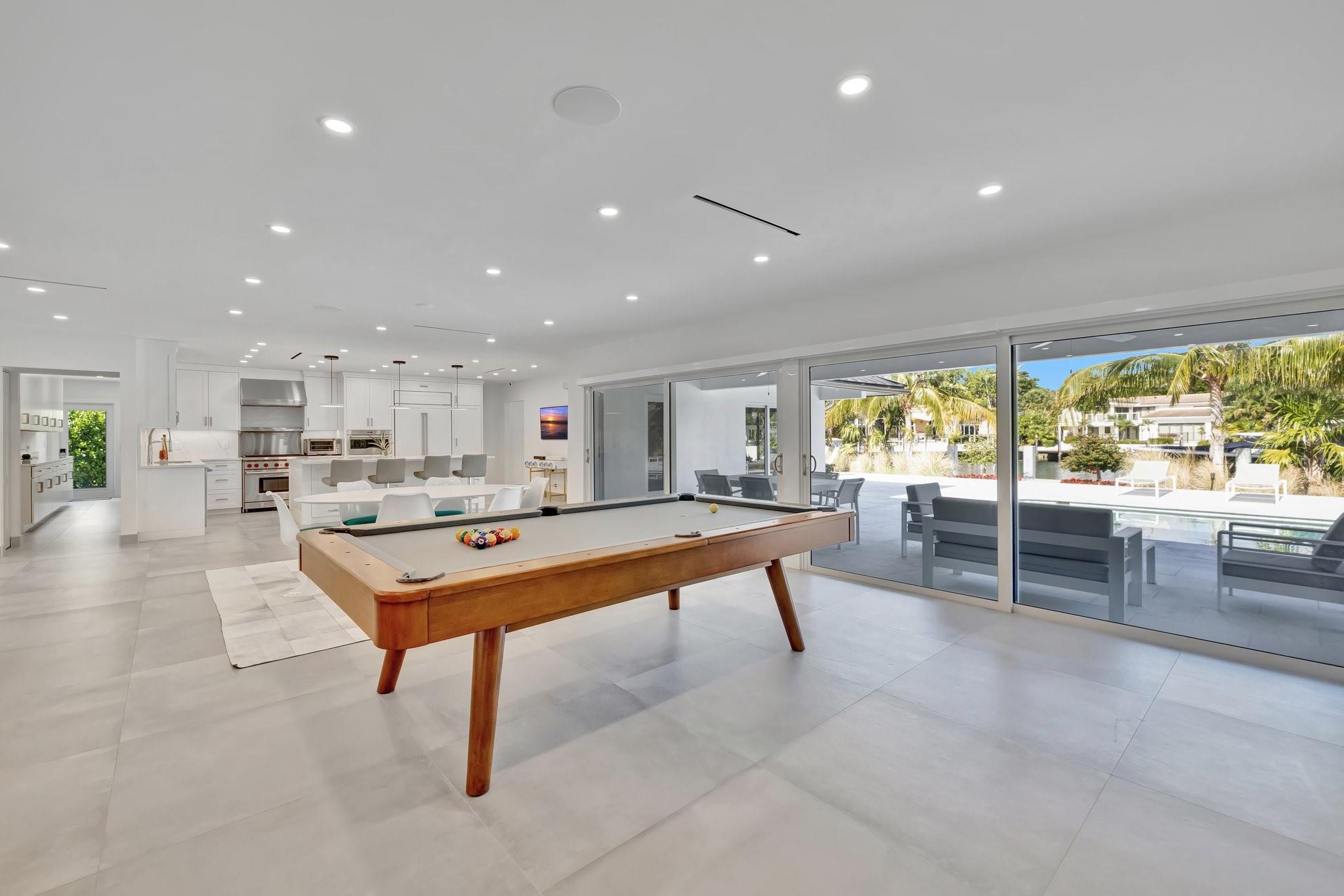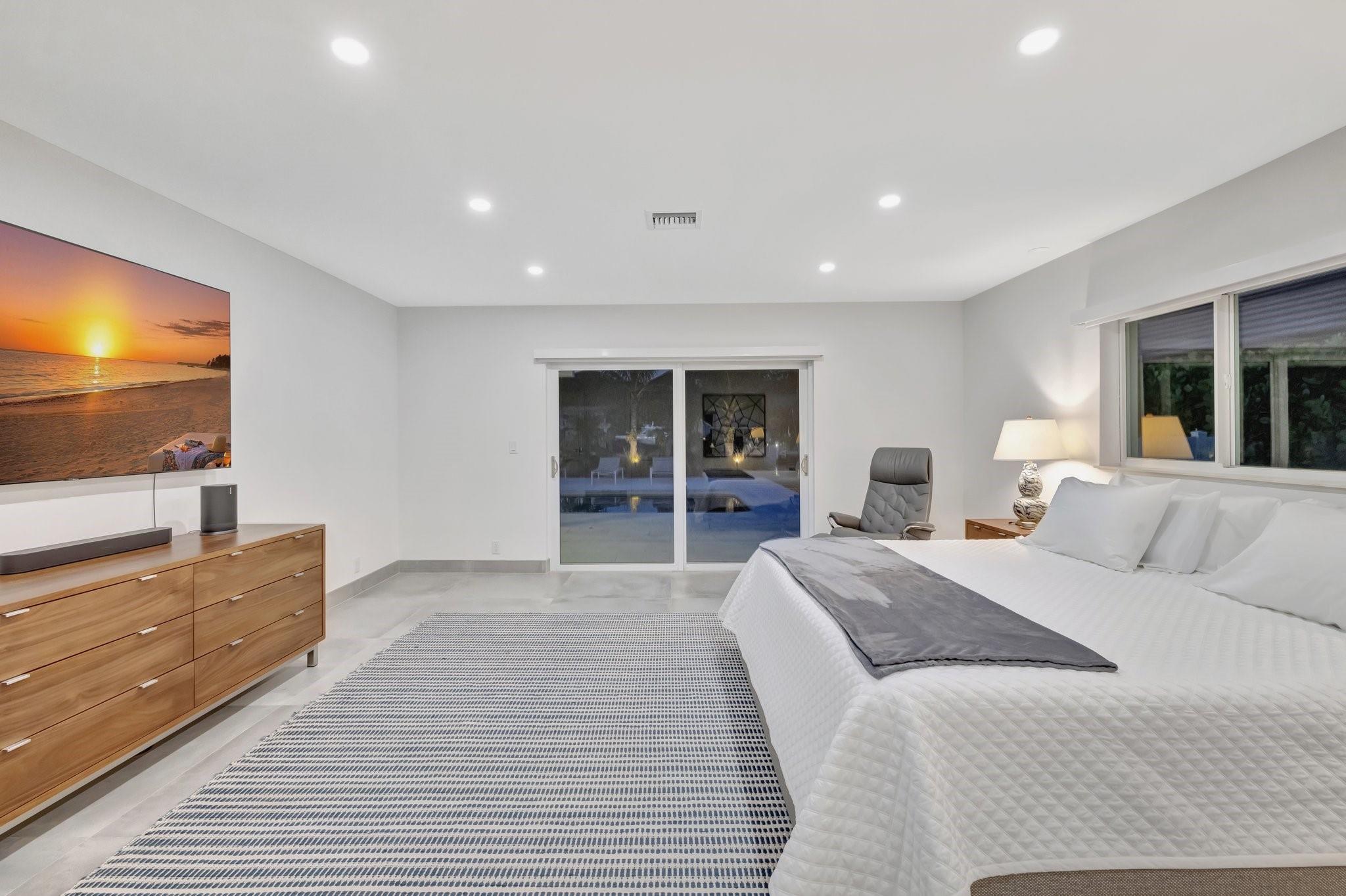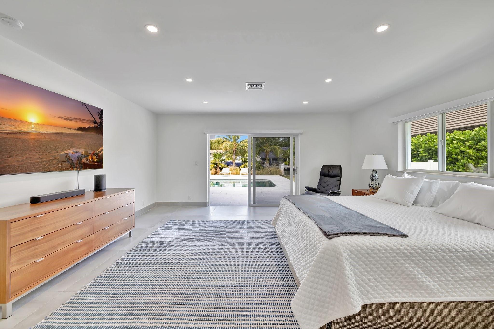 Located in Fort Lauderdale's premier 24/7 armed security guard-gated deepwater community. Enjoy stunning simplicity & functionality. Custom island-inspired single level residence. 2022 total renovation shows as NEW: metal roof, plumbing to street, all new electrical, air conditioners, tankless water heater & generator. Latest open concept living, great room, new Chef's kitchen, porcelain tile floors, new impact glass & interior doors. Private Primary Suite, dual closets, new modern spa style bath, enclosed water closet, soaking tub & floating vanities. Split floorplan: 2 secondary bedroom suites, office (4th bed) + cabana bath, air-conditioned garage. Most rooms access pool & wide-open radius turning basin views, 95 ft protected dockage. Perfectly Pine Crest & other A rated school location