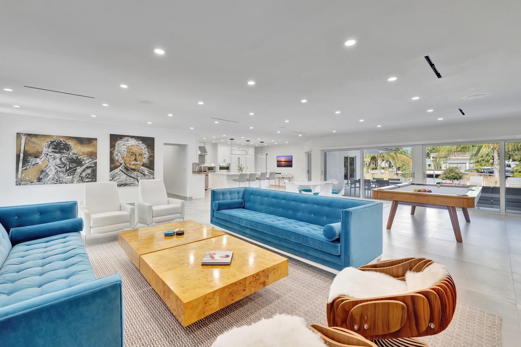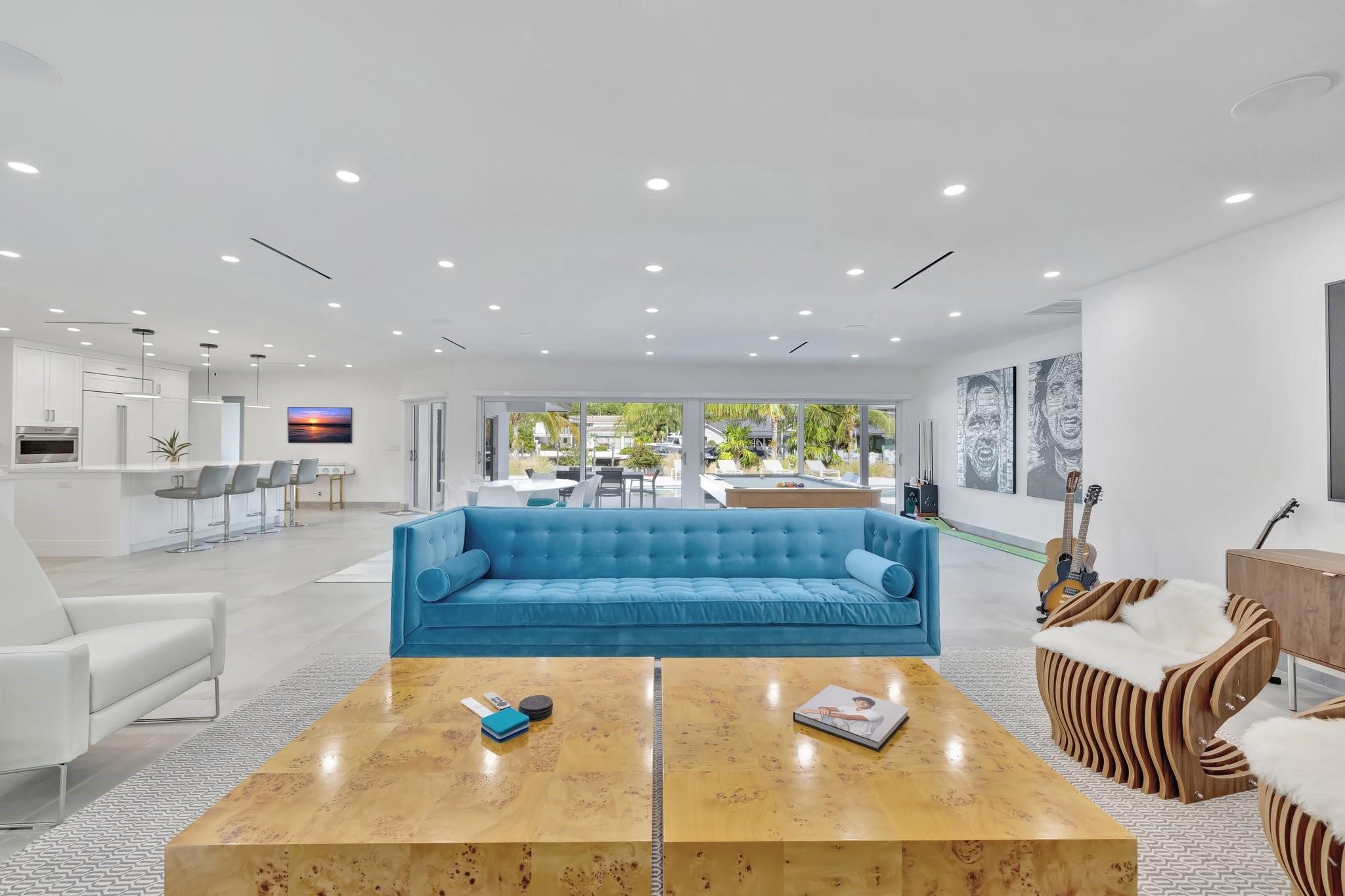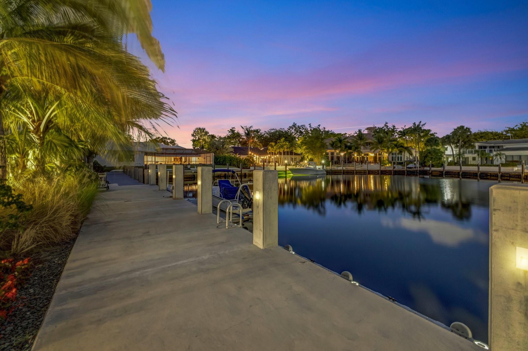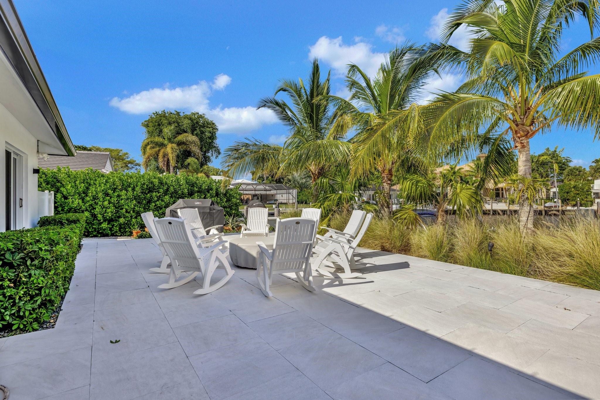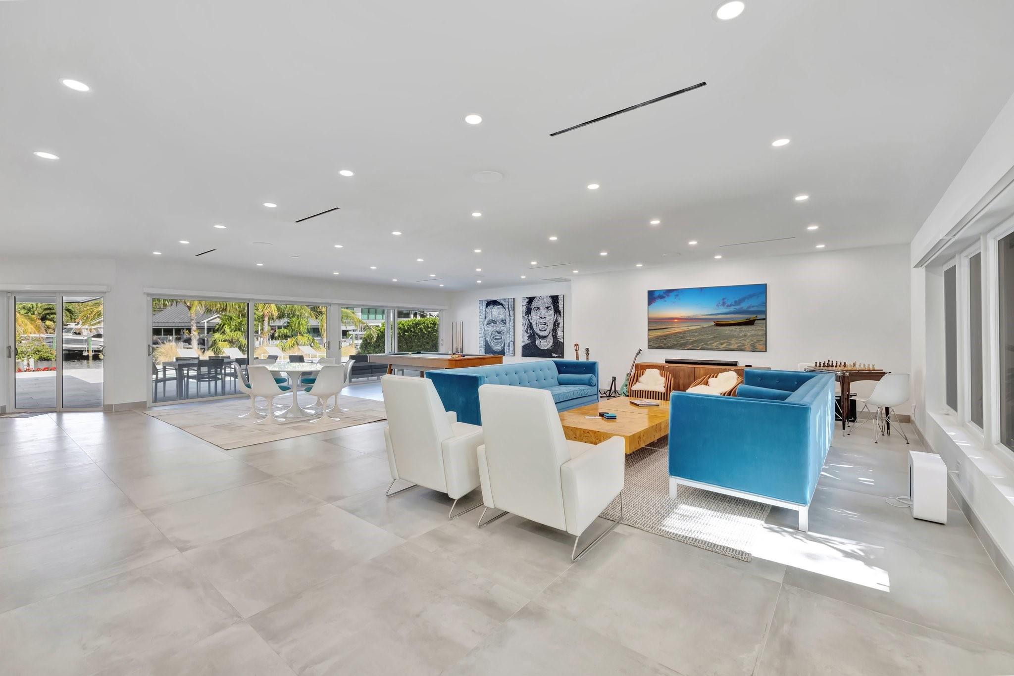 Located in Fort Lauderdale's premier 24/7 armed security guard-gated deepwater community. Enjoy stunning simplicity & functionality. Custom island-inspired single level residence. 2022 total renovation shows as NEW: metal roof, plumbing to street, all new electrical, air conditioners, tankless water heater & generator. Latest open concept living, great room, new Chef's kitchen, porcelain tile floors, new impact glass & interior doors. Private Primary Suite, dual closets, new modern spa style bath, enclosed water closet, soaking tub & floating vanities. Split floorplan: 2 secondary bedroom suites, office (4th bed) + cabana bath, air-conditioned garage. Most rooms access pool & wide-open radius turning basin views, 95 ft protected dockage. Perfectly Pine Crest & other A rated school location