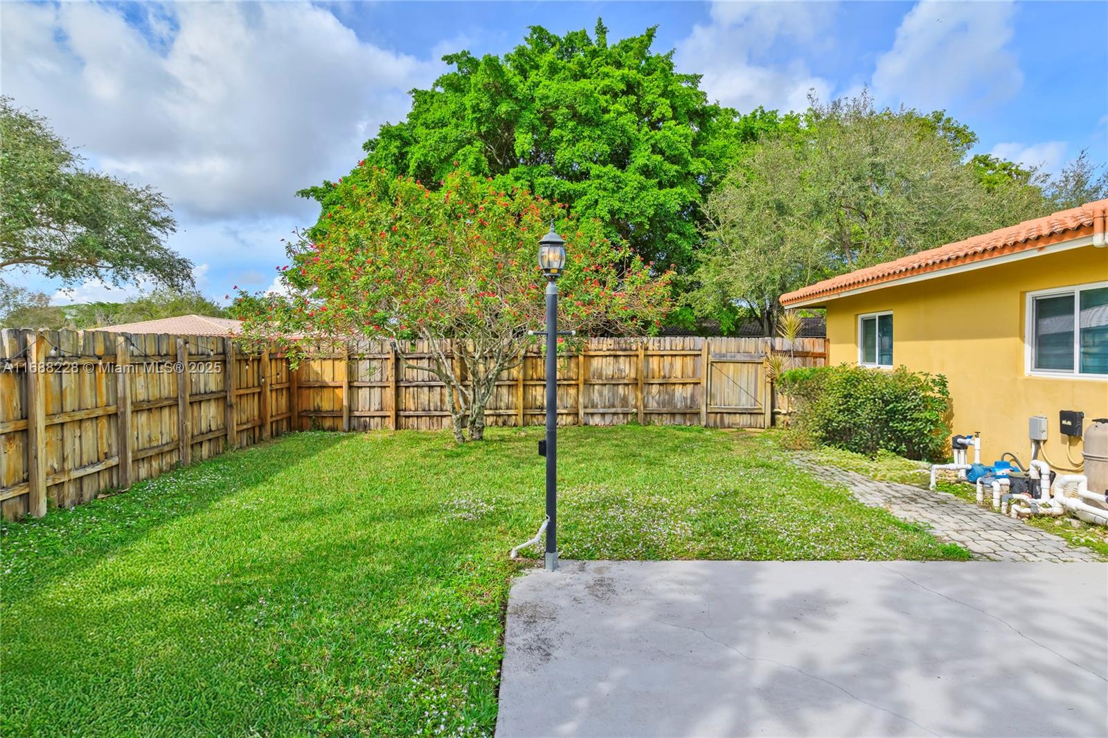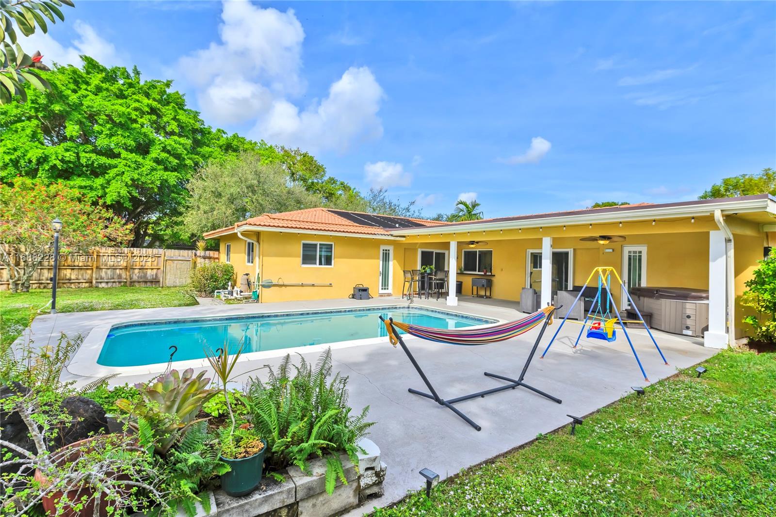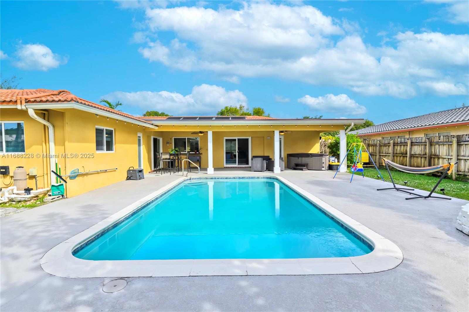 Stunning corner lot 4-Bedroom Pool Home! This beautifully renovated 2,075 sq ft single-family home with NO HOA offers 4 spacious bedrooms, 2 modern baths, a 15x30 pool and a freestanding hot tub. The brand new kitchen with open-concept features elegant quartz countertops and custom wood cabinets. Upgraded laundry room, new tankless water heater, smart door locks, cameras and impact windows and doors for security, insurance savings, and energy efficiency. Additional features include new wood-like tile flooring, new custom closets, recessed lighting, a 2-car AC-cooled garage and new flat roof! Don't miss the chance to own this move-in-ready gem!