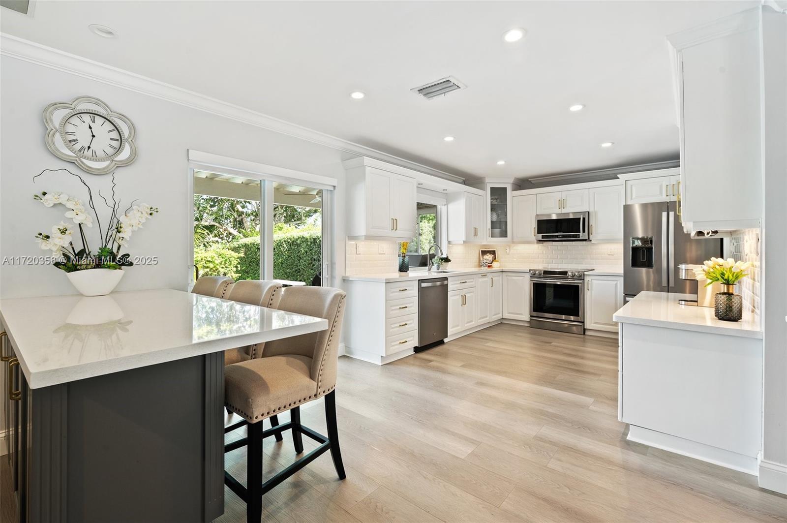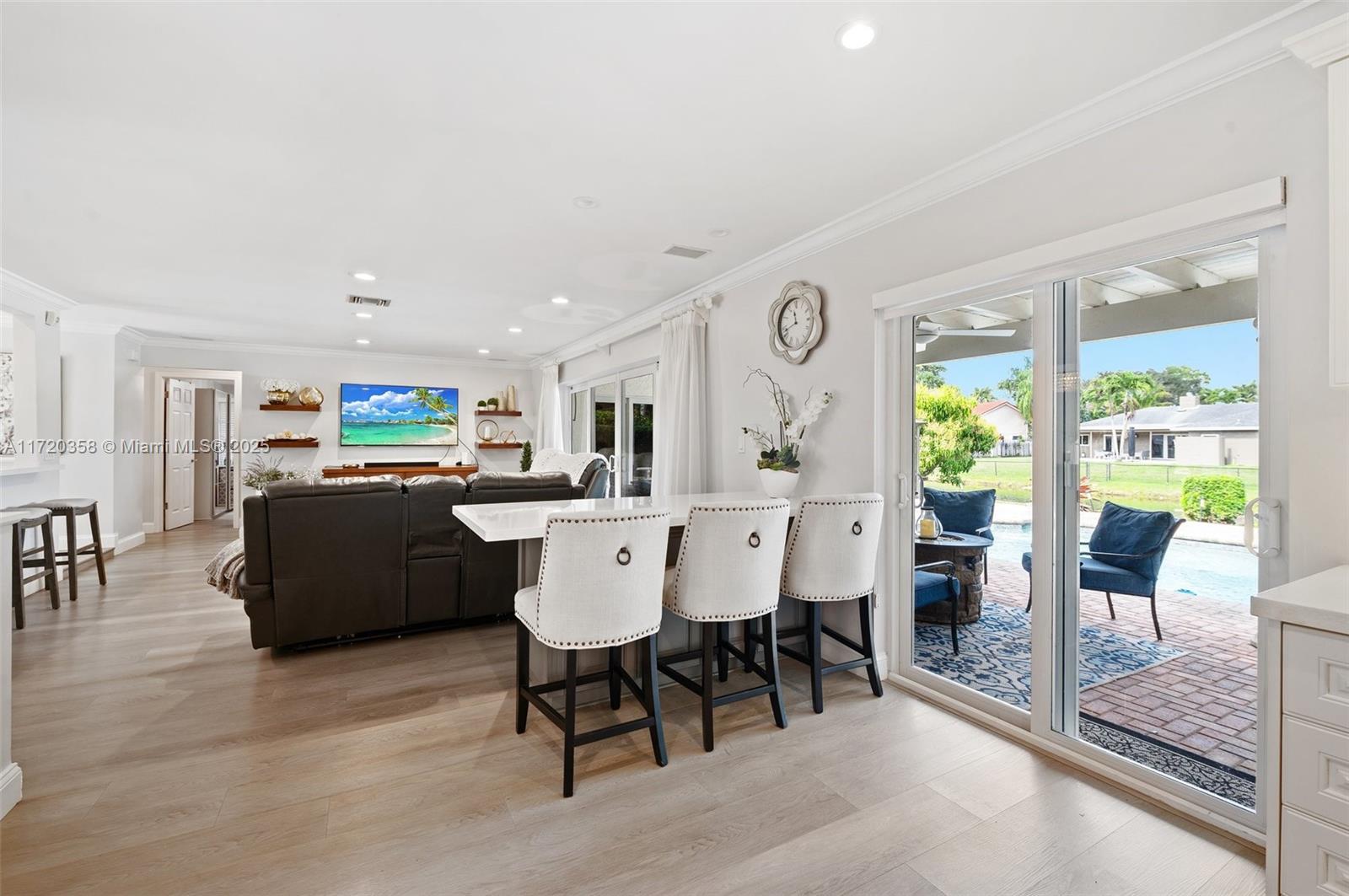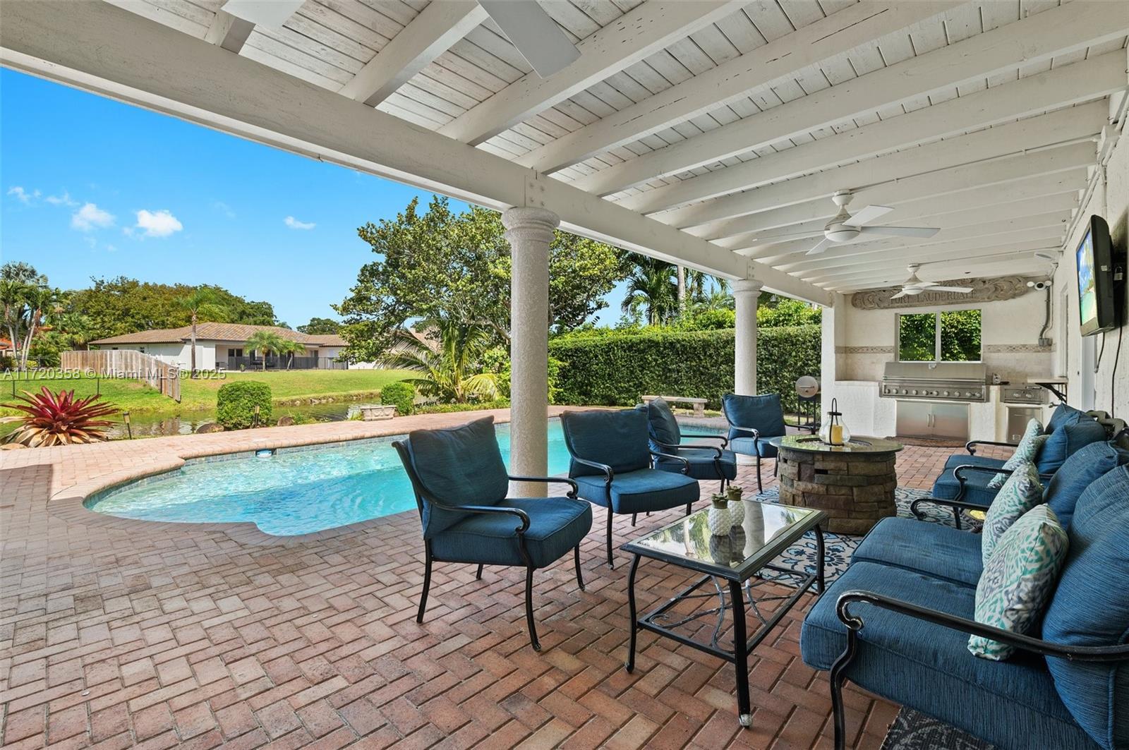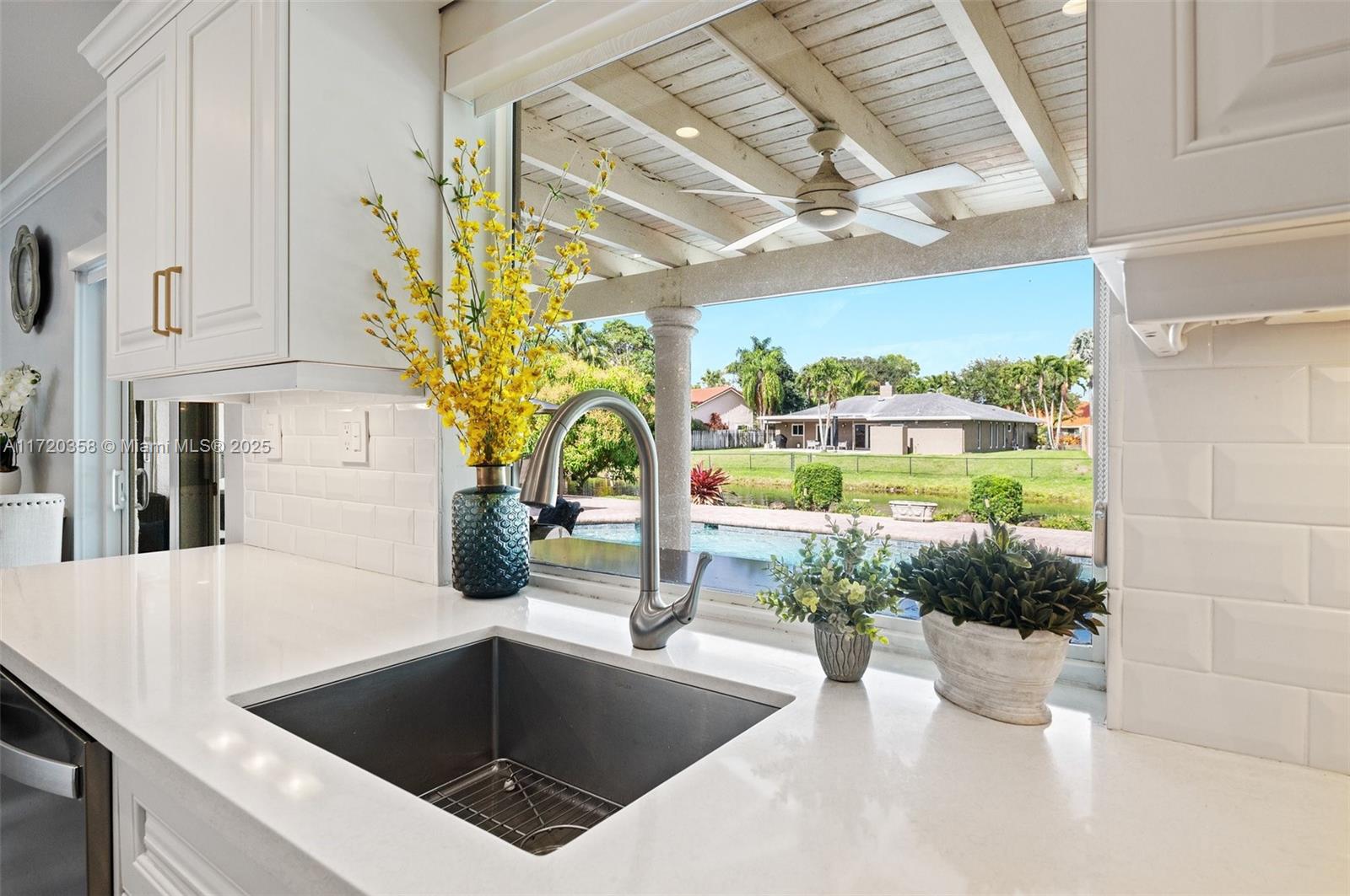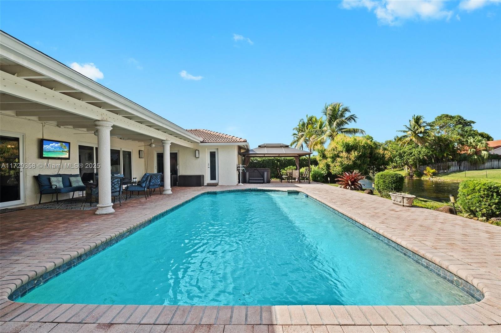 Welcome to this impeccably maintained 4 bedroom, 2 bath, single-story waterfront residence offering beautiful lake views. This thoughtfully renovated interior offers plenty of natural light, open floor plan, gourmet kitchen with custom cabinetry and SS appliances. Custom features include LVP flooring throughout living spaces, a bar and entertaining island with wine cooler. Relax and entertain in your pool, spa and patio area complete with summer kitchen. Impact windows and doors. Nestled in sought-after Jacaranda Lakes, enjoy proximity to parks with tennis, basketball, pickleball courts, and much more. Experience the best of Plantation living, with fine dining and South Florida's pristine beaches minutes away. Your luxury lakefront retreat awaits – a perfect blend of comfort and lifestyle!