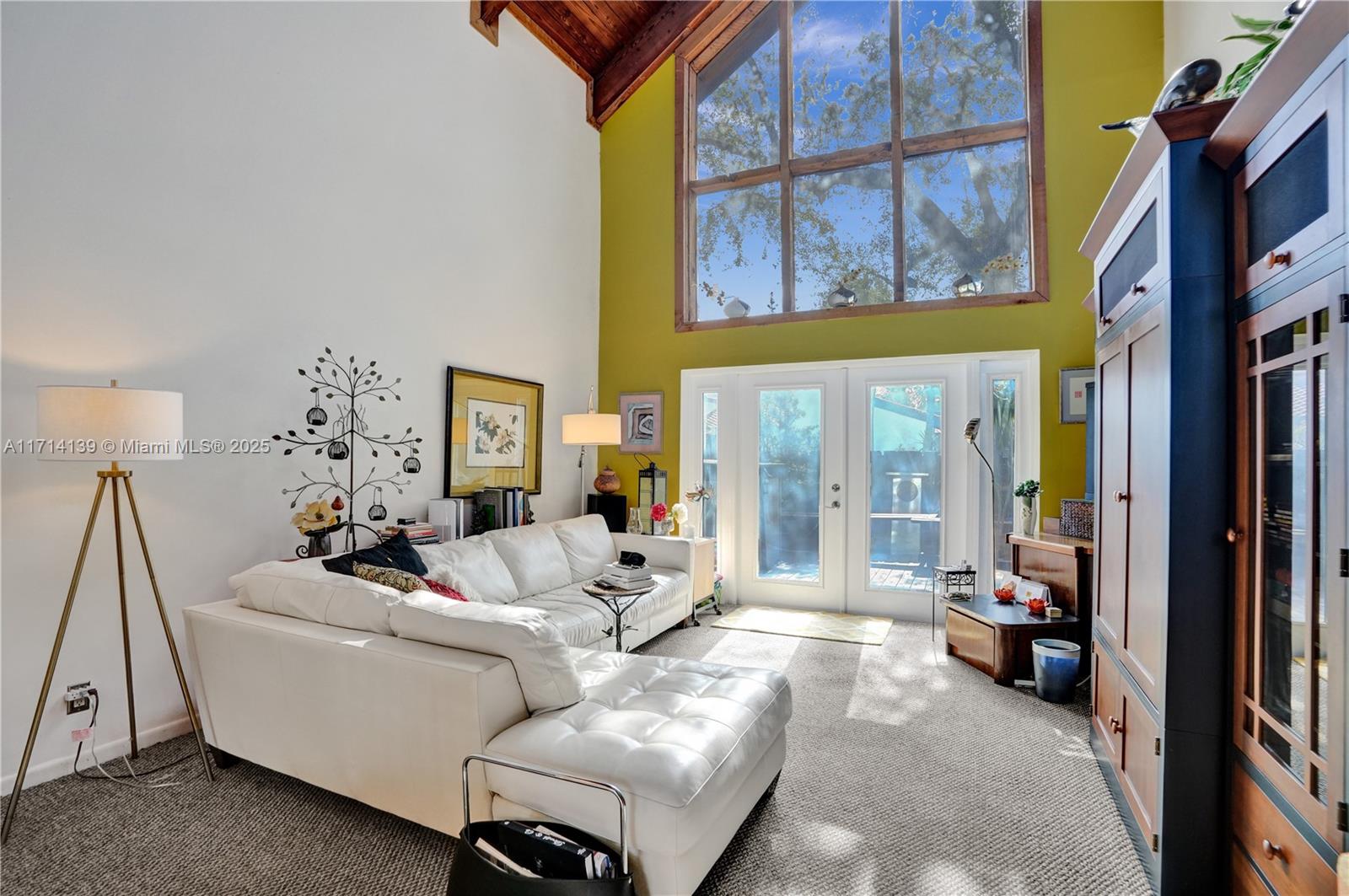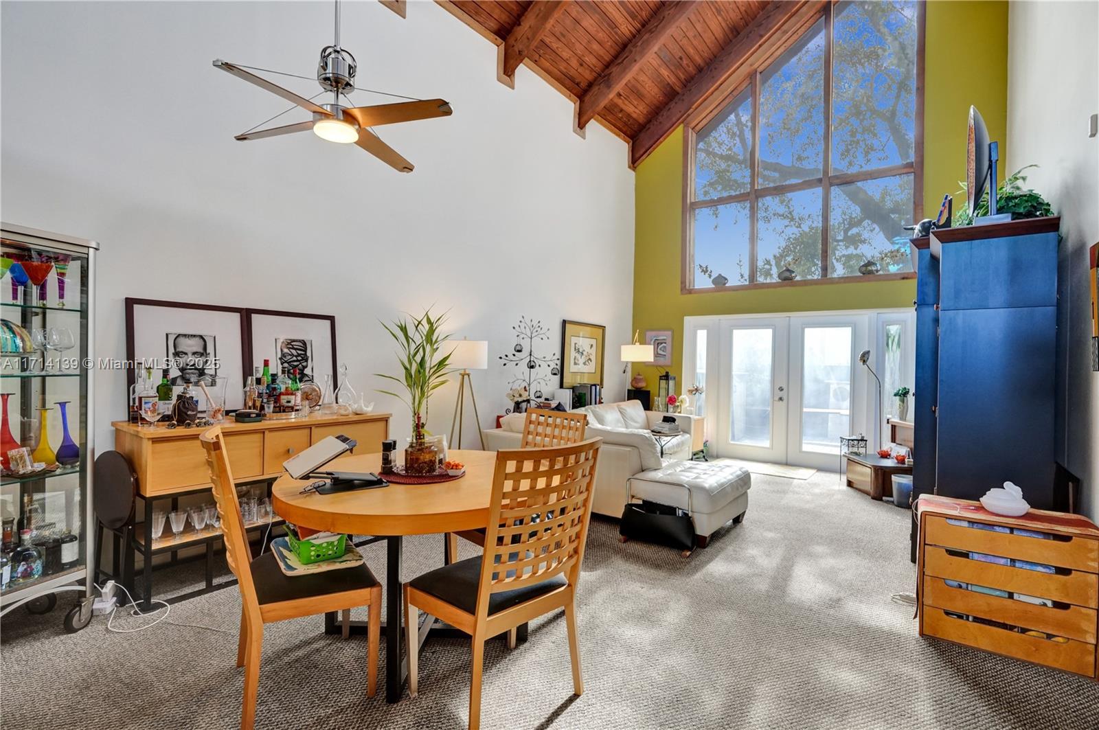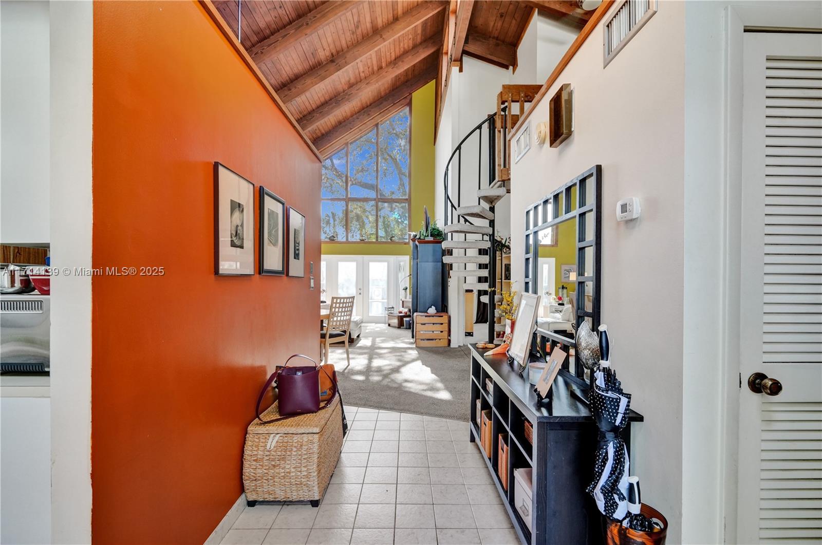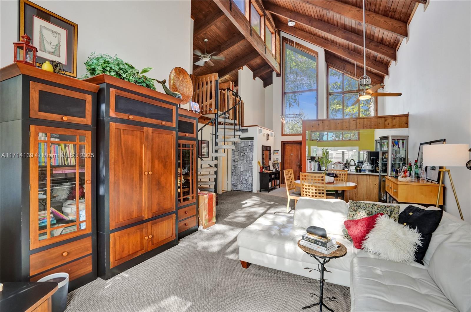 Light and bright, this 3 bed, 2.5 bath chalet style home is waiting for you! Enjoy an open concept floor plan with beautiful 29’ soaring vaulted ceilings, exposed wood beams and natural light in abundance. The owner’s suite with large walk-in closet is located on the 1st floor, along with a guest bedroom and full guest bathroom. The spiral staircase leads up to the 3rd bedroom and 1/2 bathroom. Outside, find a fenced (2024) private deck perfect for lounging or enjoy the community pool just steps away. Your comfort & energy efficiency are further enhanced with newer A/Cs from 2019 & 2023 and newer water heater (2019)! Ideally located in the heart of Plantation inside the Jacaranda Country Club in a private enclave of 20 homes, near top-rated schools, shopping, dining, parks, highways & more