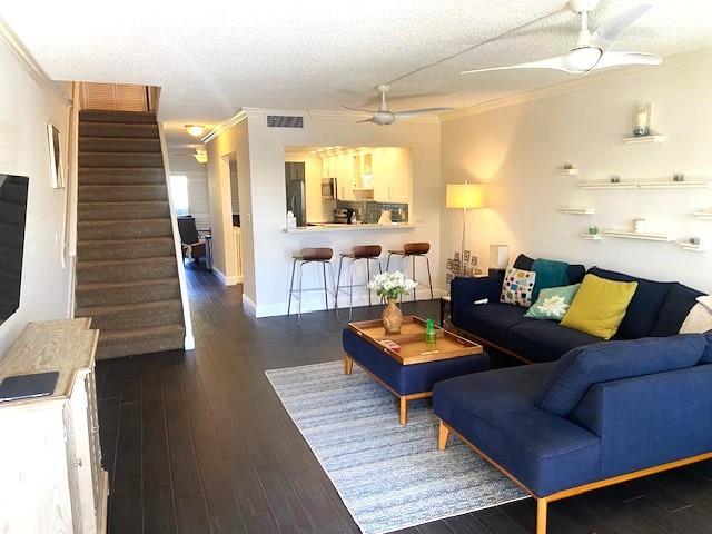 What a location!!! Right off Bayview, with all the feels of a single family neighborhood. Enter this move-in ready, fully furnished unit through the travertine tiled front patio, you are greeted by the expansive and open Living Room/Kitchen/Stairway, viewing all the way through the kitchen and dining room, to the back patio by the pool. The freshly painted, and Beautifully updated kitchen/dining room with matching cabinetry throughout, creates the perfect flow through the entire first floor, great for entertaining. Warm tile flooring throughout the lower level. Kitchen has under-counter full sized washer and dryer, SS Appliances, and granite countertops. There is a powder room on the main level, perfect for your guest, while both bedrooms on the upper level have their own full bathrooms.