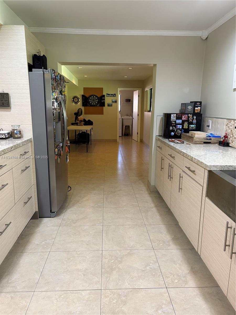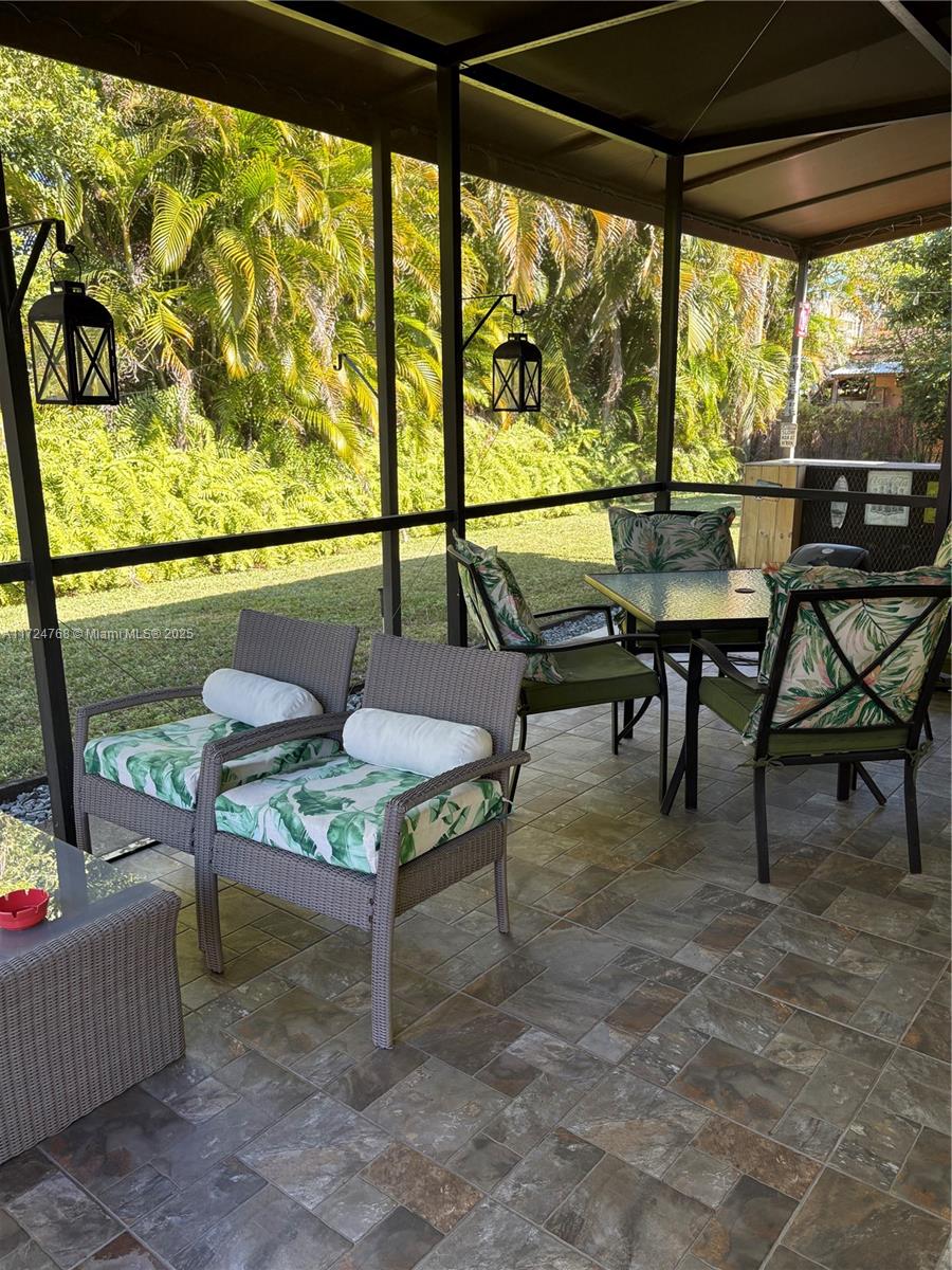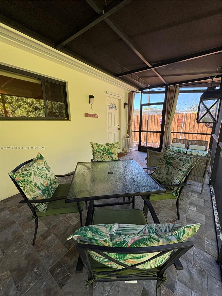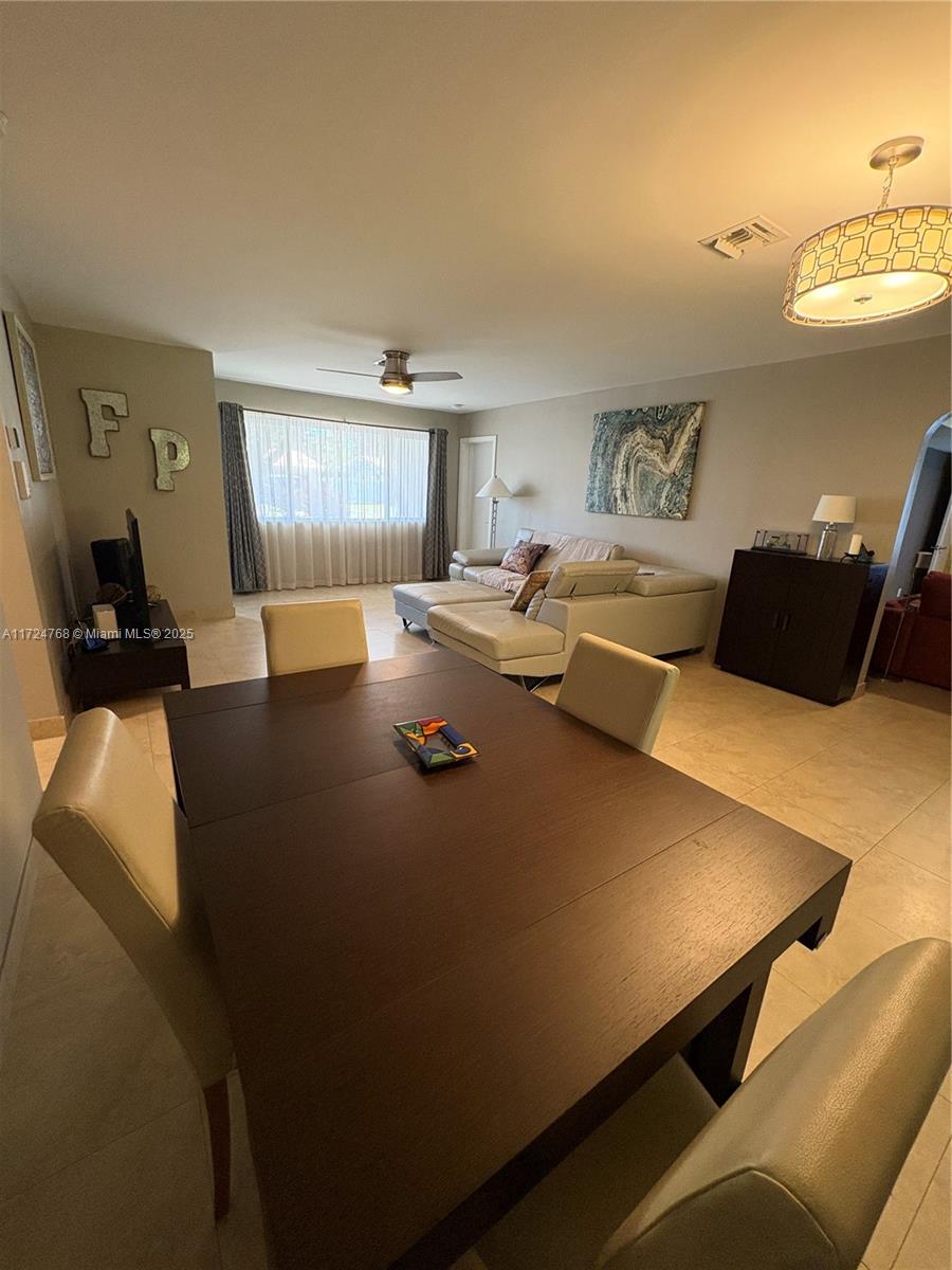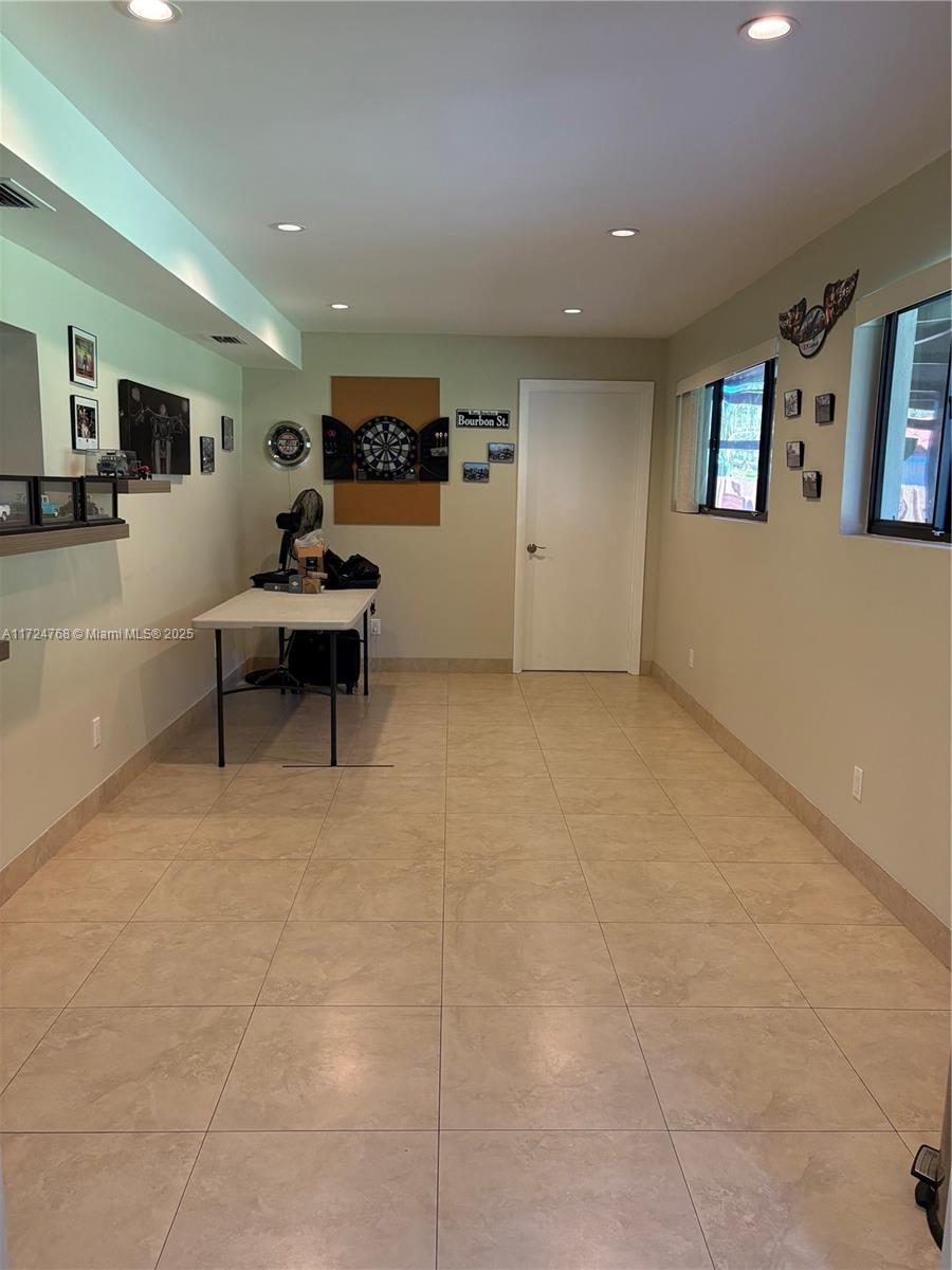 This stunning 3 bedroom with 2 and a half bathroom home offers an open split floor plan with elegant floors throughout. The oversized kitchen features quartz countertops, stainless steel appliances, and high-end wood cabinetry. Enjoy a huge family room, formal dining room, and a versatile media room that can serve as a fourth bedroom. The hurricane-impact windows and garage door provide added security. Relax in the private backyard, complete with a tiled screened porch, outdoor kitchen, and lush banana and avocado trees. Located just minutes from the beach and Gulfstream Park, this home combines comfort, style, and convenience.