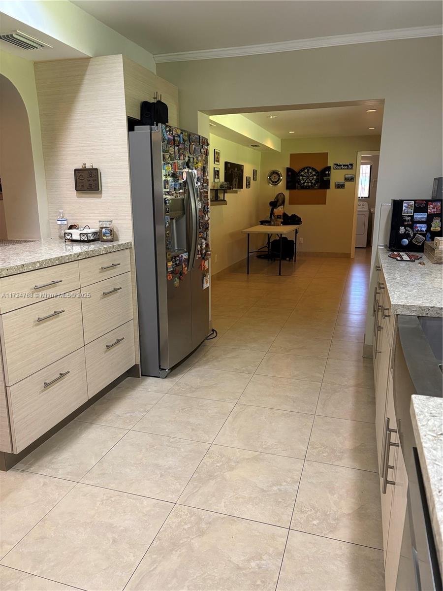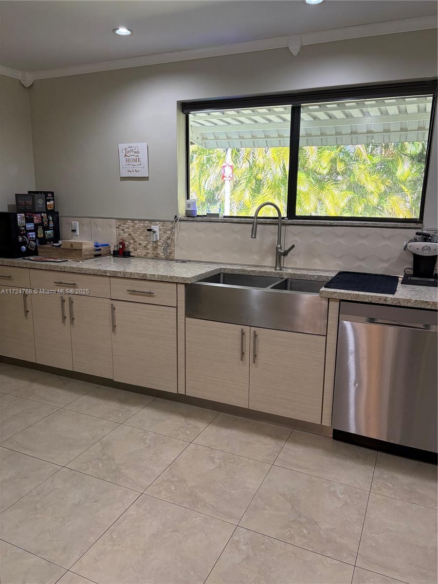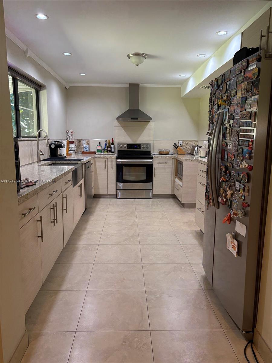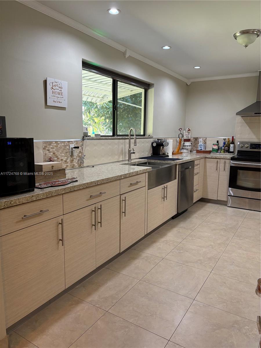 This stunning 3 bedroom with 2 and a half bathroom home offers an open split floor plan with elegant floors throughout. The oversized kitchen features quartz countertops, stainless steel appliances, and high-end wood cabinetry. Enjoy a huge family room, formal dining room, and a versatile media room that can serve as a fourth bedroom. The hurricane-impact windows and garage door provide added security. Relax in the private backyard, complete with a tiled screened porch, outdoor kitchen, and lush banana and avocado trees. Located just minutes from the beach and Gulfstream Park, this home combines comfort, style, and convenience.