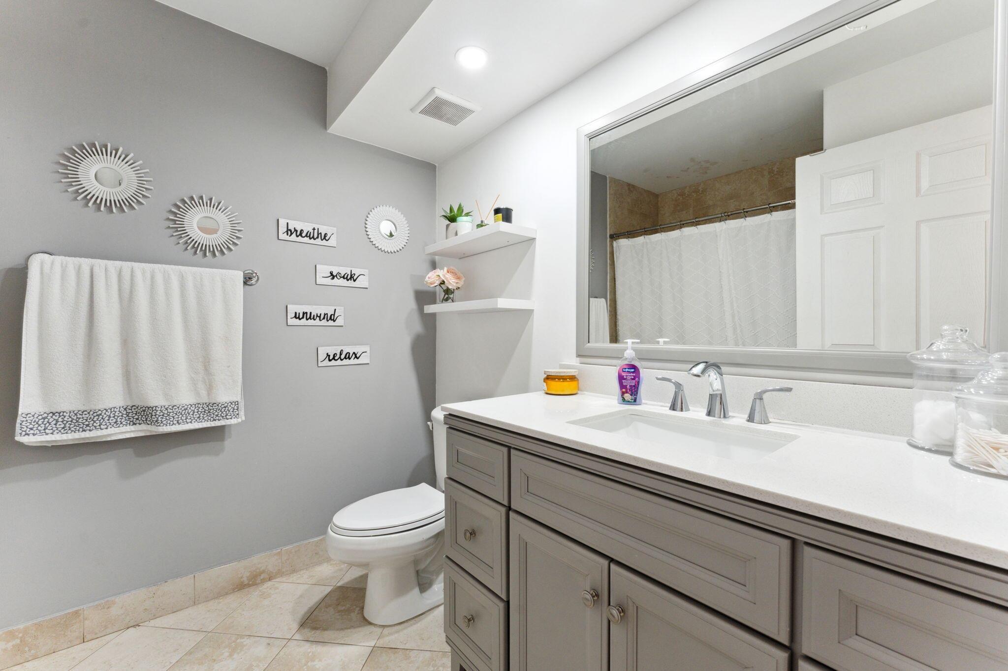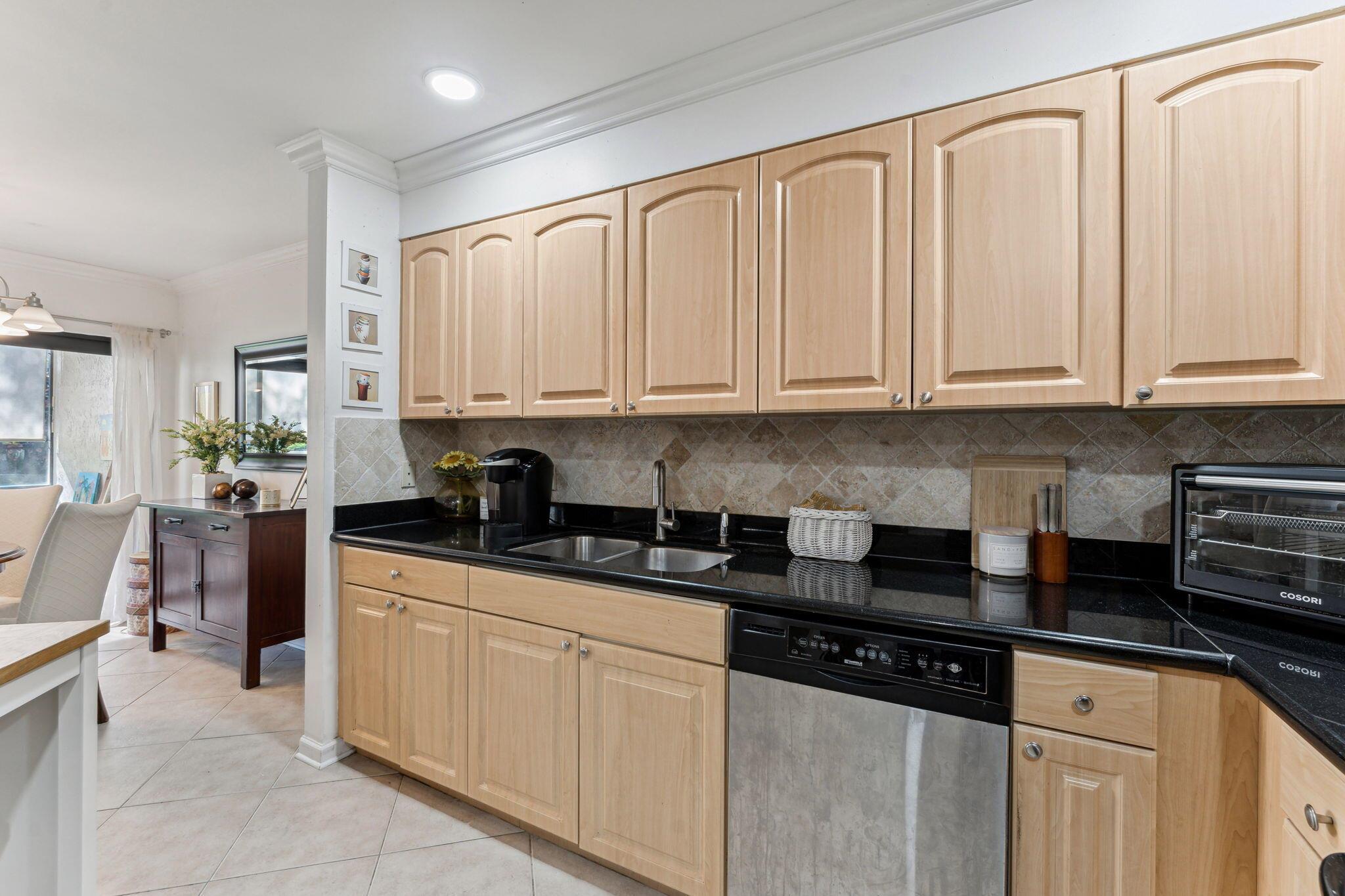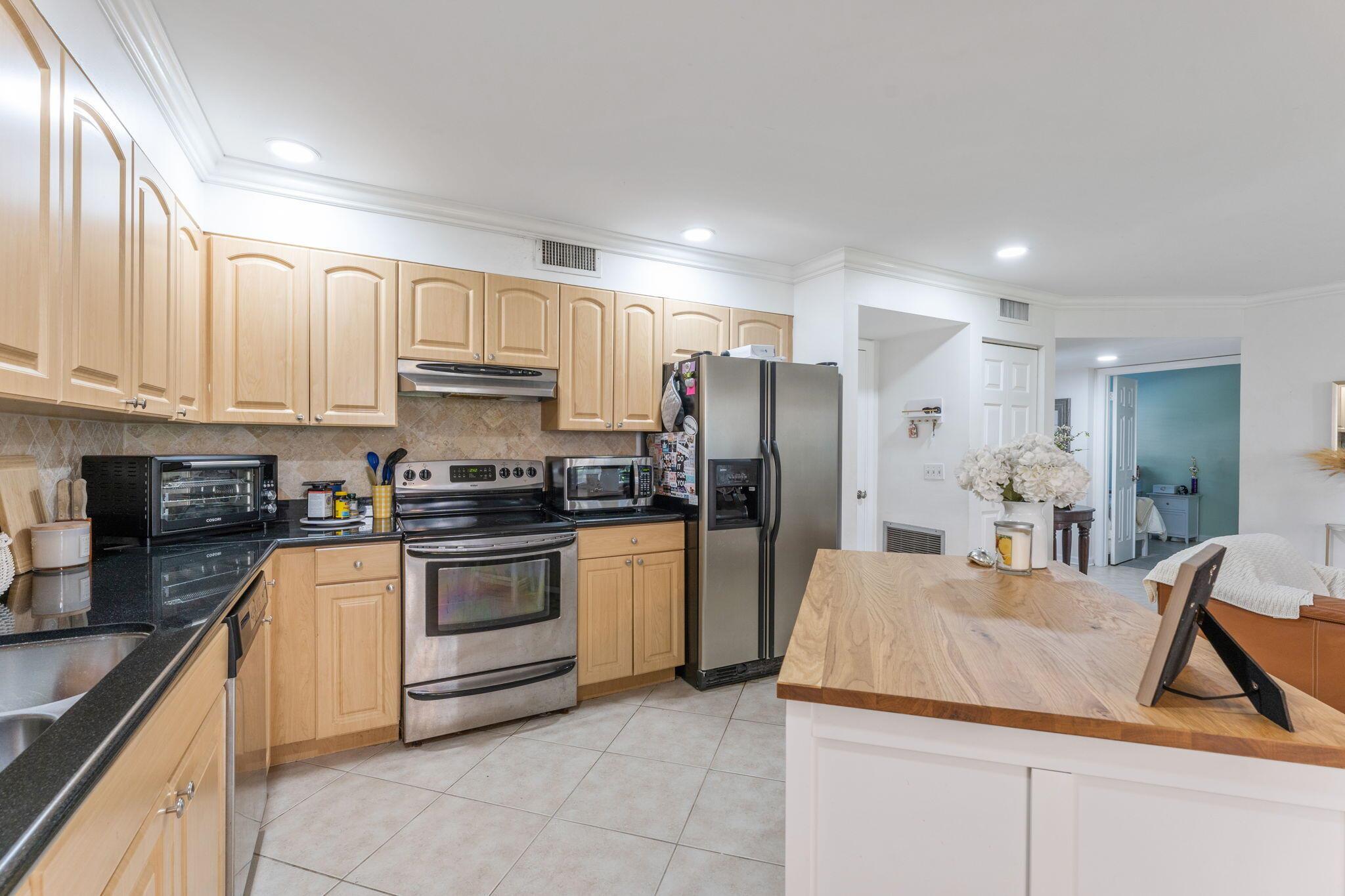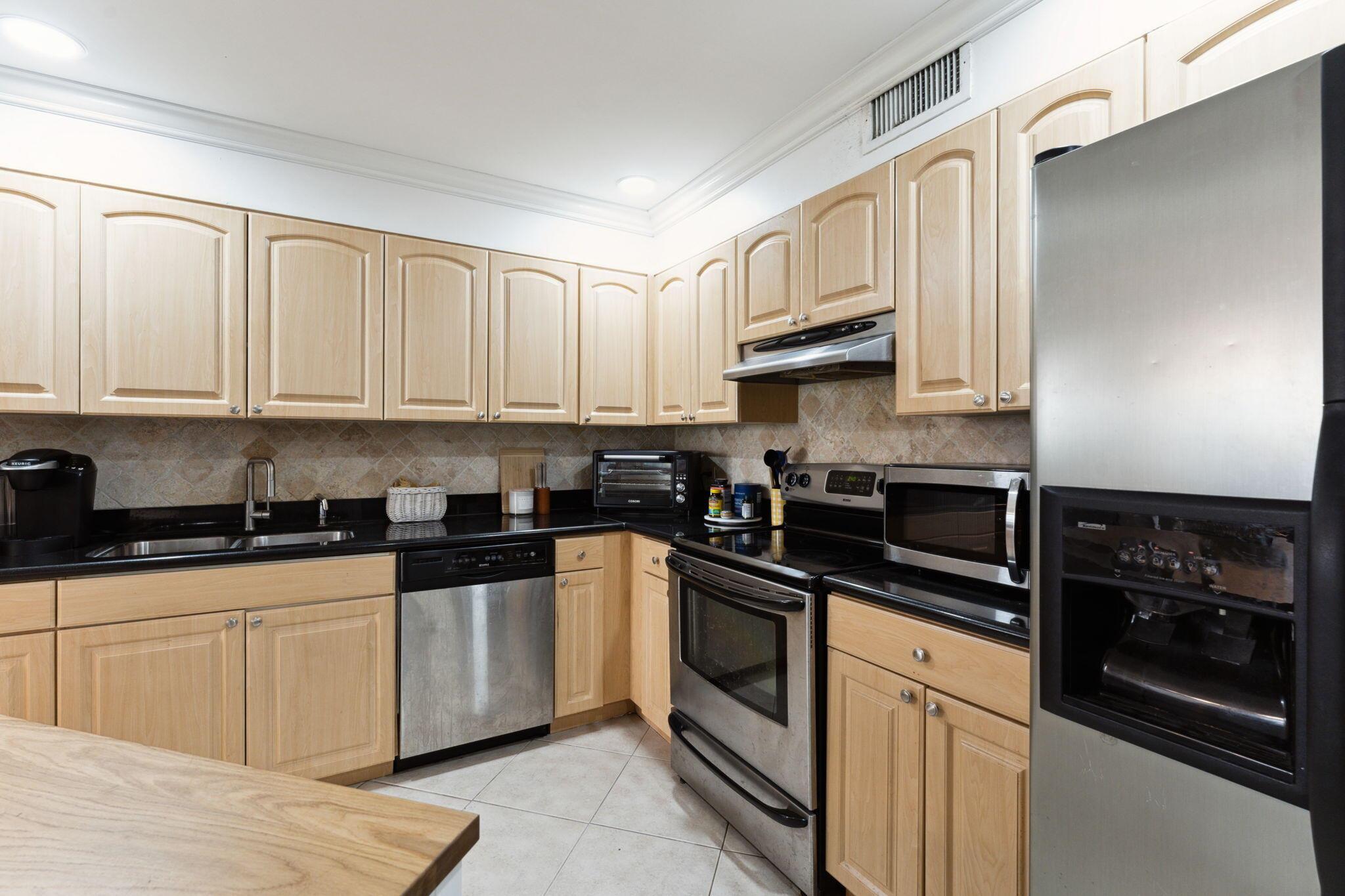 Updated 1st floor coach home in central Boca Raton! Tile throughout, crown moldings, and LED lights. Kitchen features granite counters and stainless steel appliances. The original kitchen wall has been removed to make this home spacious and open. All of the sliders are hurricane impact and lead out to a large screened patio. A/C new in 2020! Great schools and central location to FAU, highways, beaches and Town Center Mall!