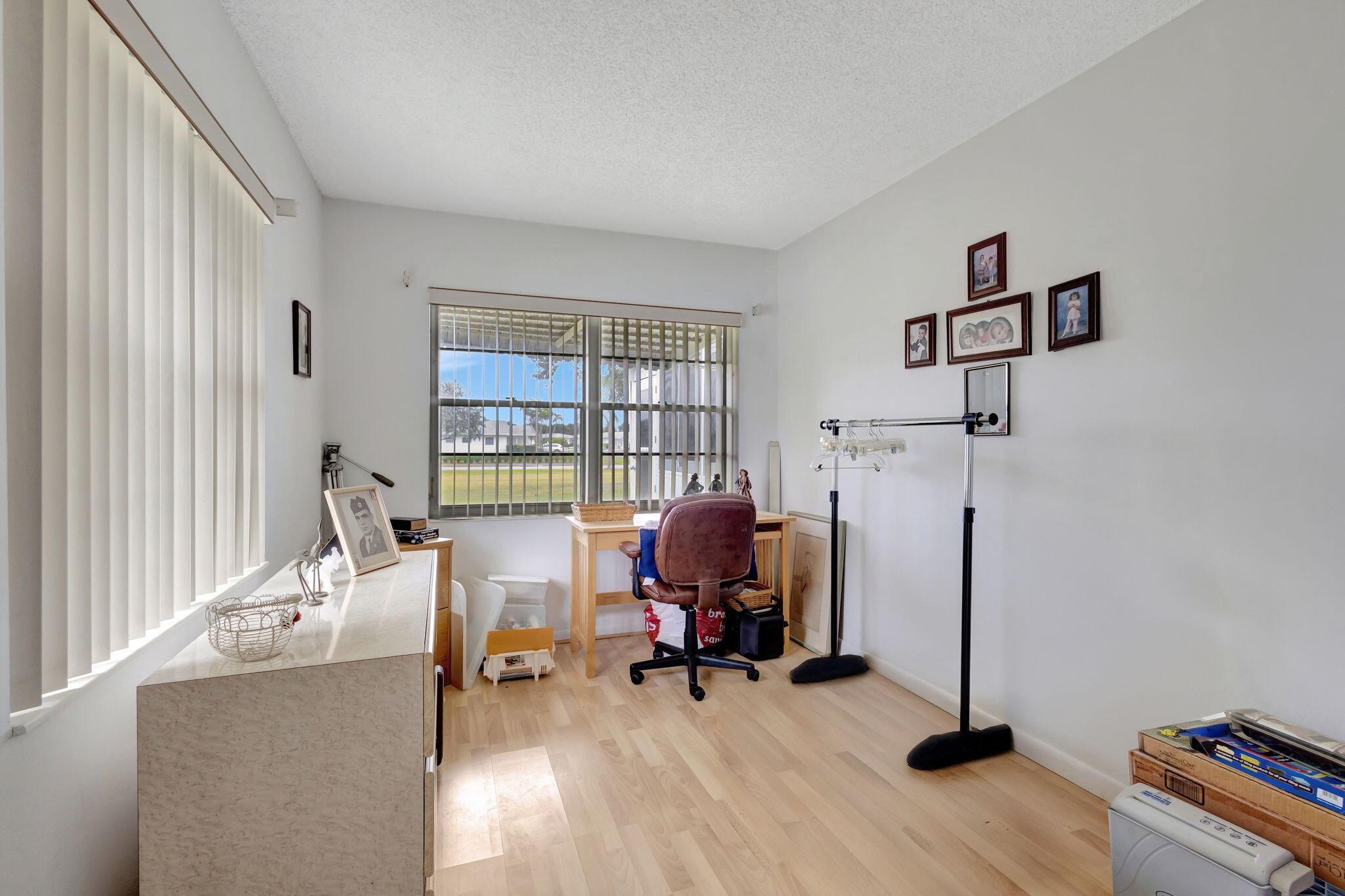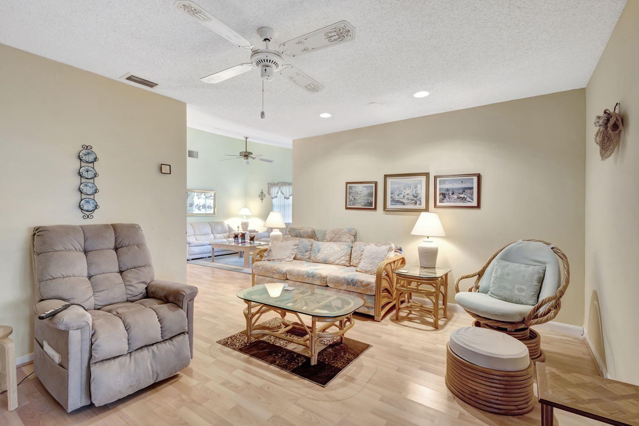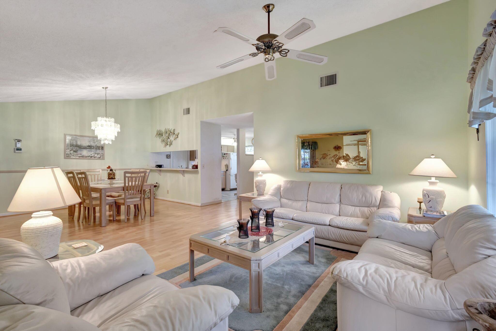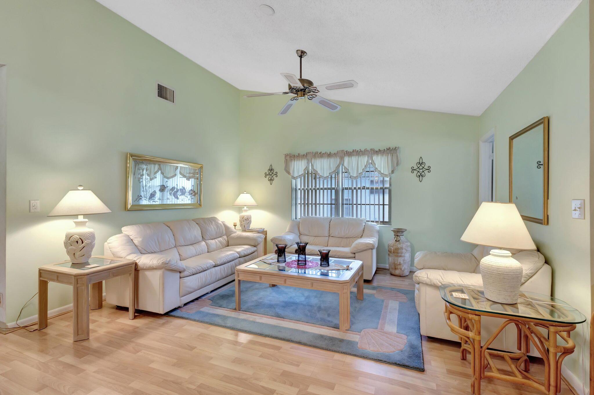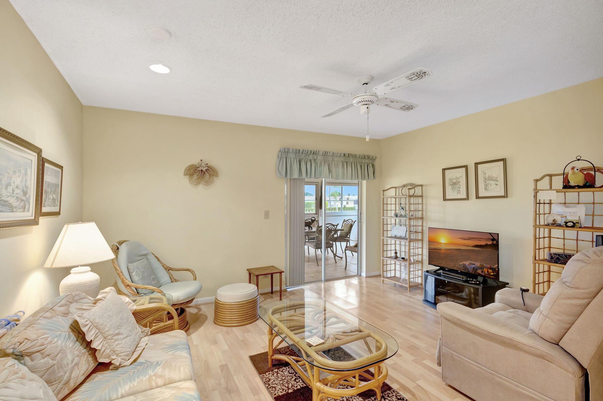 Spacious & bright.! Split bedrooms, 2 full baths, area dining room, laminate flooring, tile in baths. Office with 2 windows. Large screened/windowed patio w/view of golf course. Lake breezes from the east. Newer stove top & refrigerator. A/C system approx. 2016. Newer hot water heater.Laundry sink in gar., Maytag w/dryer. Htd. commuity pool, hot tub; also gym & sauna for men & women. Centrally located - Close to Publix, post office, restaurants, I-95, Turnpike, PBIA air port & more.