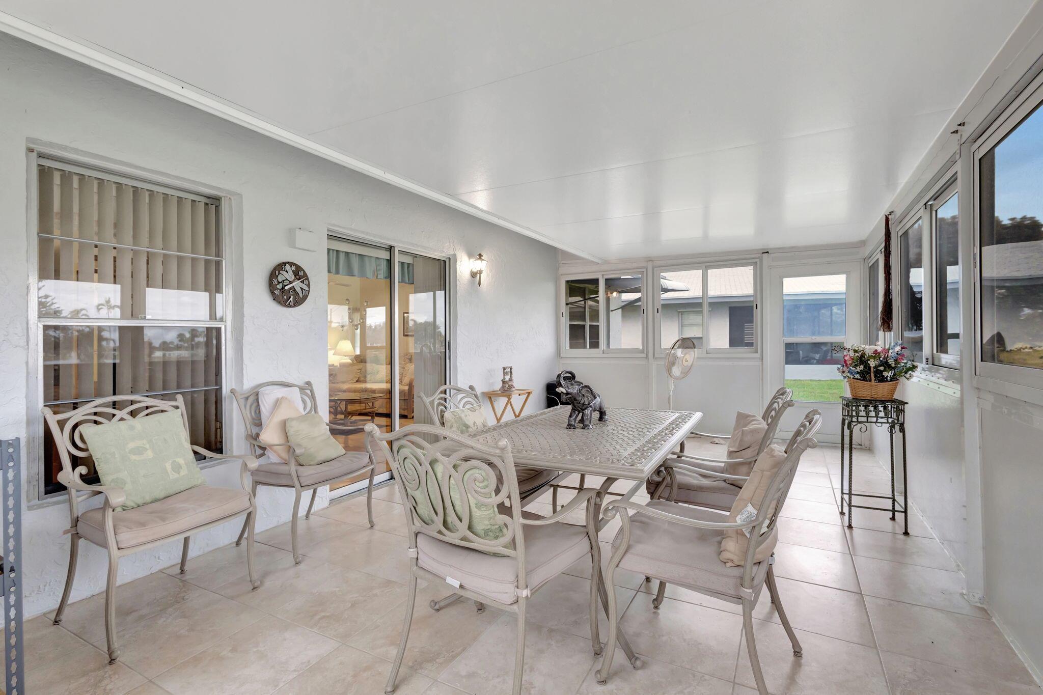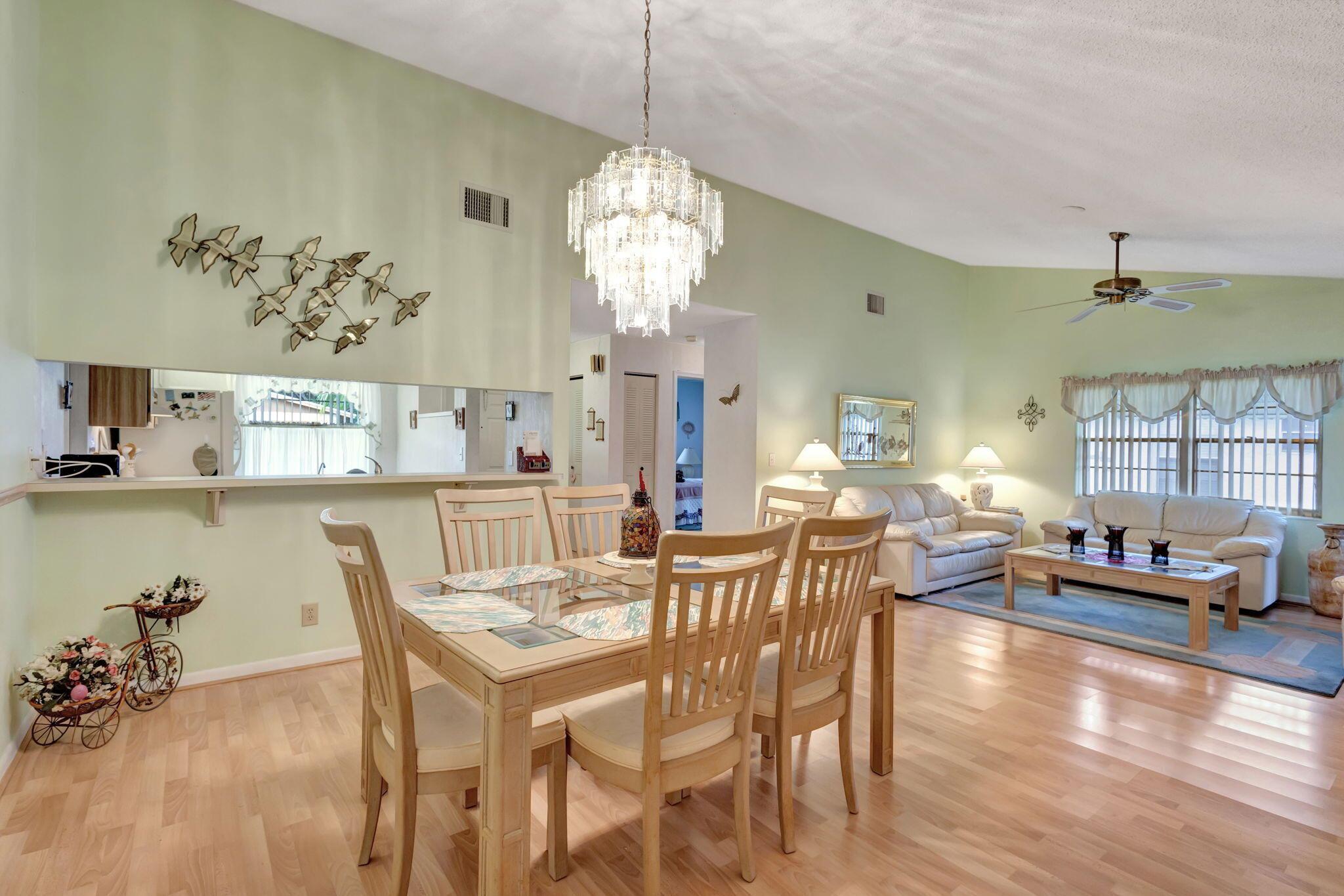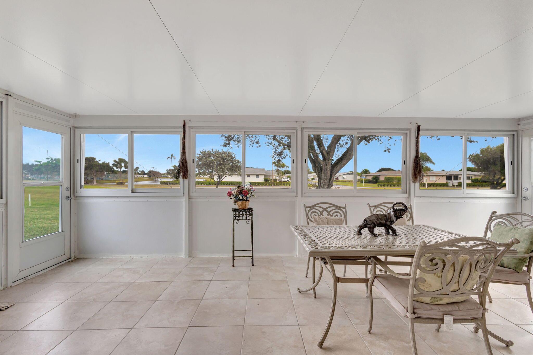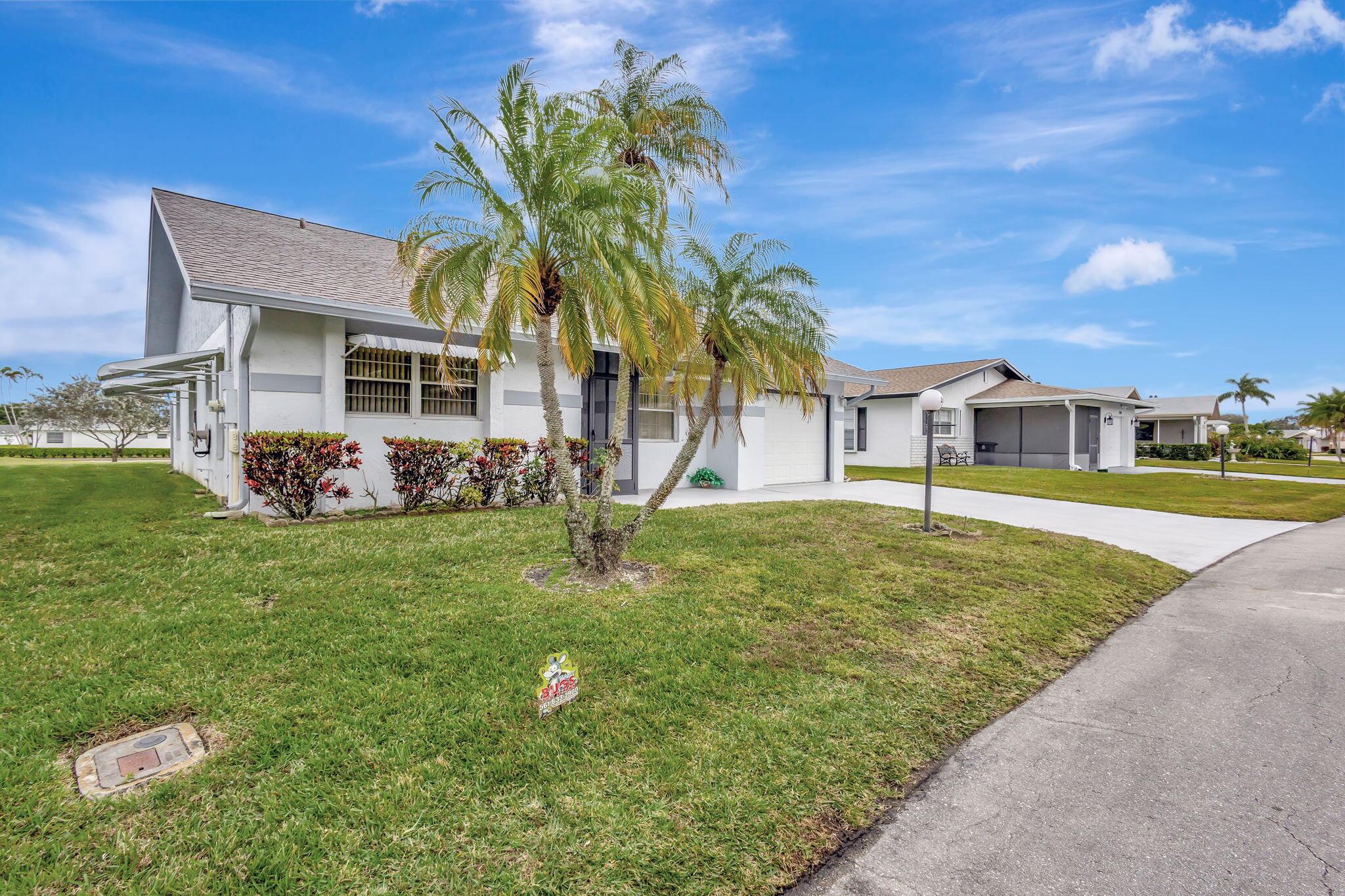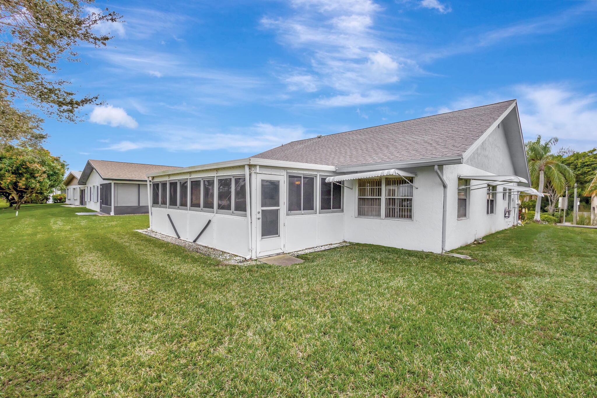 Spacious & bright.! Split bedrooms, 2 full baths, area dining room, laminate flooring, tile in baths. Office with 2 windows. Large screened/windowed patio w/view of golf course. Lake breezes from the east. Newer stove top & refrigerator. A/C system approx. 2016. Newer hot water heater.Laundry sink in gar., Maytag w/dryer. Htd. commuity pool, hot tub; also gym & sauna for men & women. Centrally located - Close to Publix, post office, restaurants, I-95, Turnpike, PBIA air port & more.