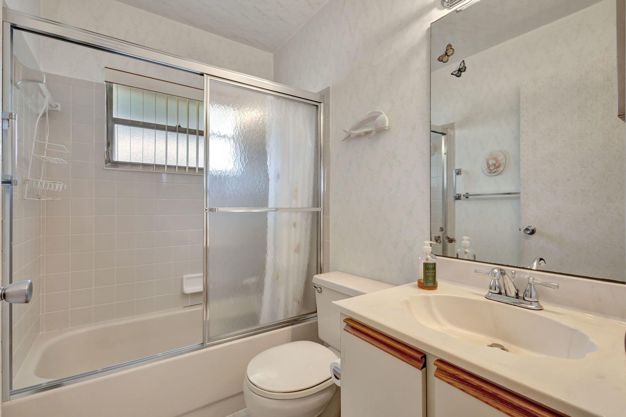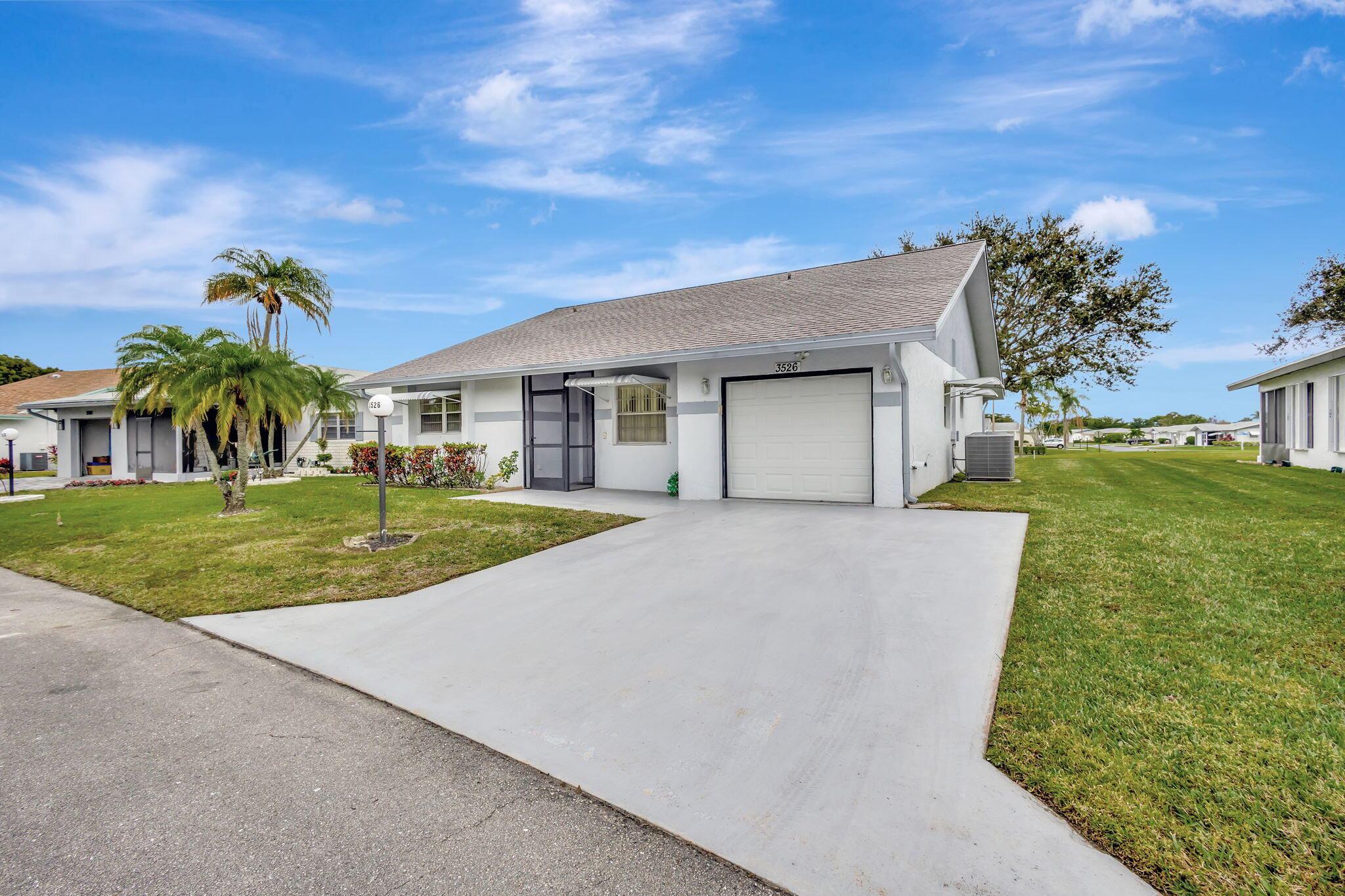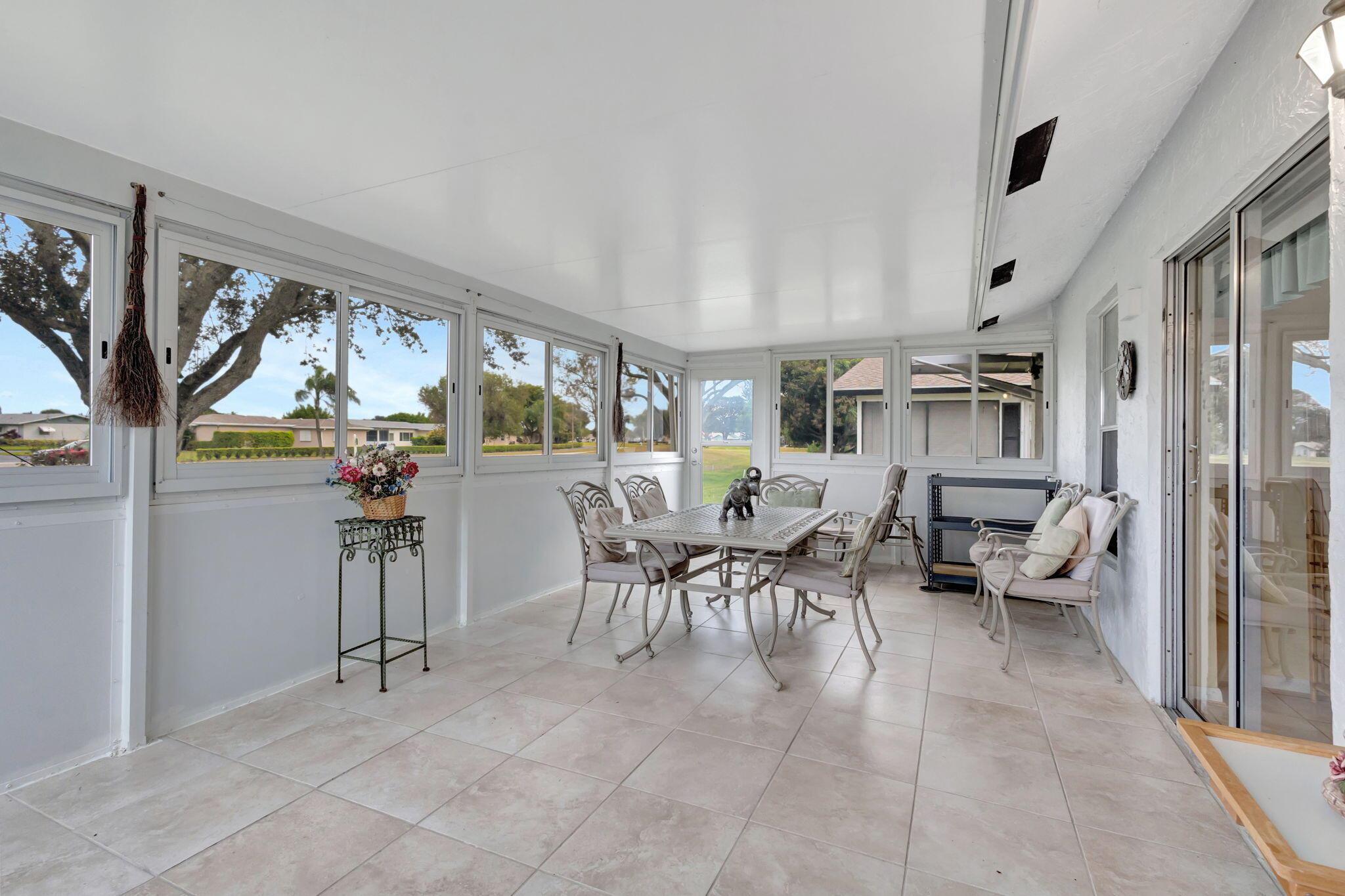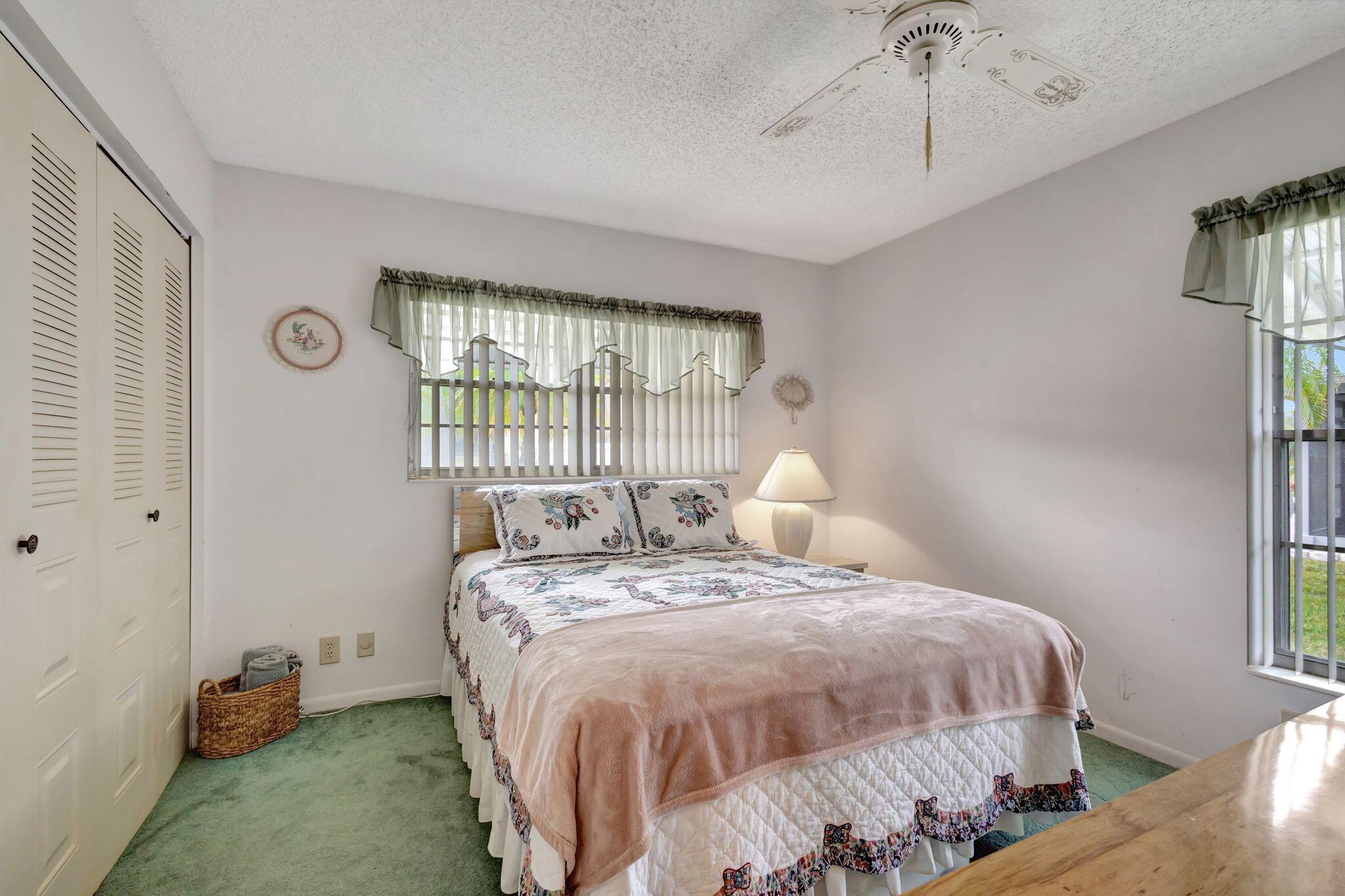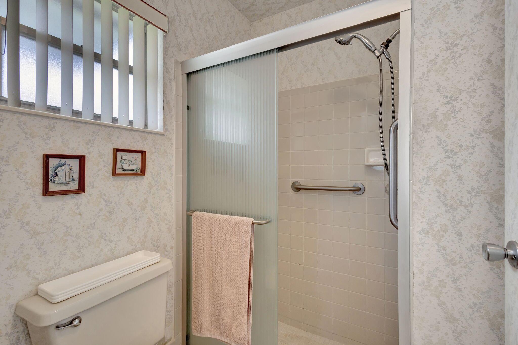 Spacious & bright.! Split bedrooms, 2 full baths, area dining room, laminate flooring, tile in baths. Office with 2 windows. Large screened/windowed patio w/view of golf course. Lake breezes from the east. Newer stove top & refrigerator. A/C system approx. 2016. Newer hot water heater.Laundry sink in gar., Maytag w/dryer. Htd. commuity pool, hot tub; also gym & sauna for men & women. Centrally located - Close to Publix, post office, restaurants, I-95, Turnpike, PBIA air port & more.