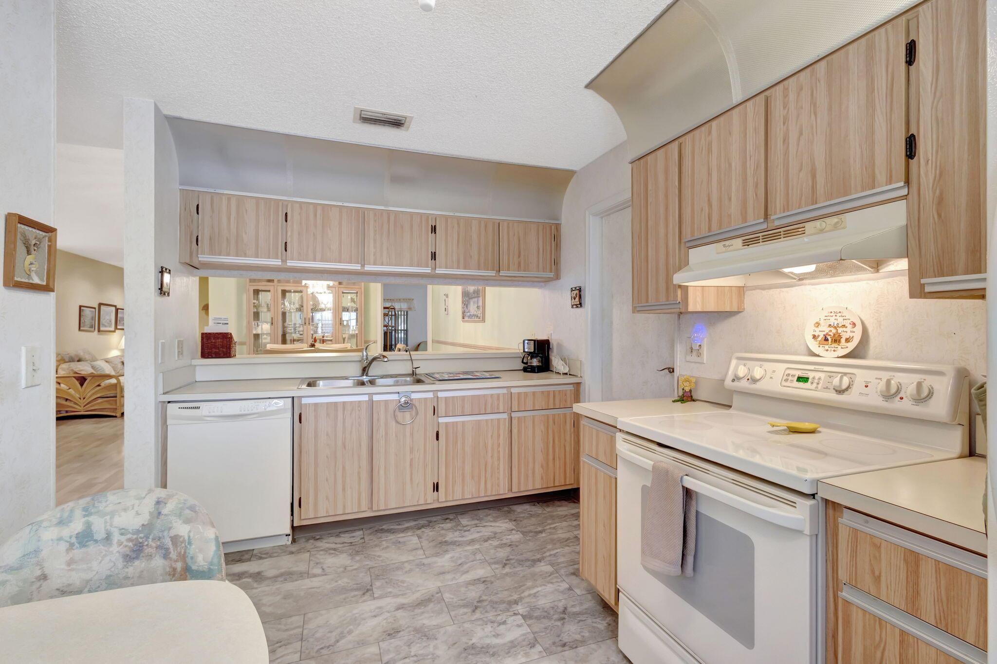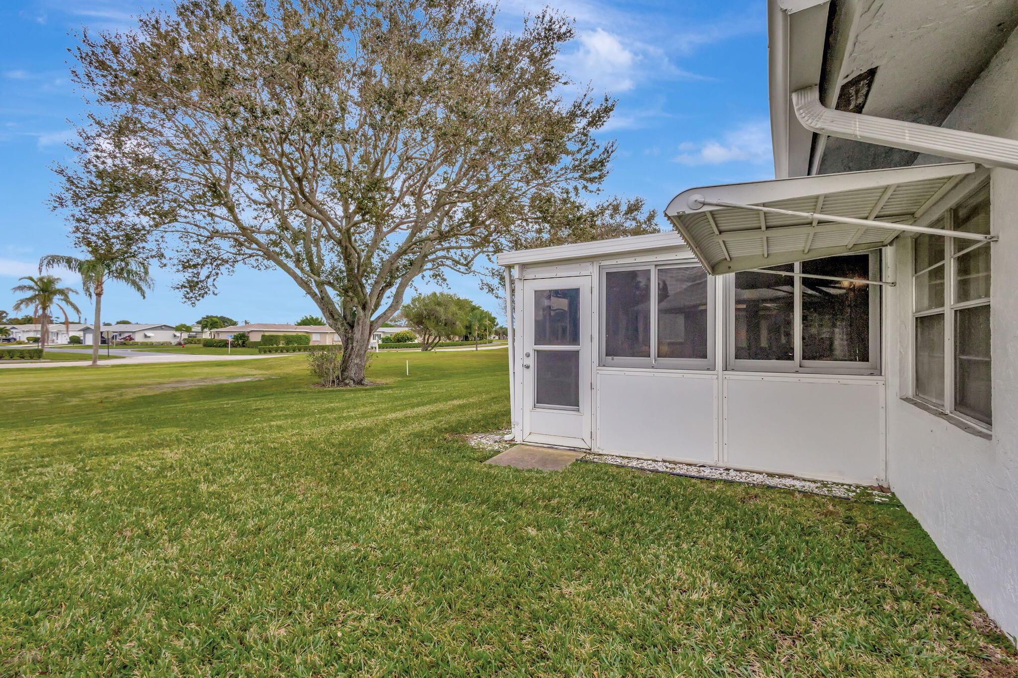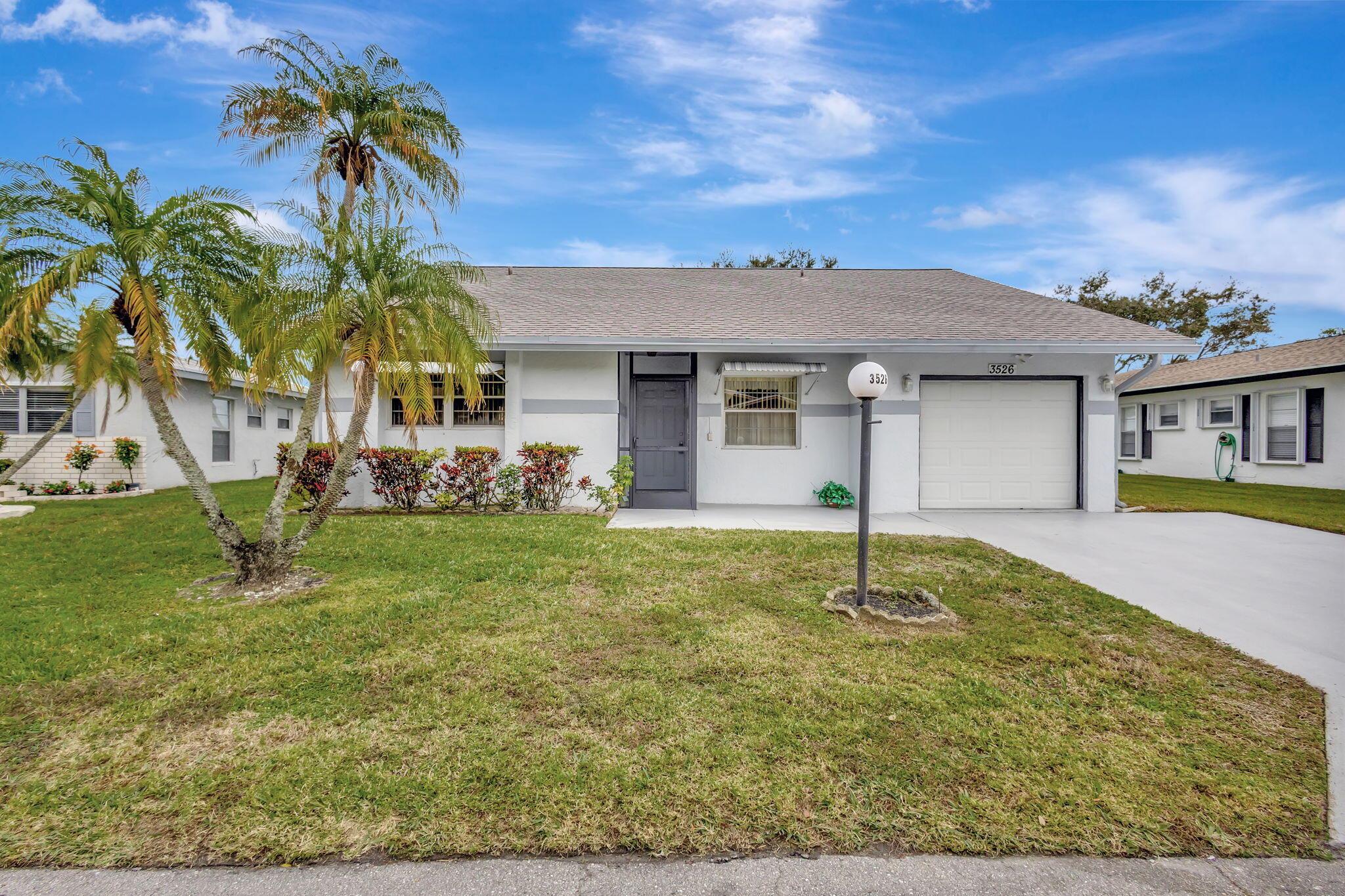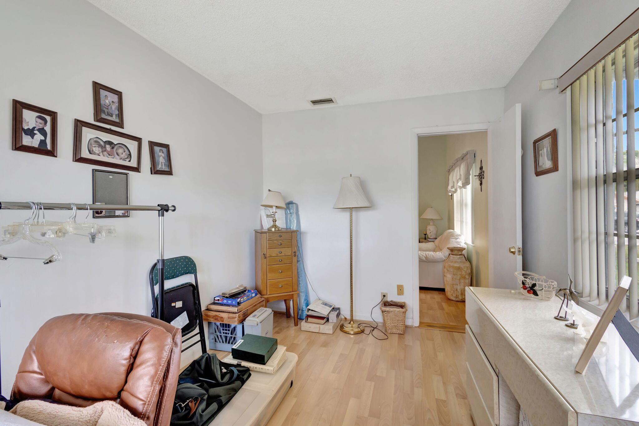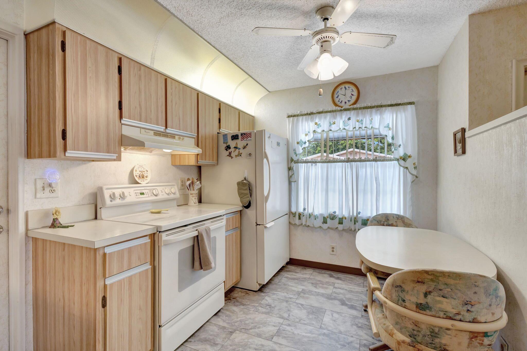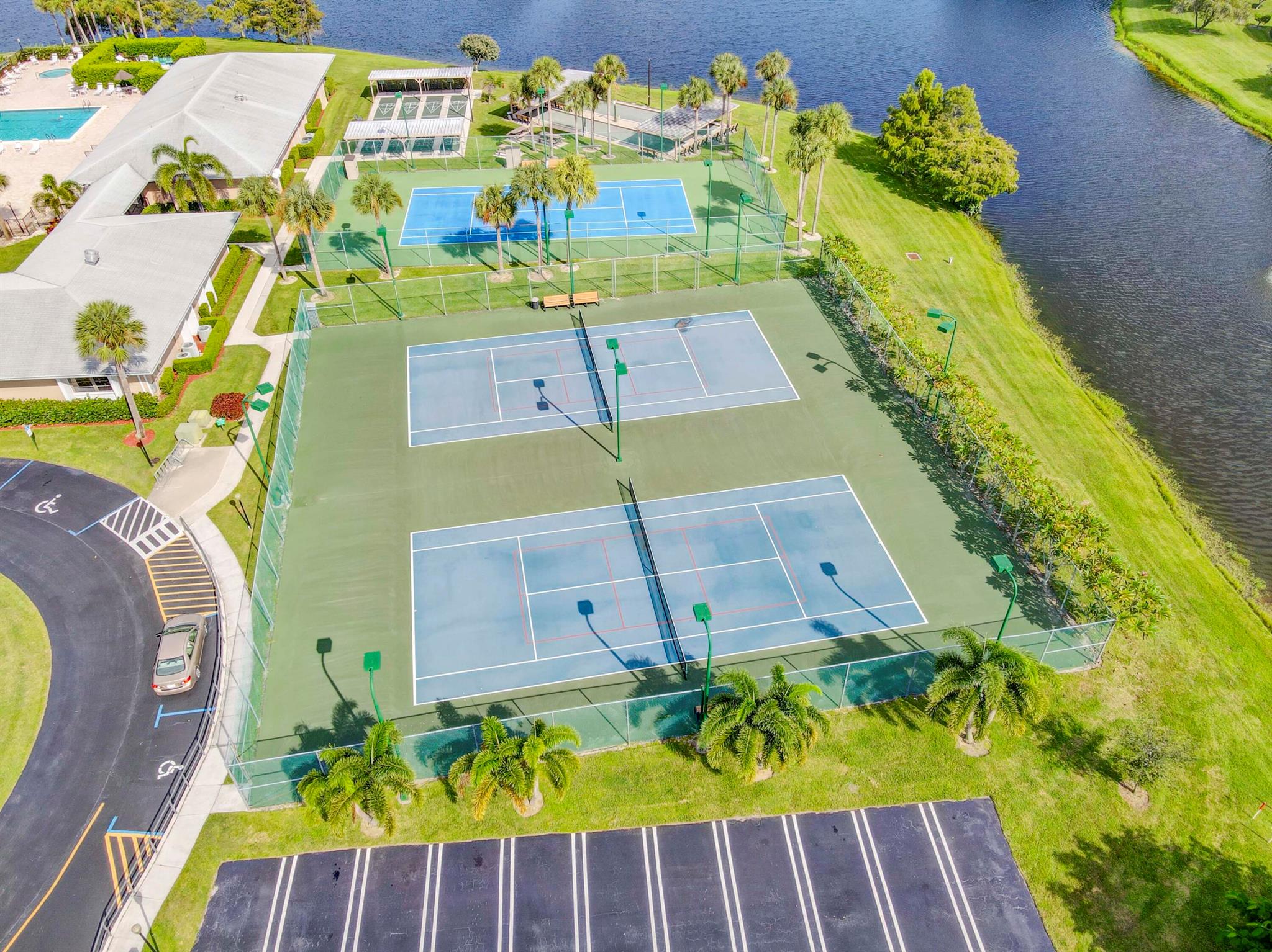 Spacious & bright.! Split bedrooms, 2 full baths, area dining room, laminate flooring, tile in baths. Office with 2 windows. Large screened/windowed patio w/view of golf course. Lake breezes from the east. Newer stove top & refrigerator. A/C system approx. 2016. Newer hot water heater.Laundry sink in gar., Maytag w/dryer. Htd. commuity pool, hot tub; also gym & sauna for men & women. Centrally located - Close to Publix, post office, restaurants, I-95, Turnpike, PBIA air port & more.