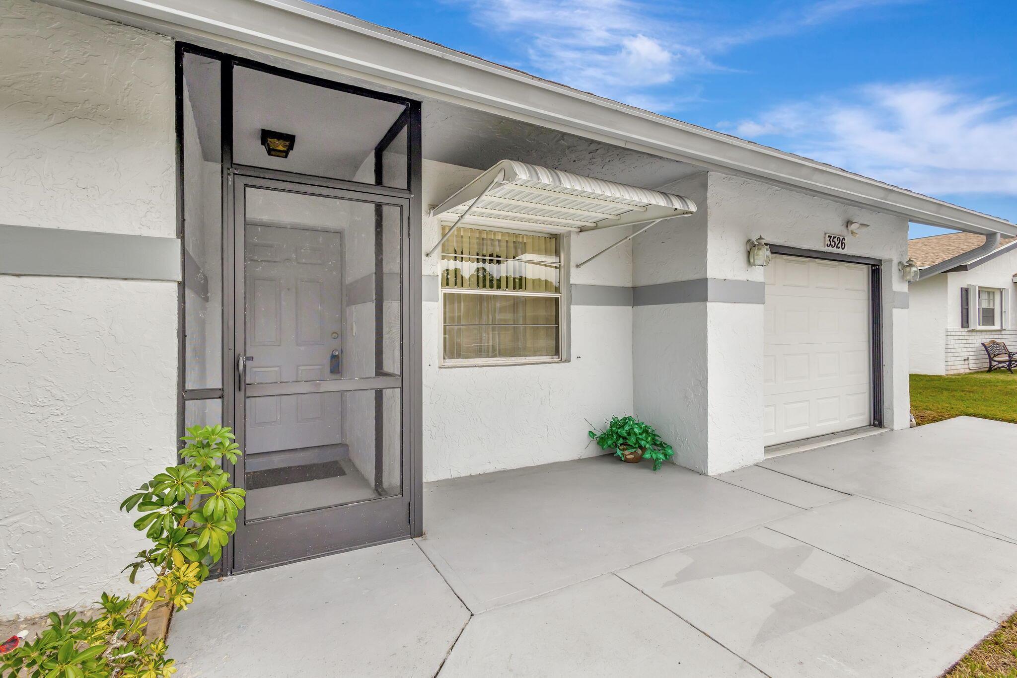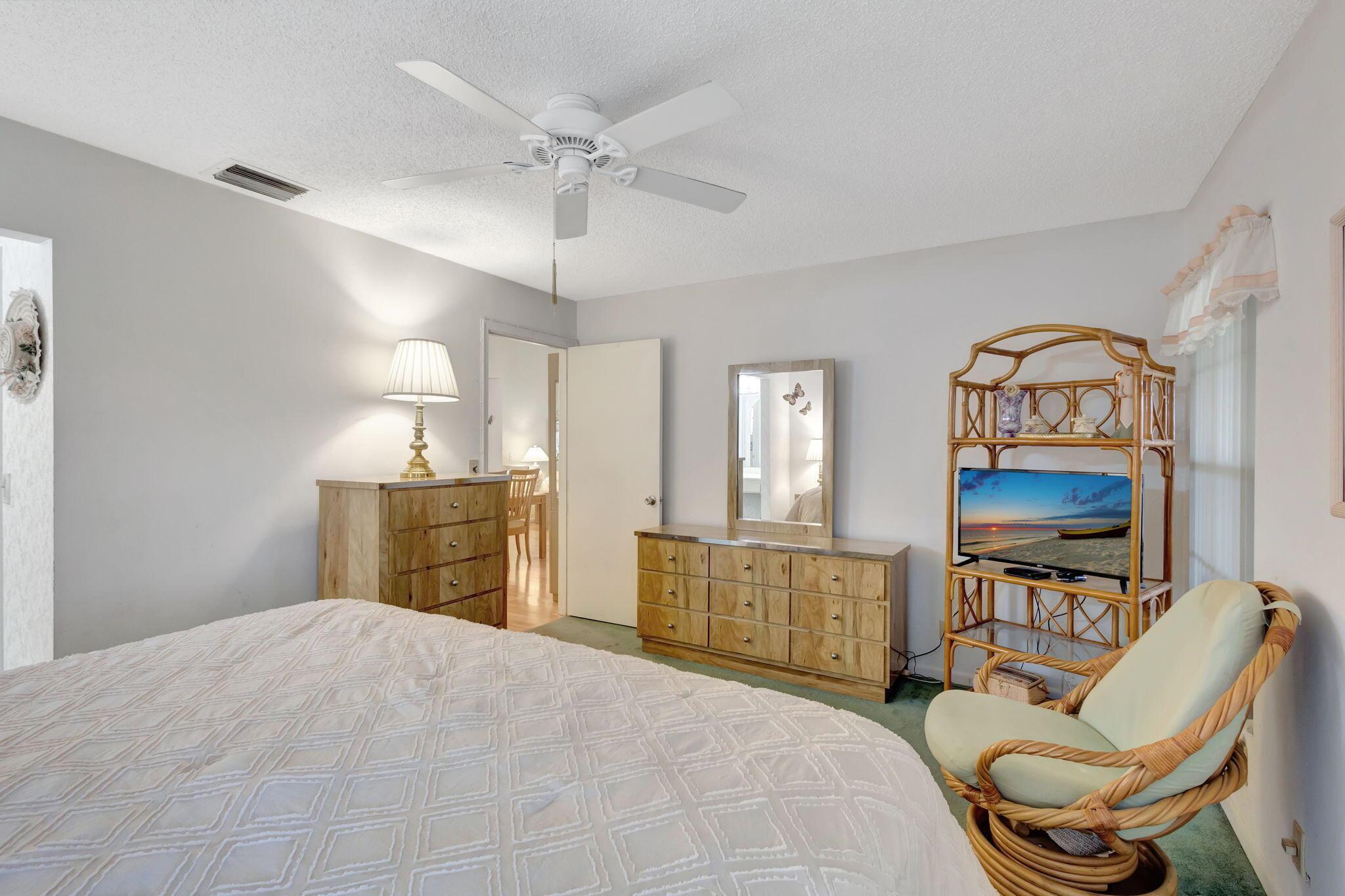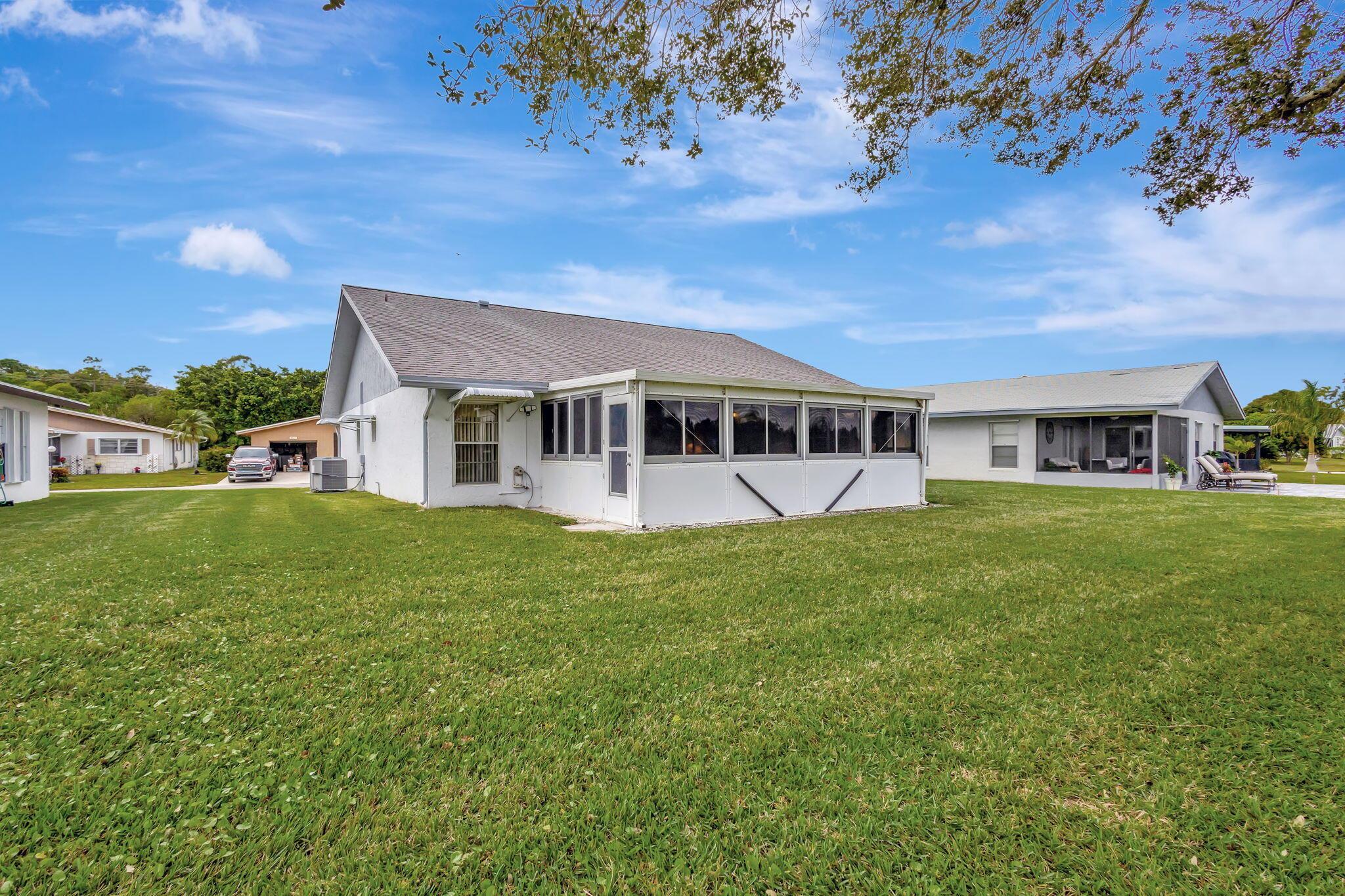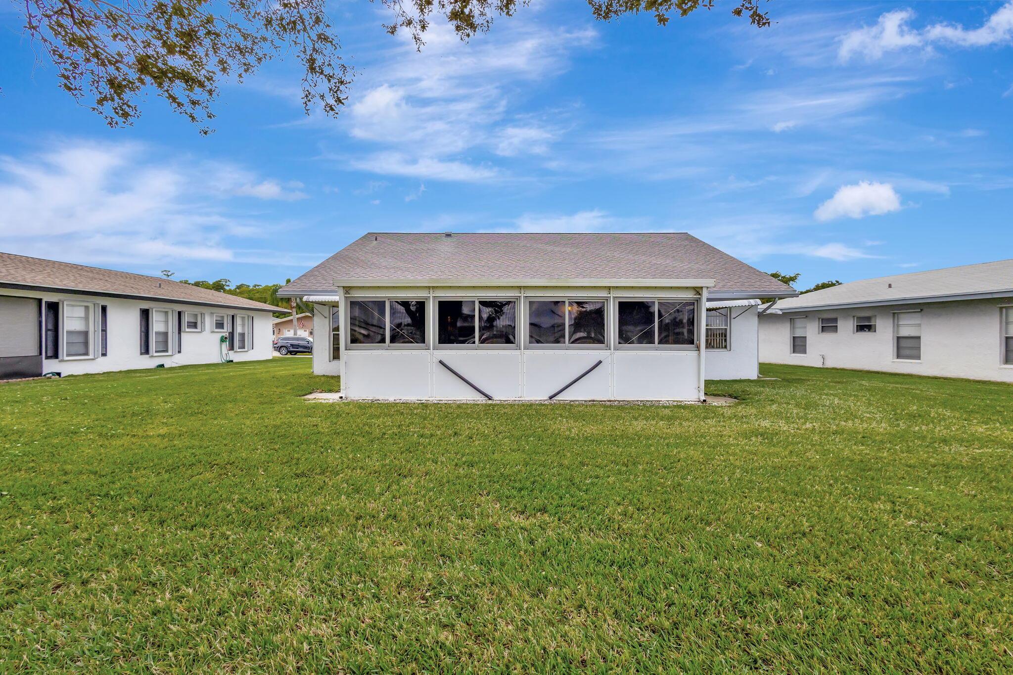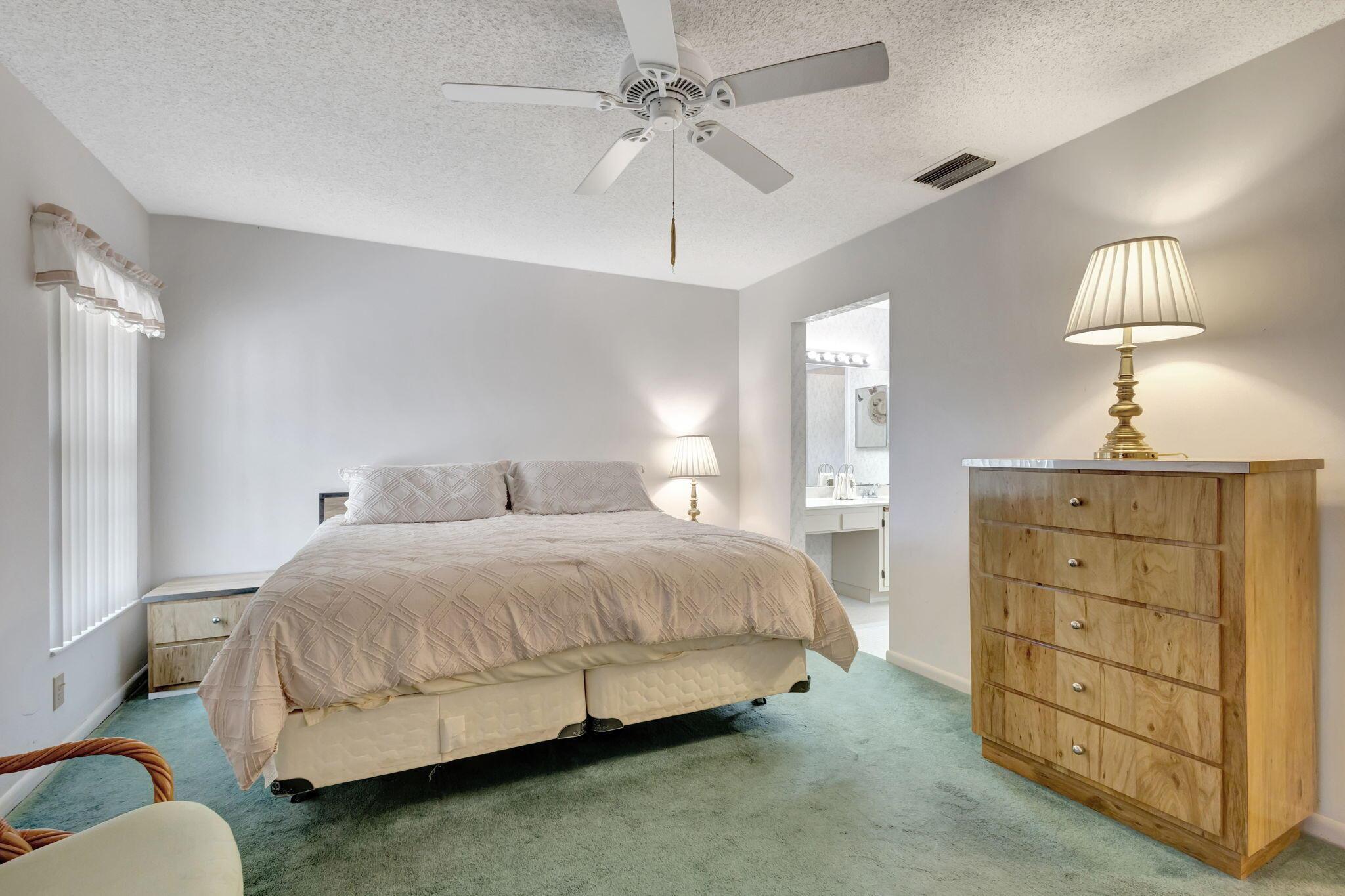 Spacious & bright.! Split bedrooms, 2 full baths, area dining room, laminate flooring, tile in baths. Office with 2 windows. Large screened/windowed patio w/view of golf course. Lake breezes from the east. Newer stove top & refrigerator. A/C system approx. 2016. Newer hot water heater.Laundry sink in gar., Maytag w/dryer. Htd. commuity pool, hot tub; also gym & sauna for men & women. Centrally located - Close to Publix, post office, restaurants, I-95, Turnpike, PBIA air port & more.
