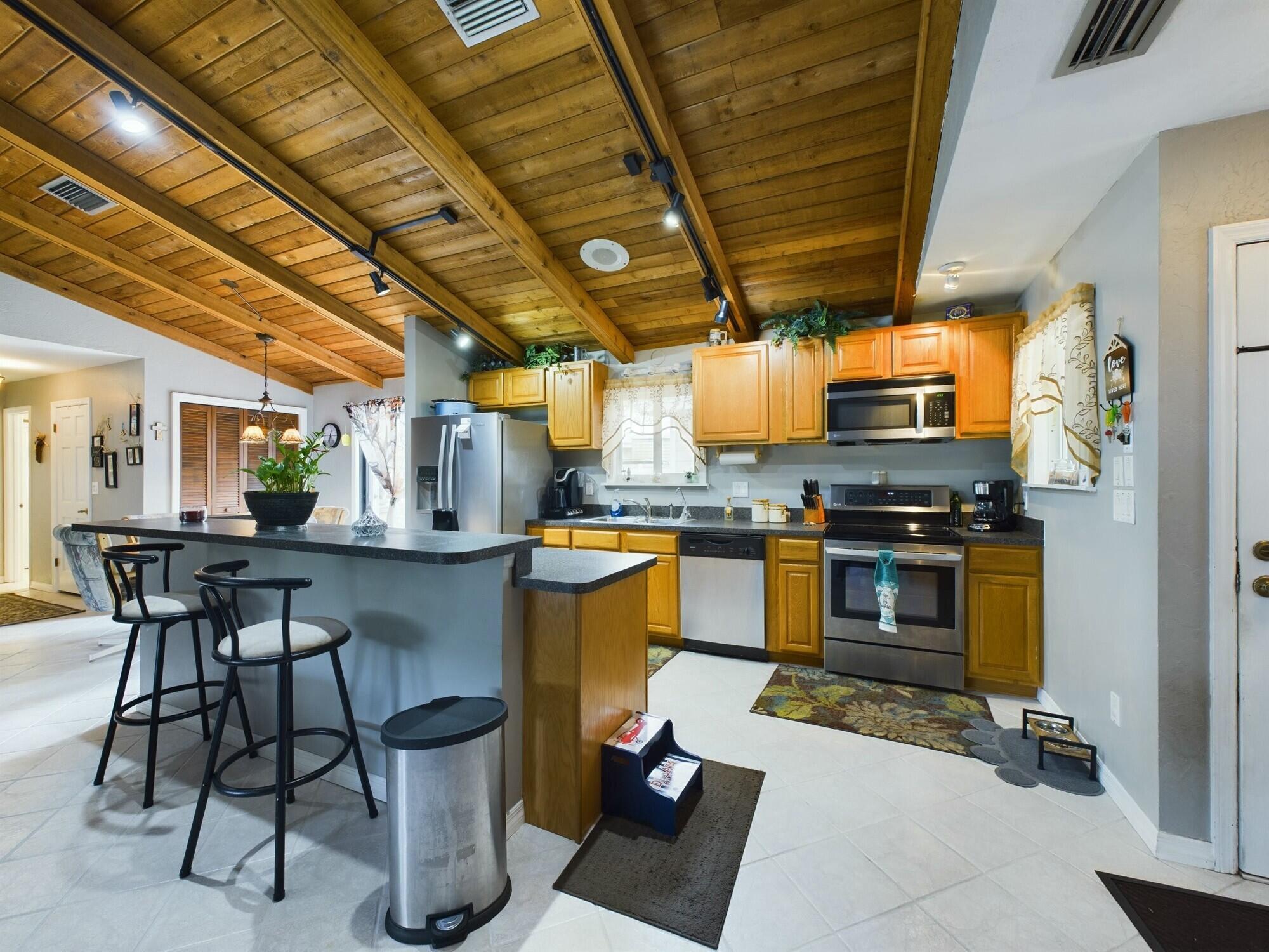Discover this charming property at 1517 SW 5th Ave in Okeechobee, offering both a spacious main house and a versatile guest house. The main home features vaulted ceilings with exposed beams, creating an inviting and airy atmosphere. It includes 3 bedrooms, 2 bathrooms, and plenty of character.The guest house provides a large 1-bedroom layout, a bonus office or small guest room, and a handicap-accessible bathroom, perfect for extended family or rental opportunities.Enjoy outdoor living in the fenced backyard with an open patio, ideal for relaxing or entertaining. The property boasts metal and hurricane windows and shutters for added security and durability. The carport canvas will be replaced before closing for the buyer's convenience.