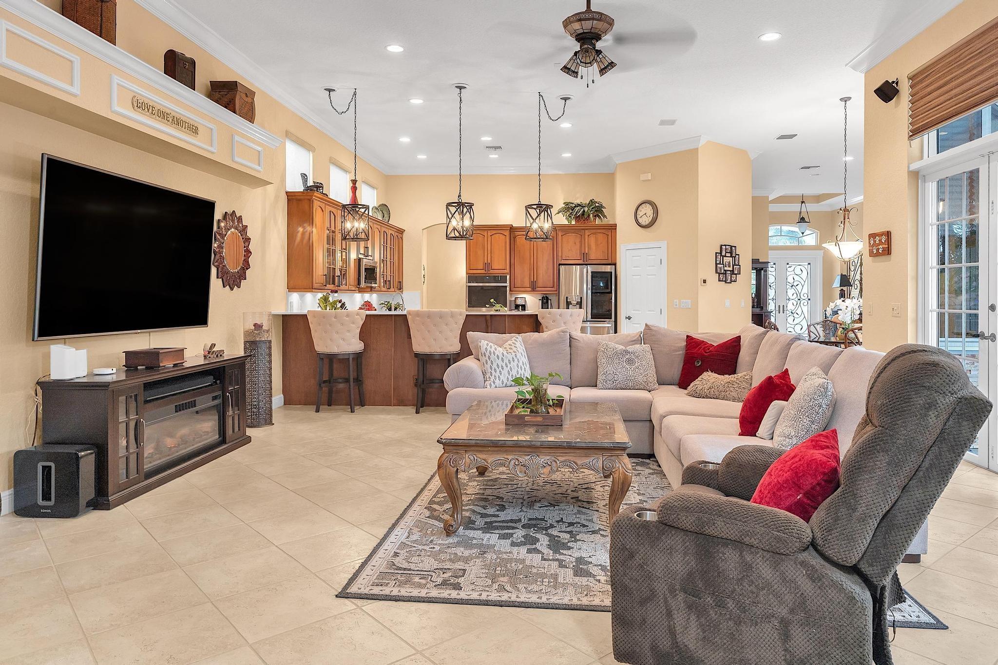Situated in the exclusive 27-home gated community of Crystal Groves Estates, this custom-built home on a fenced builder’s acre, corner lot offers breathtaking lake views. This back living area was created for a resort-style entertainment featuring a pool with waterfall, raised spa, poolside bar, and covered patio with European Tumbled Marble. Enjoy lush landscaping, a built-in fire pit, and a cozy indoor fireplace. Impact windows/doors, electric Rolladen shutters, a Generac 22k WiFi-enabled generator, and a new flat tile roof provide peace of mind. Split floor plan with a spacious main suite, maid’s quarters, office, and entertainment area. Formal dining room, white quartz countertops throughout, and stainless steel appliances complete this stunning home. Abundant natural light!