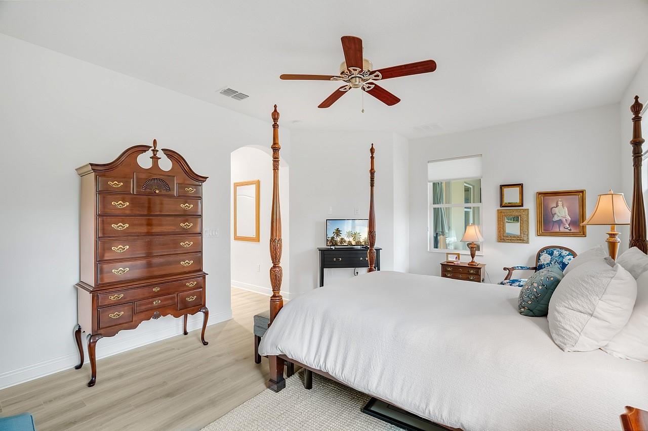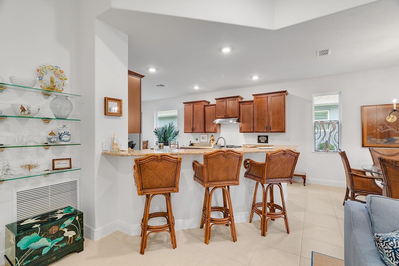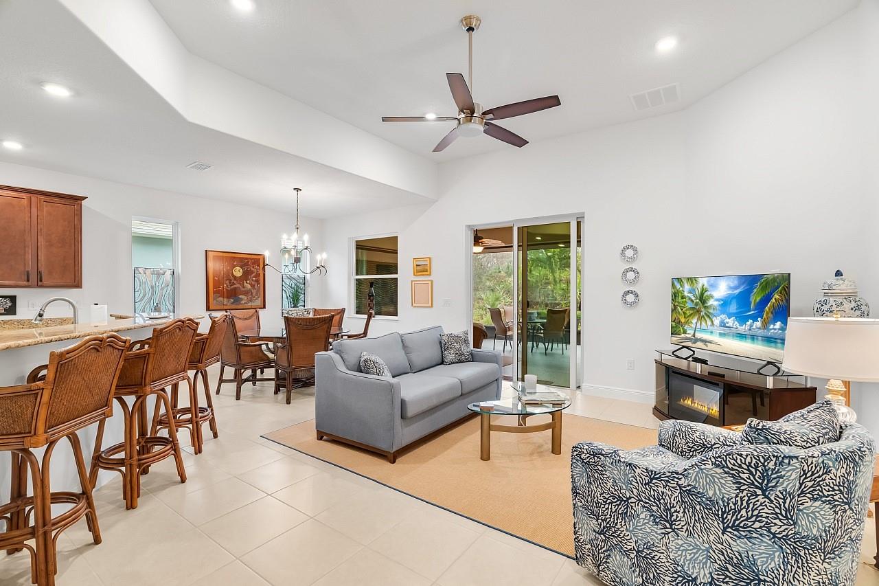 This stunning home is situated on a private lot, featuring an open-concept floor plan with three full bedrooms. With modern luxury, from the new designer lighting to upgraded appliances including a gas stove with grill and griddle. The living area flows effortlessly into the extended lanai, which is the highlight of this home. The 55+ community offers activities designed to keep you engaged and active. Impact glass throughout, plus the new glass front door, provide security & peace of mind. The utility room has a new built-in sink and custom cabinets. Whether you're looking for relaxation, recreation, or both, this home provides it all.