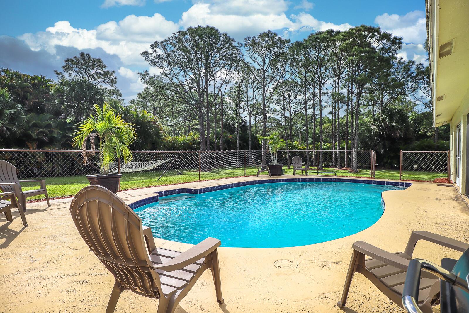 Immaculate CBS 3 bedroom/2 bath/2-car garage home in PB Country Estates. Beautiful pool. Nicely-landscaped 1.16-acre corner lot. Updated throughout - including newly-remodeled master bathroom and cabana bath. Open kitchen features stainless steel appliances, French-door refrigerator, dual-over range, granite countertops, and center island. The screened porch overlooks the beautiful fenced pool area and spacious backyard. Newer A/C. Smart toilets in the bathrooms. This home is hooked-up to city water and located on the corner of a paved road (150th) close to the front section of the subdivision for easy access to area amenities including Alton Town Center, Abacoa, and area beaches. If the lot was vacant the price would be $725,000. ONLY CBS POOL HOME UNDER $1 million on pavement