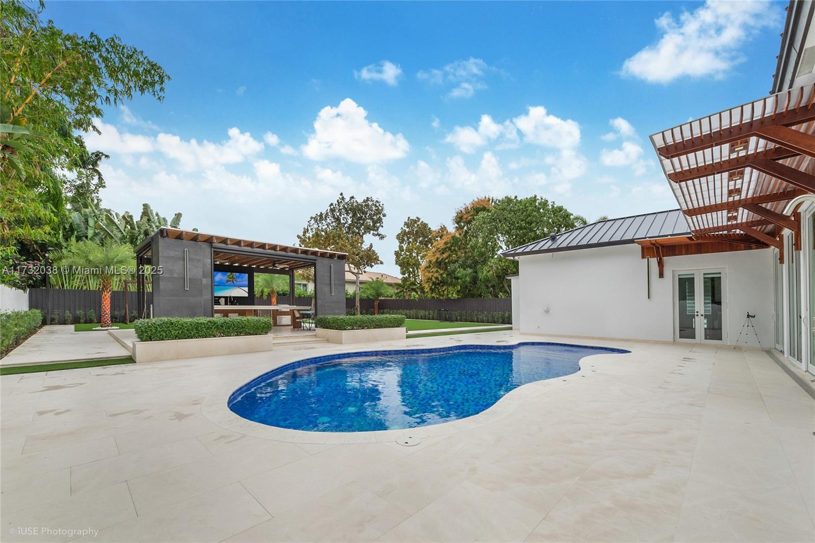 No expense has been spared in this gorgeous gated modern five-bedroom, five-bath, two-car garage luxury home. The home was built in 2007 but remodeled in 2024. It has a new metal roof, impact windows, and top-of-the-line finishes everywhere. The house has high ceilings in every room and beautiful light colored marble floors throughout. The backyard is truly an entertaining oasis. It has a 600 sq ft outdoor kitchen with a flat-screen TV, BBQ, ice maker, refrigerator, and a full cabana bath. The pool has glass tiles, and the entire backyard has been tastefully designed and appointed with artificial grass and a complete playground for the children.