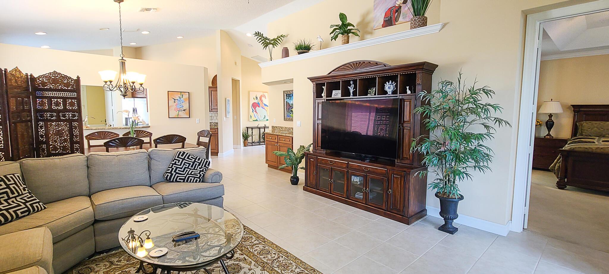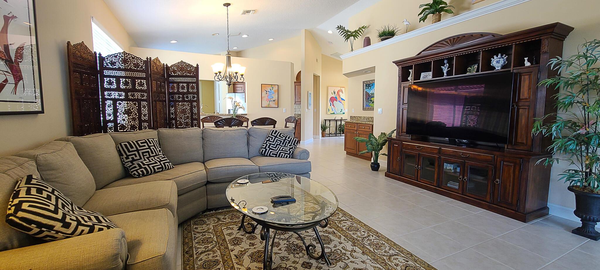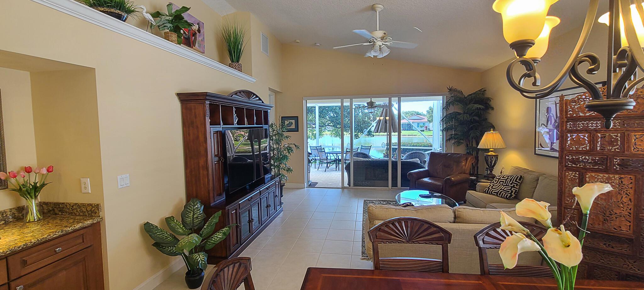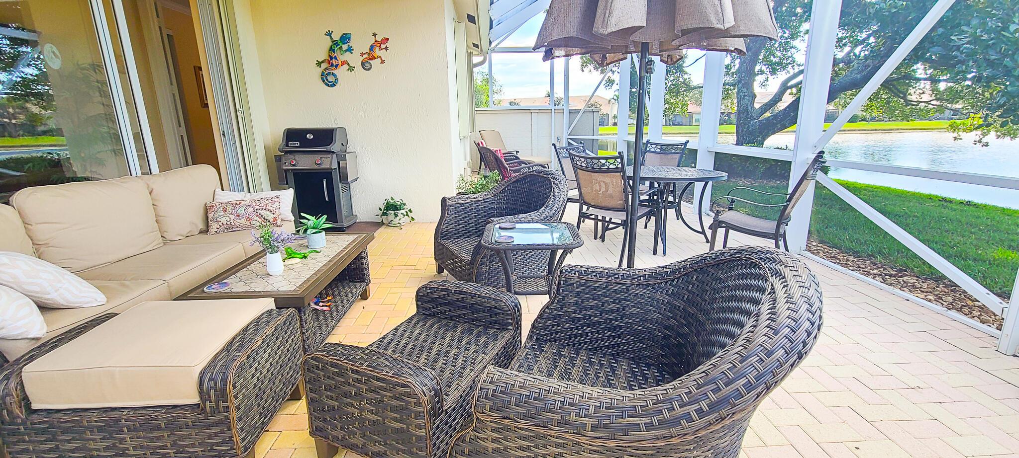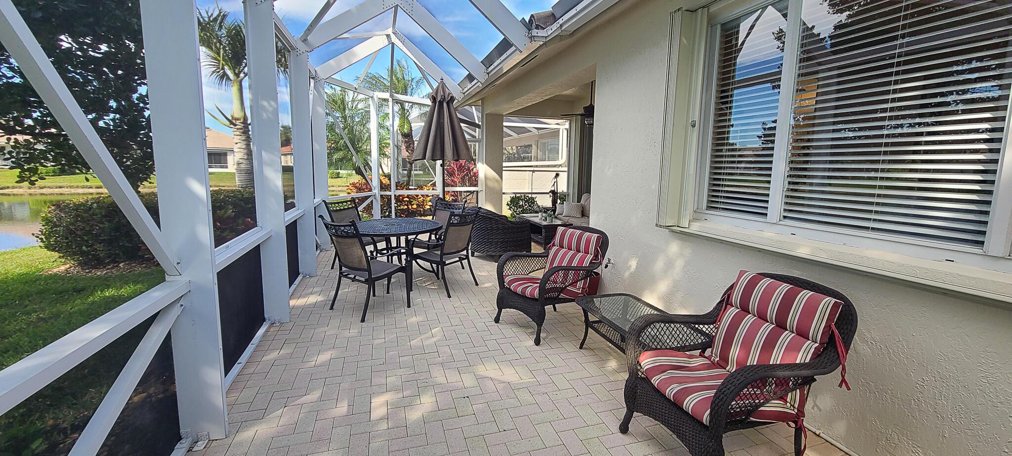 Country Club Lifestyle without the Membership Fees! Gorgeous 3 Bedrooms 2 Full Baths on a quiet Cul-De-Sac! Expanded Screened Patio overlooking the lake - Enjoy Long Lake Views! Move-in Perfect Condition!Primary Bedroom features a spa tub with Jets and lots of closet space. High Ceilings, Decorative moulding accents & High decorative shelves! Eat-in Kitchen with gorgeous cabinetry and newer appliances. Separate laundry room with laundry tub. Spacious 2 car garage. Meticulously maintained and clean! Furniture Negotiable