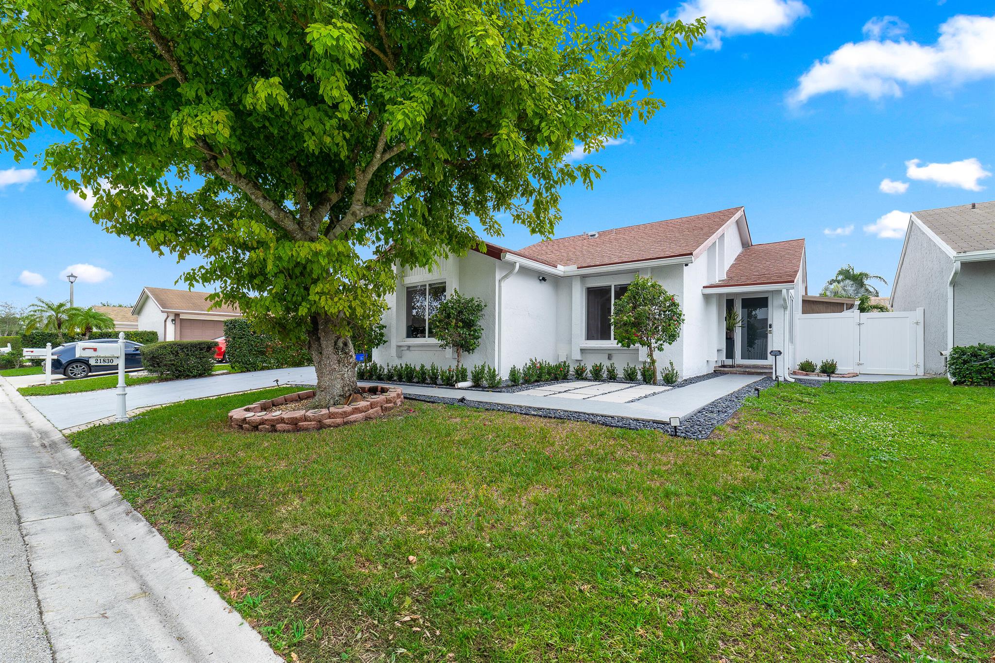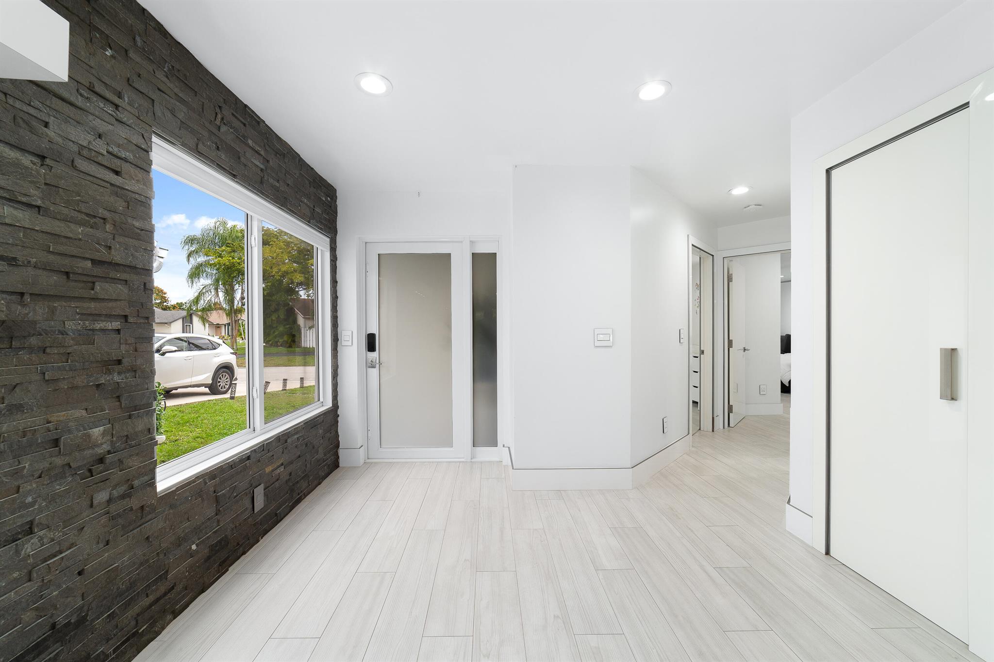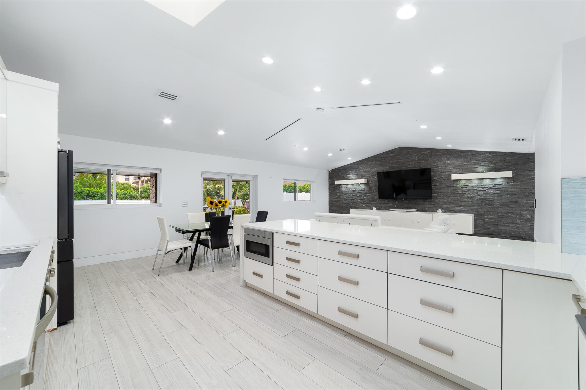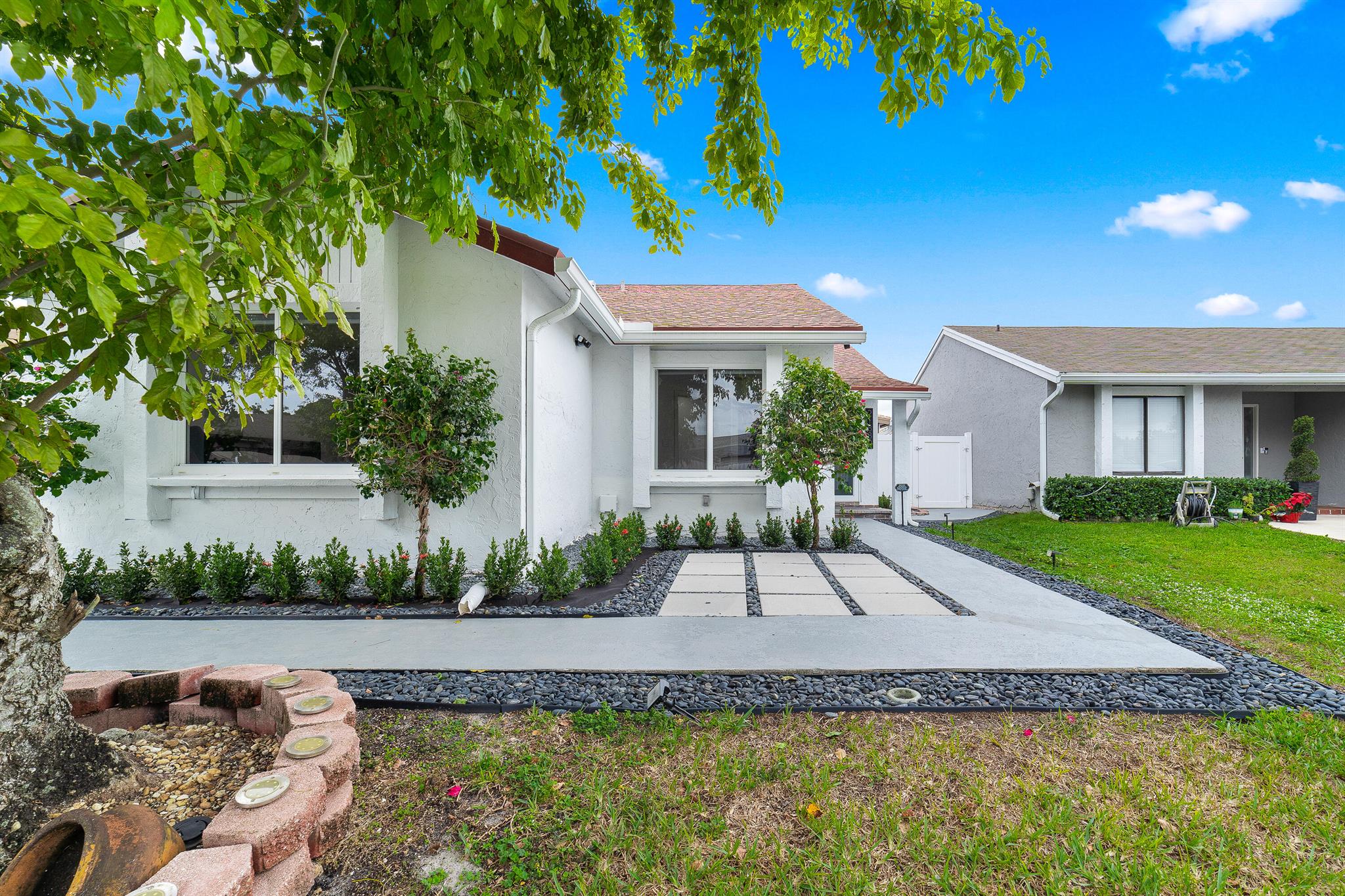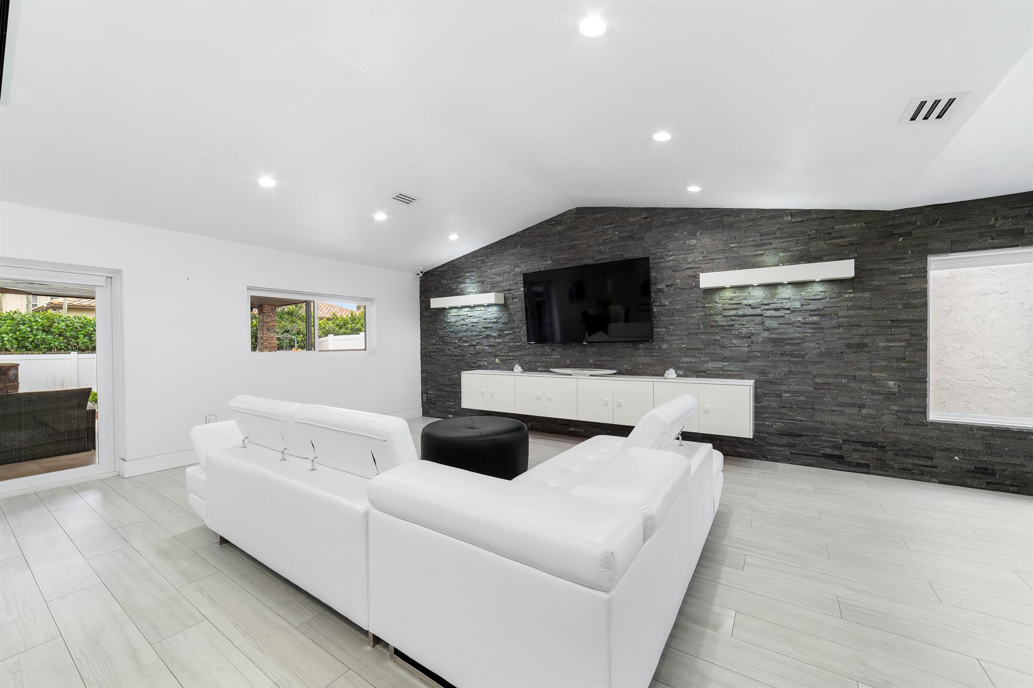 WOW home!!! Step into the perfect blend of indoor and outdoor living in this STUNNING, RENOVATED, 3 bedroom, 2 bathroom, 2-car garage SMART home. It is nestled on a quiet 0.14 acre lot in the desirable Rainberry Park community with a very LOW HOA, A-RATED schools, and just 2 minutes from West Boca Medical Center (on the same electric grid as the hospital). Notable features include IMPACT windows and doors, vaulted ceilings and elegant stone-accented wall in the living room, frosted glass impact-rated front door and recessed lighting, HVAC (2023), vents (2023), insulation (2023) and gutters (2024). There is gorgeous tile flooring throughout. The open-concept kitchen is equipped with beautiful quartz countertops, custom solid wood cabinets, backsplash, stainless steel appliances, quiet