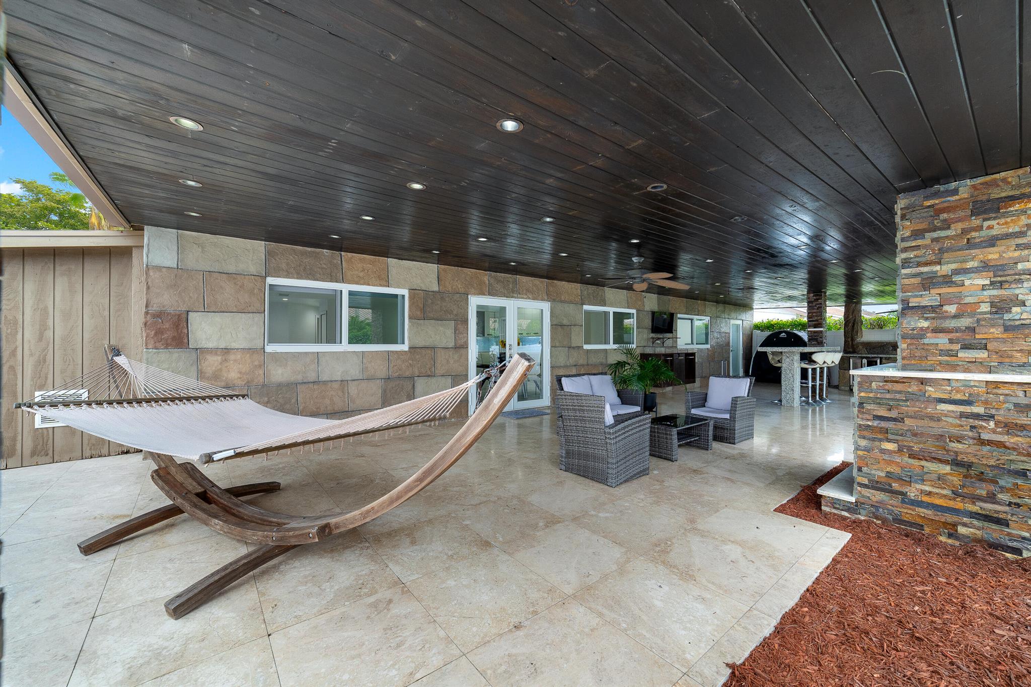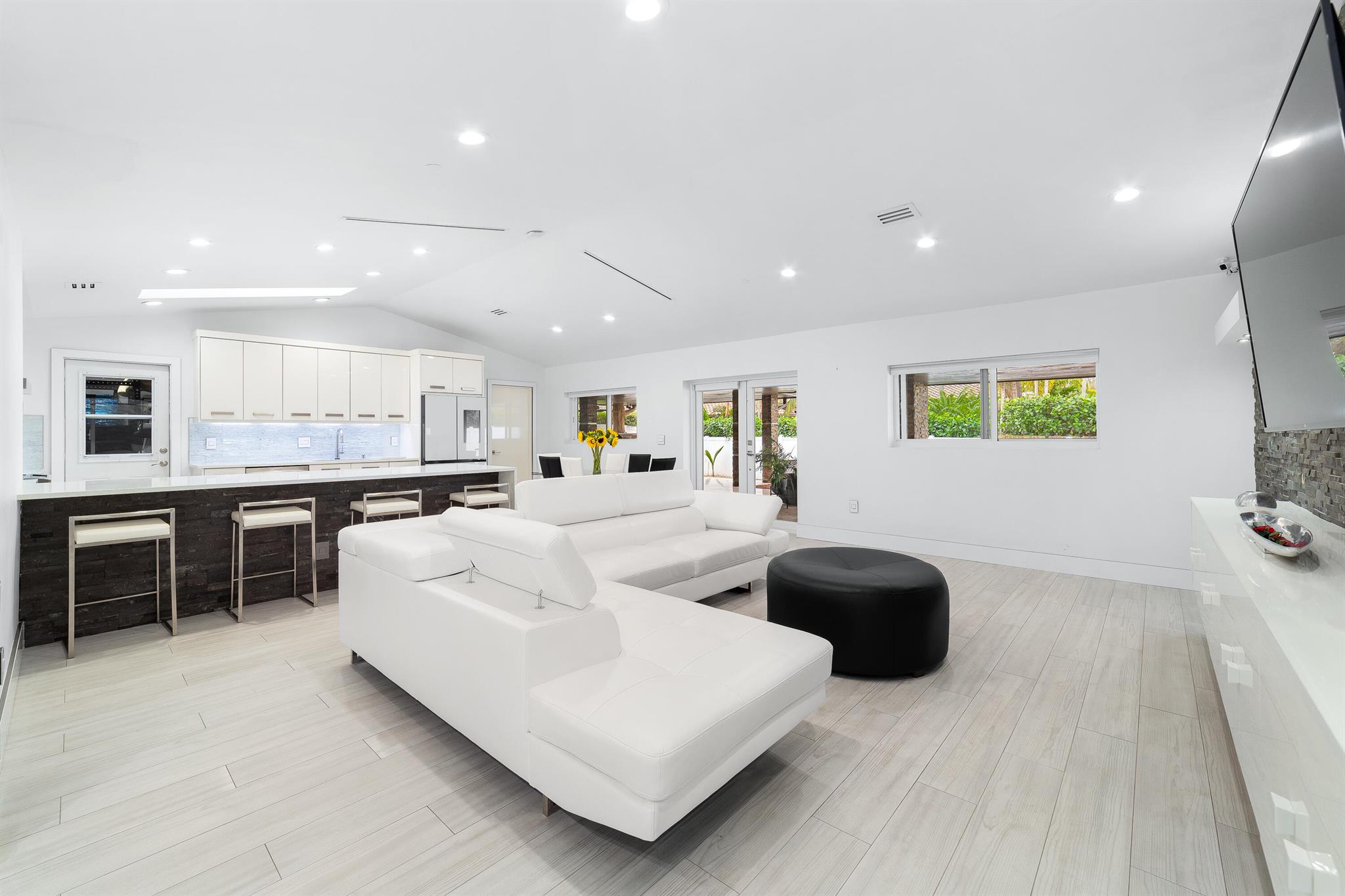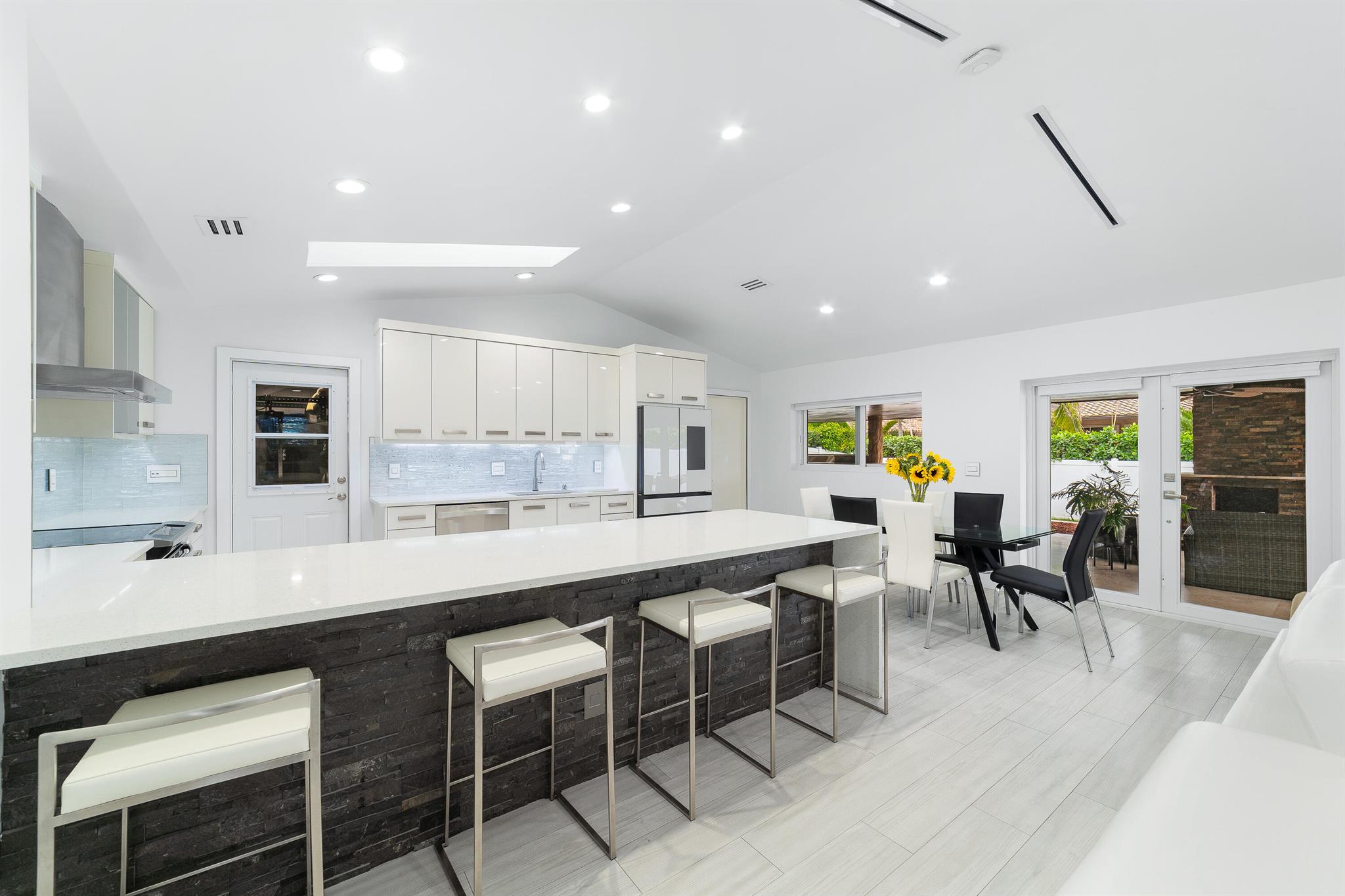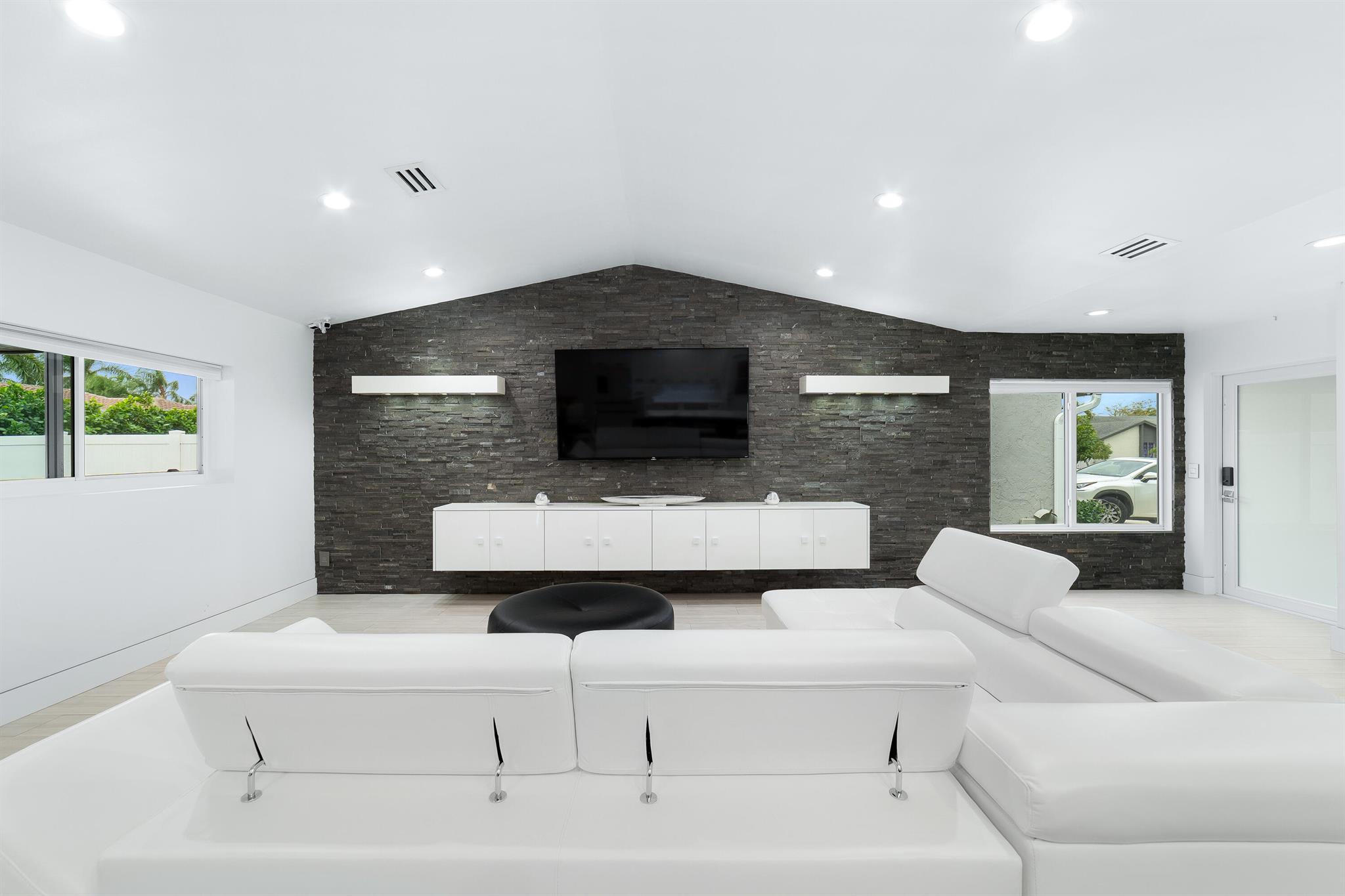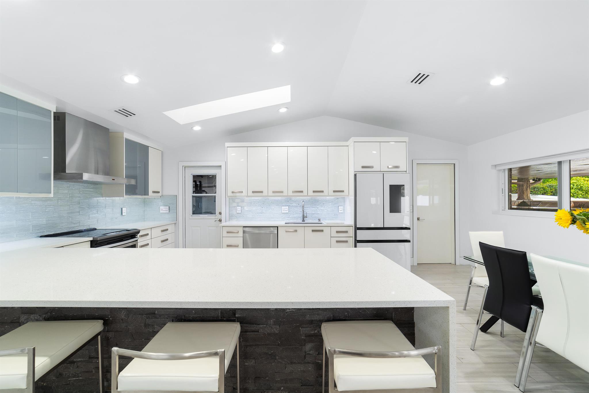 WOW home!!! Step into the perfect blend of indoor and outdoor living in this STUNNING, RENOVATED, 3 bedroom, 2 bathroom, 2-car garage SMART home. It is nestled on a quiet 0.14 acre lot in the desirable Rainberry Park community with a very LOW HOA, A-RATED schools, and just 2 minutes from West Boca Medical Center (on the same electric grid as the hospital). Notable features include IMPACT windows and doors, vaulted ceilings and elegant stone-accented wall in the living room, frosted glass impact-rated front door and recessed lighting, HVAC (2023), vents (2023), insulation (2023) and gutters (2024). There is gorgeous tile flooring throughout. The open-concept kitchen is equipped with beautiful quartz countertops, custom solid wood cabinets, backsplash, stainless steel appliances, quiet
