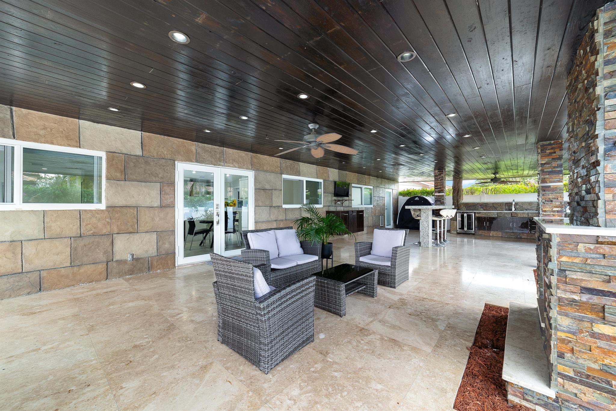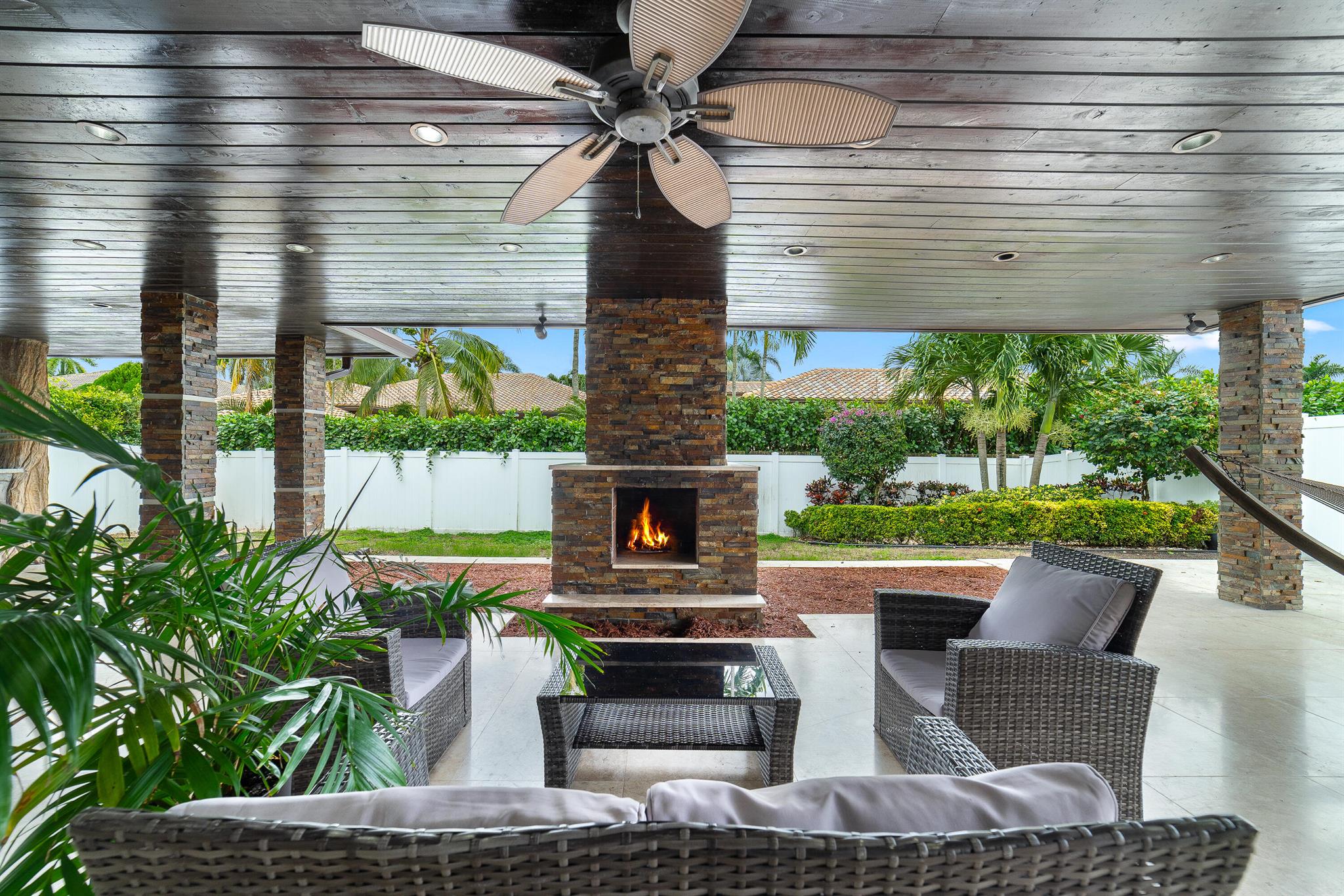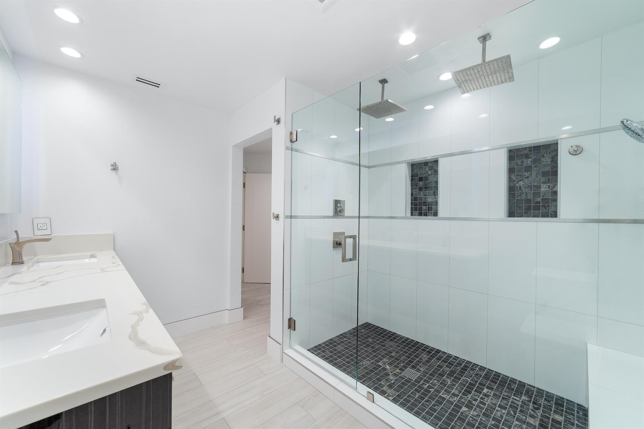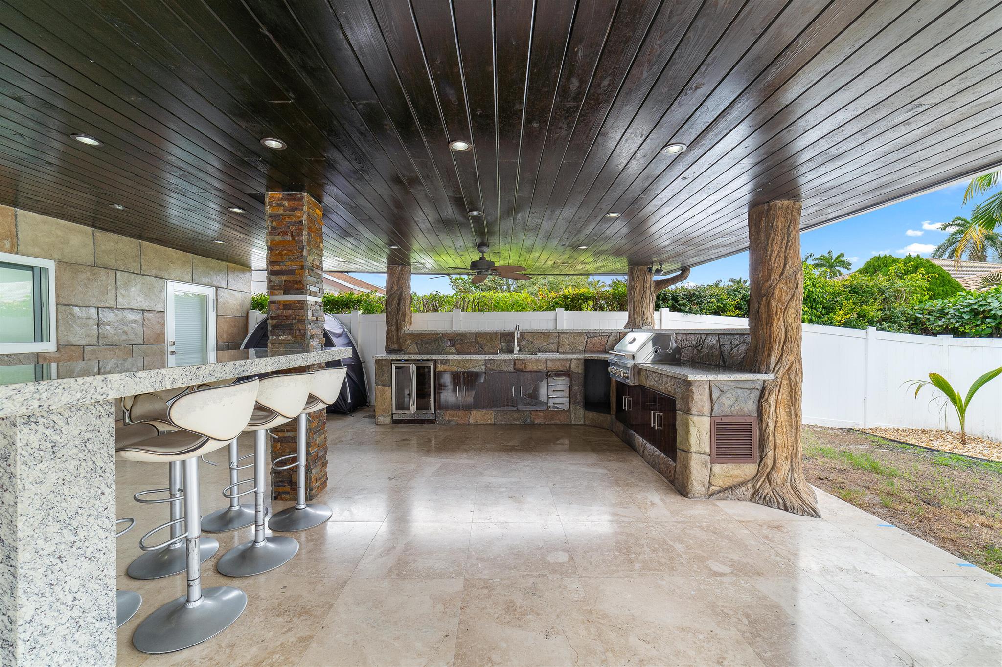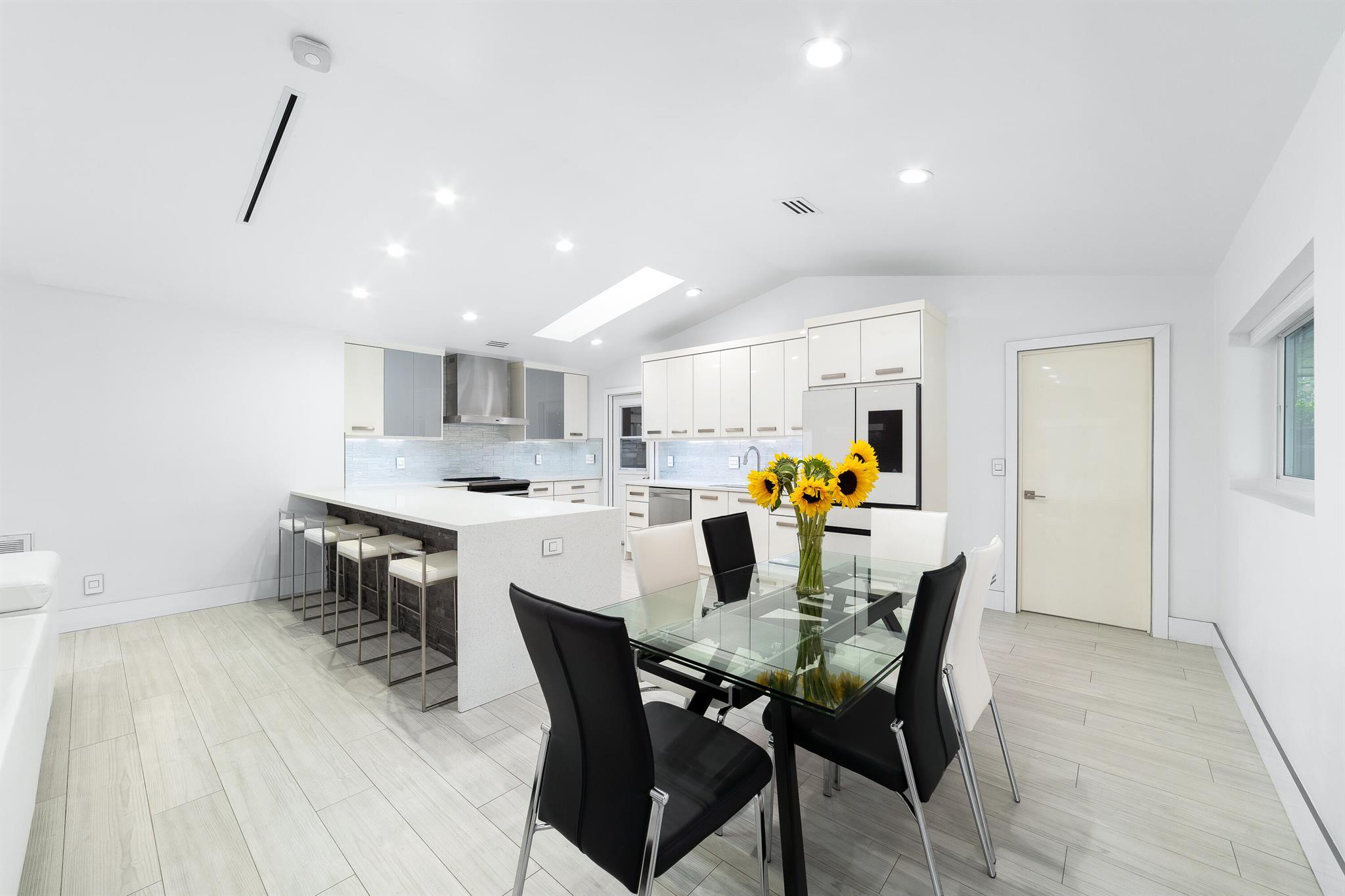 WOW home!!! Step into the perfect blend of indoor and outdoor living in this STUNNING, RENOVATED, 3 bedroom, 2 bathroom, 2-car garage SMART home. It is nestled on a quiet 0.14 acre lot in the desirable Rainberry Park community with a very LOW HOA, A-RATED schools, and just 2 minutes from West Boca Medical Center (on the same electric grid as the hospital). Notable features include IMPACT windows and doors, vaulted ceilings and elegant stone-accented wall in the living room, frosted glass impact-rated front door and recessed lighting, HVAC (2023), vents (2023), insulation (2023) and gutters (2024). There is gorgeous tile flooring throughout. The open-concept kitchen is equipped with beautiful quartz countertops, custom solid wood cabinets, backsplash, stainless steel appliances, quiet