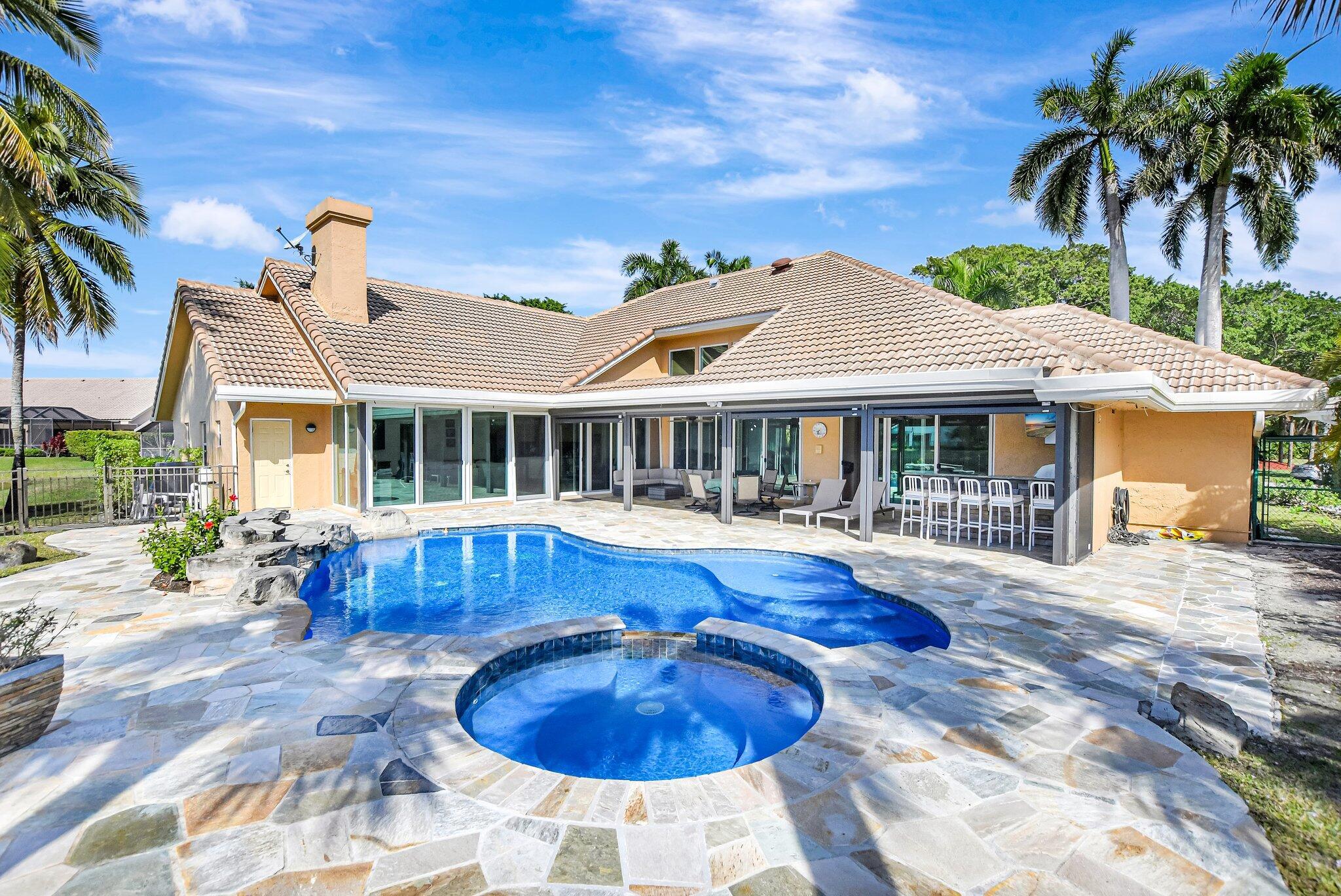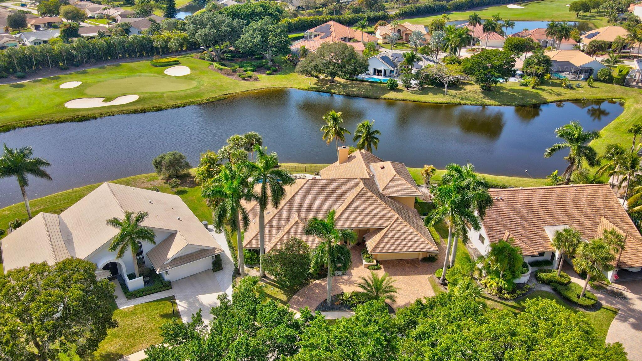 Welcome to your dream home in the intimate, highly sought-after Gated Golf community of Stonebridge Country Club in Boca Raton. Beautiful combination of panoramic lake and golf course views. The spacious backyard is perfect for entertaining with a sparkling resurfaced resort-style pool with jacuzzi, new pool heater (2024) and color-changing pool lighting. Yard is beautifully landscaped and has fruit trees. The large patio features a built-in BBQ and kitchen area with sink and small fridge. Patio is equipped with new automated hurricane protection screens. All windows and doors including the front door are new and hurricane impact rated.Exceptionally spacious 2 story home has 6-spacious bedrooms, and 6.5 baths, one bath is a cabana bath, 2 1/2 car garage, laundry room with new dryer.