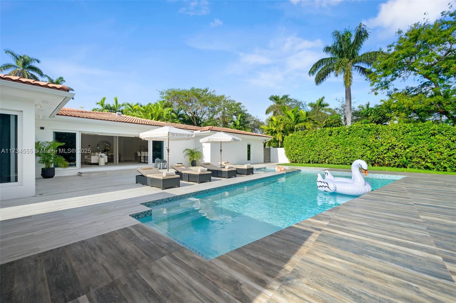 This ultra-private home is situated on an oversized 14,028 SF lot, offering 3BD, 3.5BA, 2 car-garage with A/C and a Tesla charger. Enjoy an open and airy floor plan with abundant natural light, large bedrooms with en suite baths, spacious living and entertaining areas, gourmet chef's kitchen with top-of-the-line Bosch appliances, custom cabinetry and large island. The primary suite is a true retreat, boasting a walk-in closet, motorized window treatments and a spa-like bath with soaking tub and separate shower. Outside find a beautifully enclosed landscaped backyard oasis with alfresco dining, a large 36' saltwater pool, jacuzzi and lush tropical greenery. Located in Miami Shores, one of Miami's most sought-after neighborhoods. Near top schools, shopping & dining. 15 mins to MIA airport.