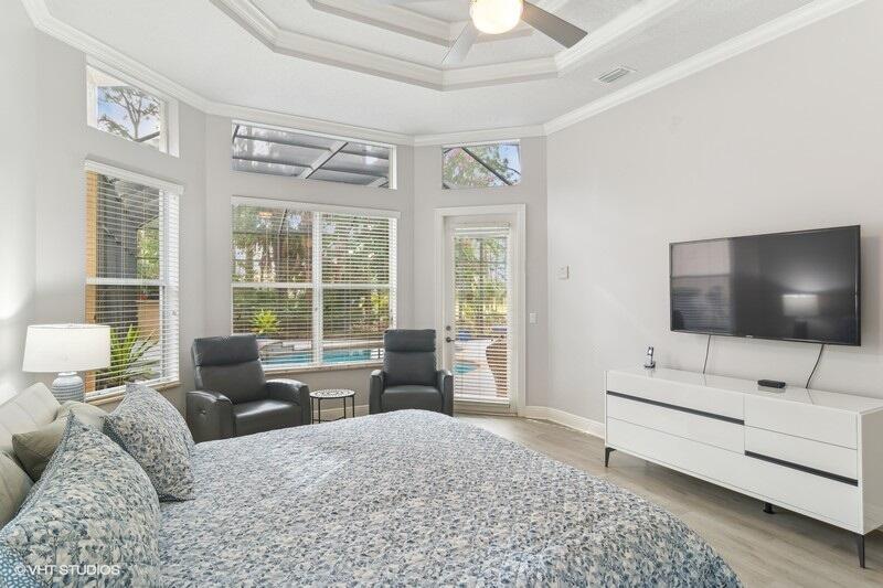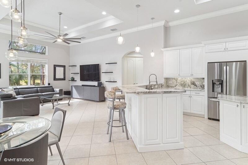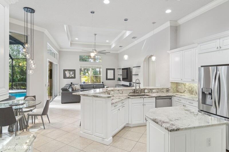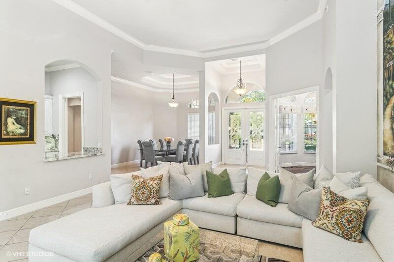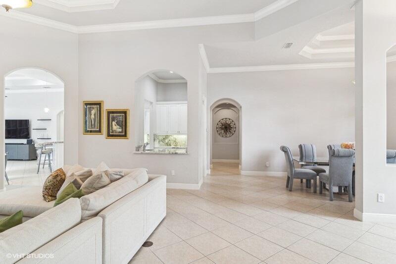 Welcome to your dream home in the exclusive PGA Village! This immaculate 4-bedroom, 4-bathroom home is designed for both comfort and style, featuring a built-in refreshing pool and spa overlooking the lush 7th hole of the PGA Wannamaker Golf Course. In addition to the 4 bedrooms, you have a den/office and a flex room. Formal living room and dining rooms give the extra space needed for entertainment, or for more casual dining you have a breakfast nook and snack bar seating in the open modern kitchen, that over looks a relaxing family room. Don't forget the wet bar for your morning coffee or nightly cocktails. An expansive covered and screened lanai, complete with a built-in BBQ offers the ultimate setting for outdoor dining and relaxation. Other features include a 3-car garage, a