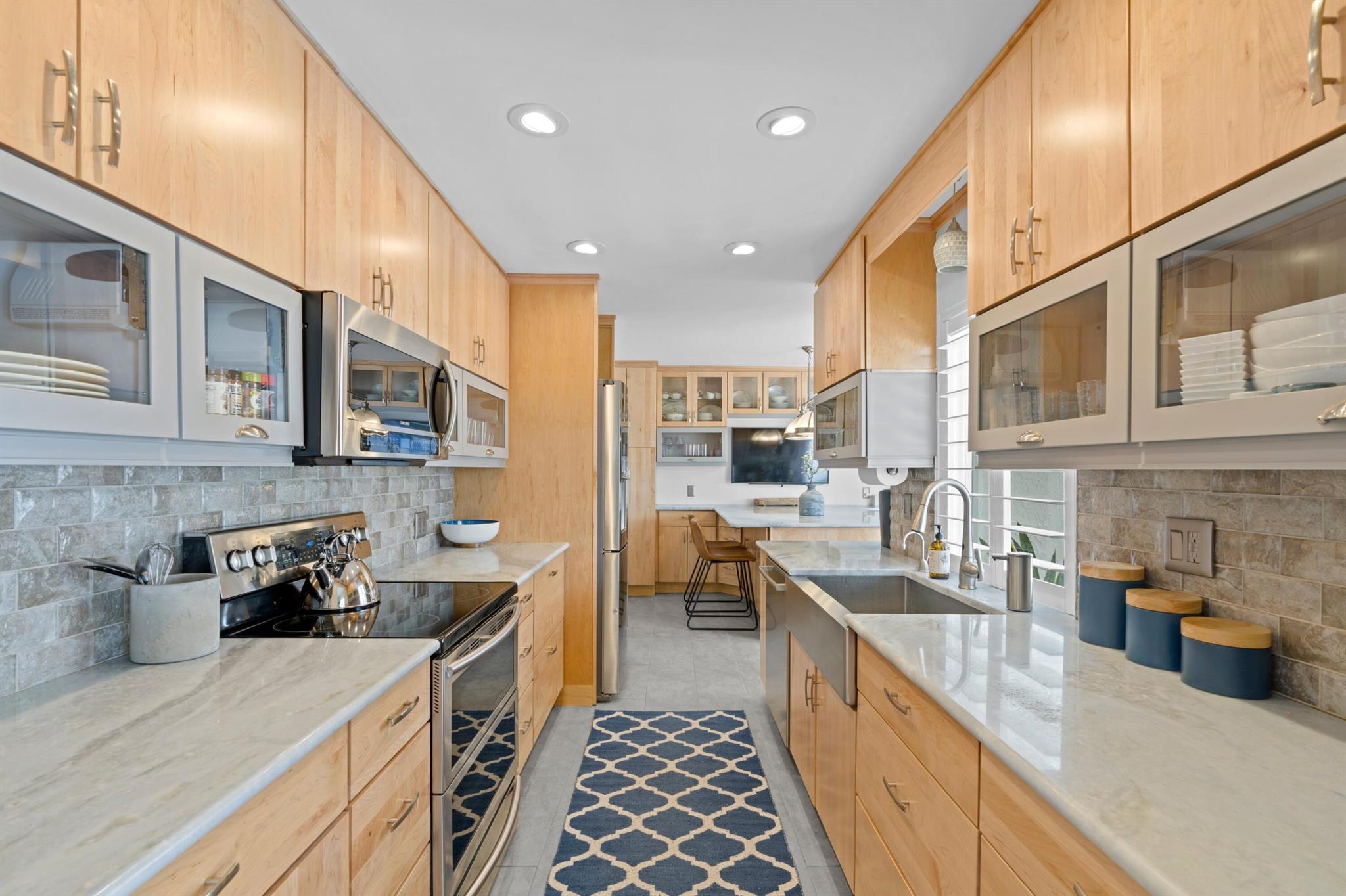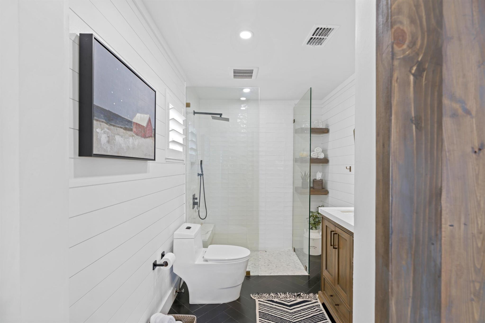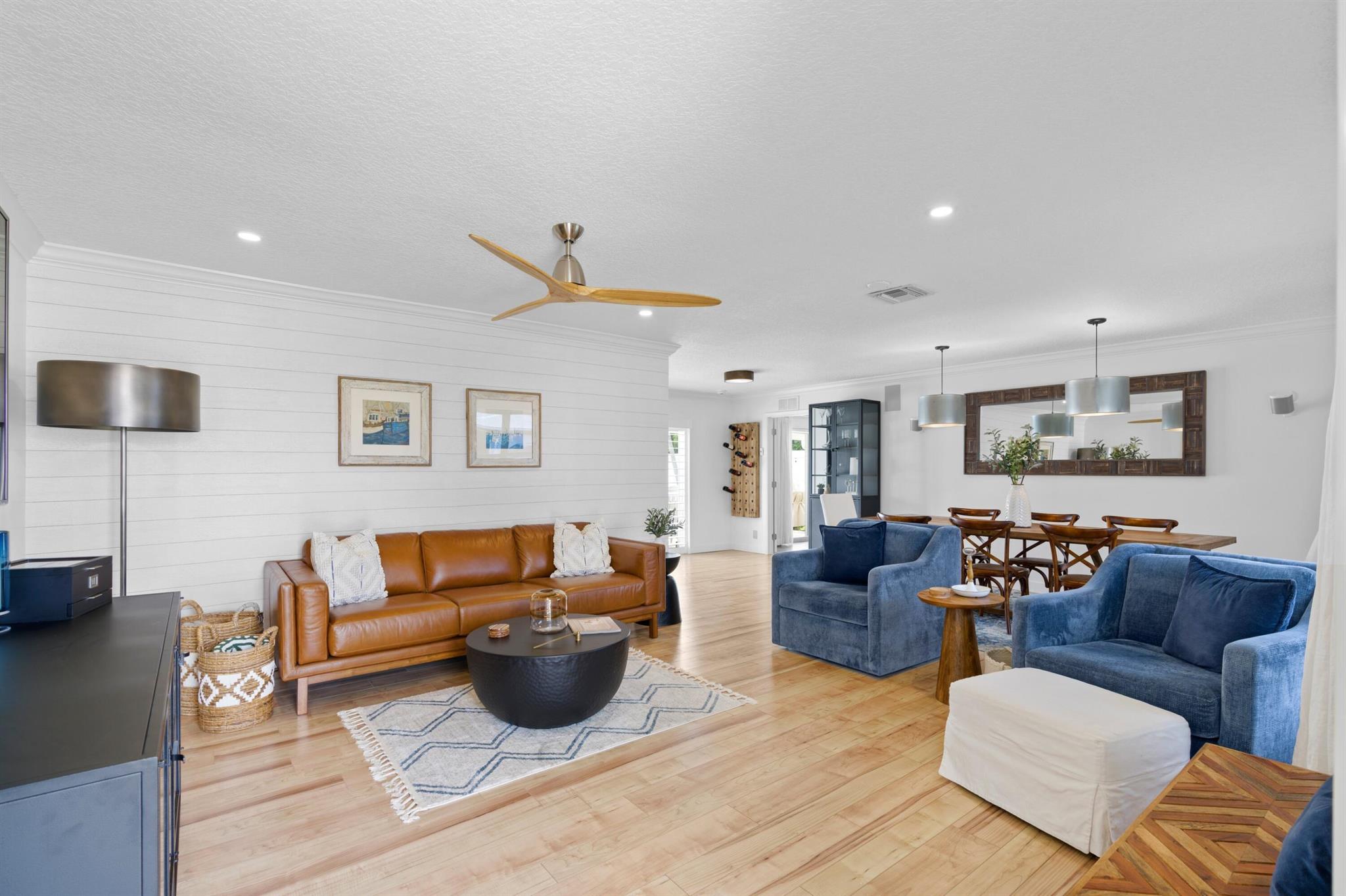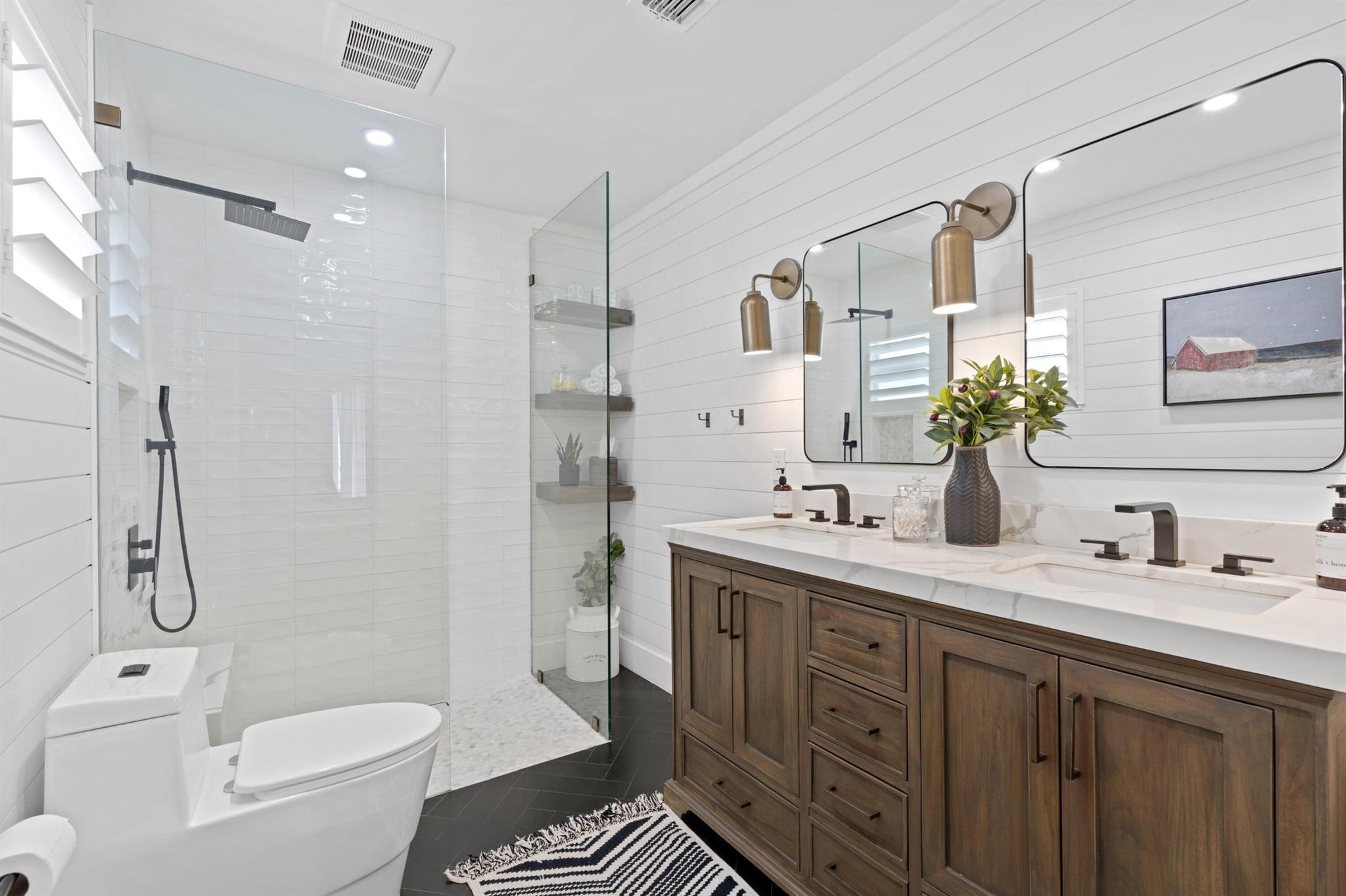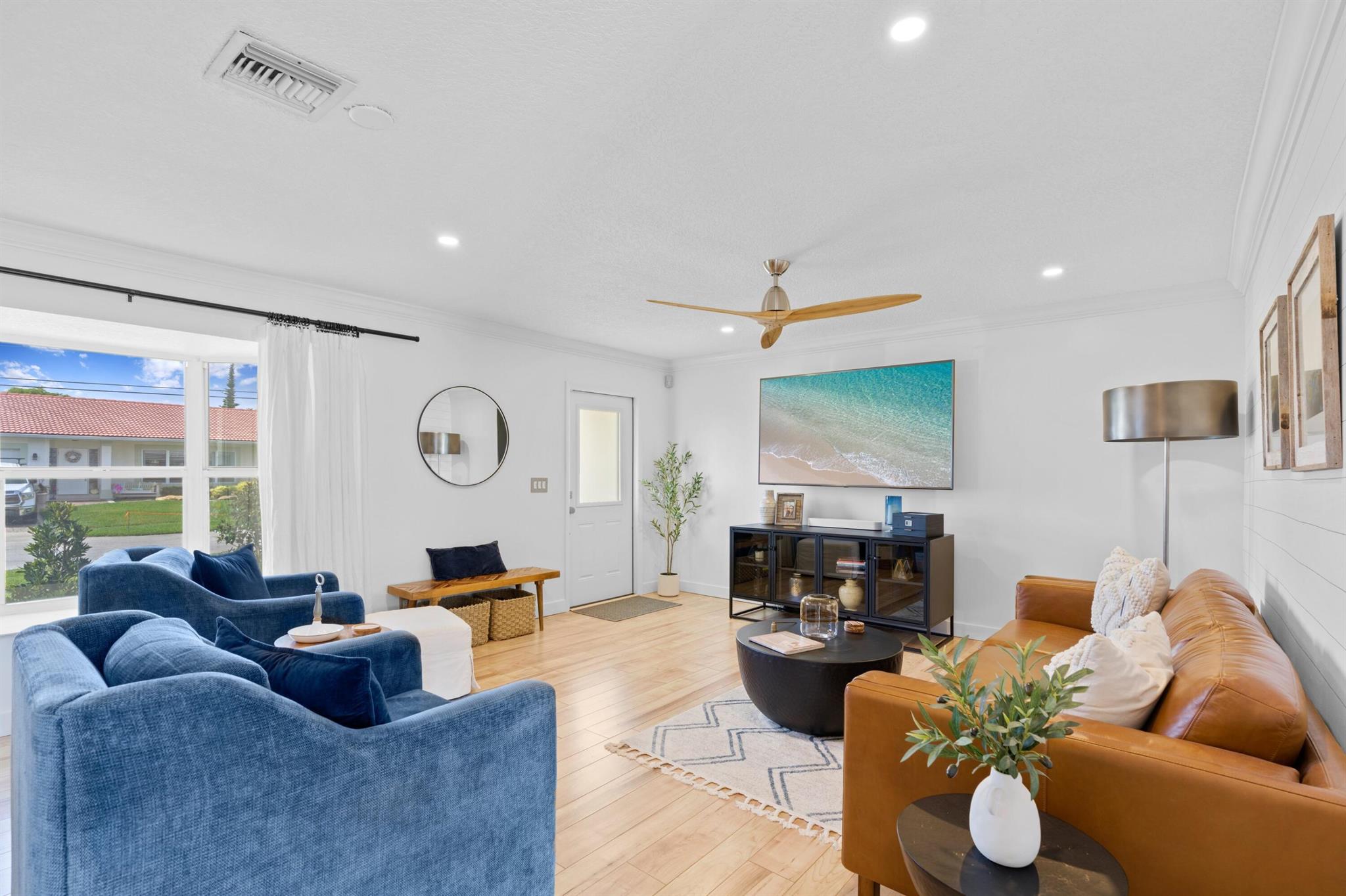Gorgeous turnkey pool home in east Boca Raton with a completely fenced in yard on a large lot. This 3/2 home has been updated with a new primary bedroom and bathroom, custom barn doors, a walk-in closet with custom built-ins and all new flooring. The primary bath was completely renovated with double sinks, quartz countertops, shiplap and separate walk-in shower with a custom quartz built-in bench. The interior has been freshly painted with new moldings, baseboards, new ceiling fans throughout, all new a/c ducts (2023), new hardware throughout, new flooring in all the bedrooms and a new full-size washer/dryer inside. Water softener system (2021) and new AC (2019). The updated large extended eat-in kitchen with granite countertops, an oversized island, custom maple cabinetry with