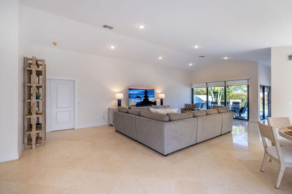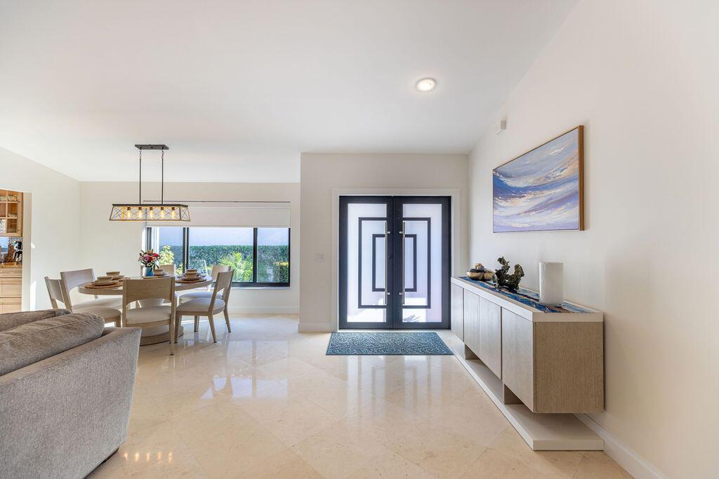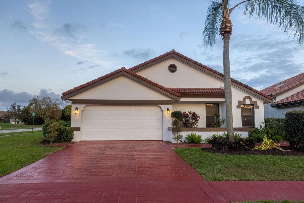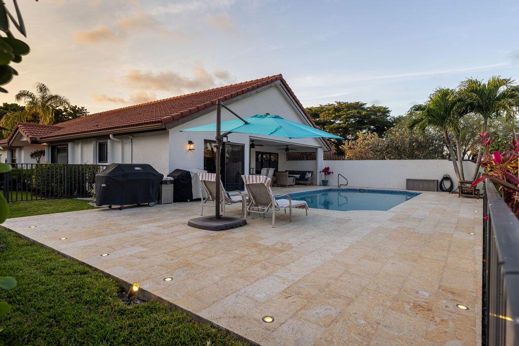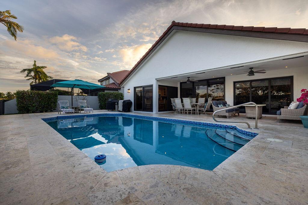 Come see this beautifully updated ranch home in Boca Woods Country Club; one of Palm Beach County's exclusive golf communities. This home was originally a 2 BR & 2BA, that was brilliantly converted to a true 3 BR with a top-of-the-line Murphy bed. This home has beautiful marble floors, a fully updated main bathroom, hurricane impact windows and doors throughout the home, custom shelving in many closets, a new AC unit, plenty of storage, and an in-ground pool. The back patio area is a total oasis with an amazing view of the lake and golf course. The golf cart and outdoor patio furniture come with the home! This will not last, you don't want to miss it!