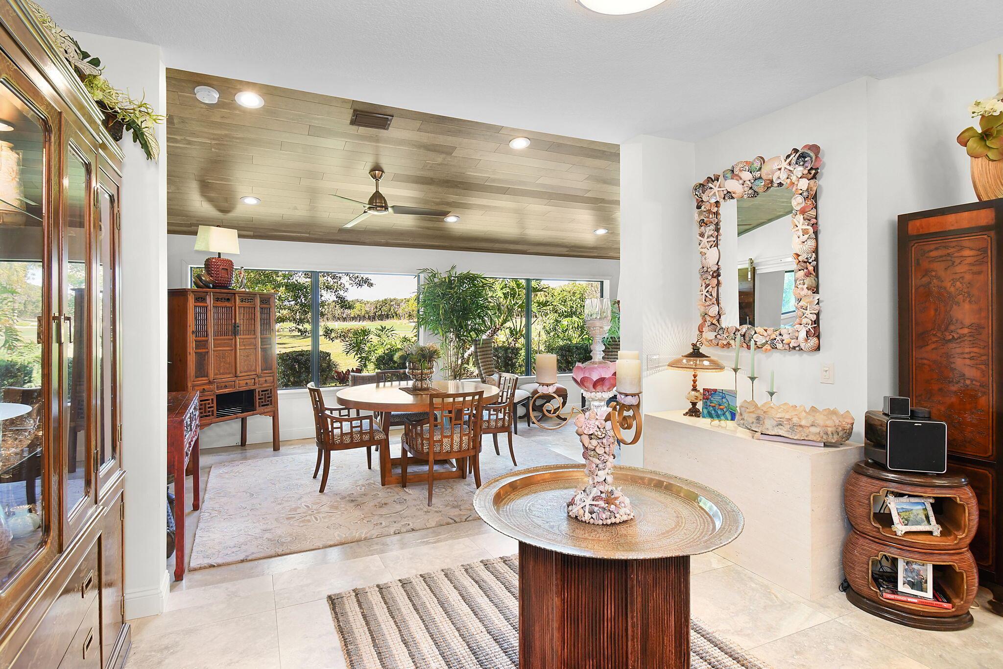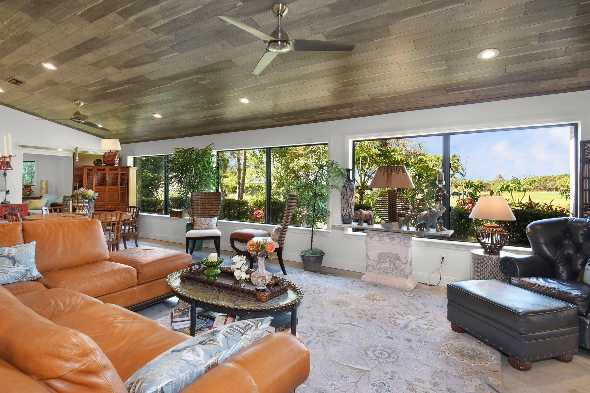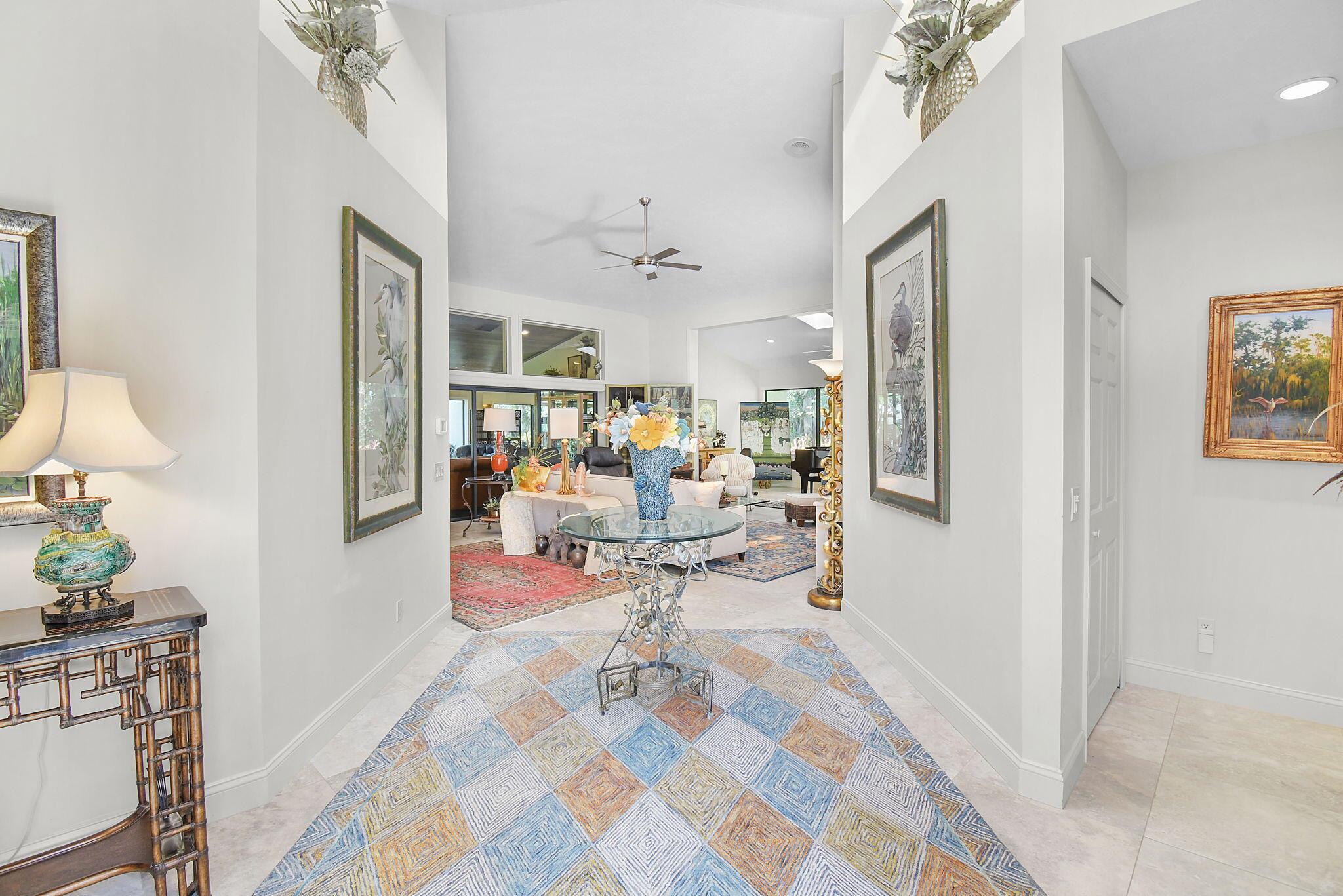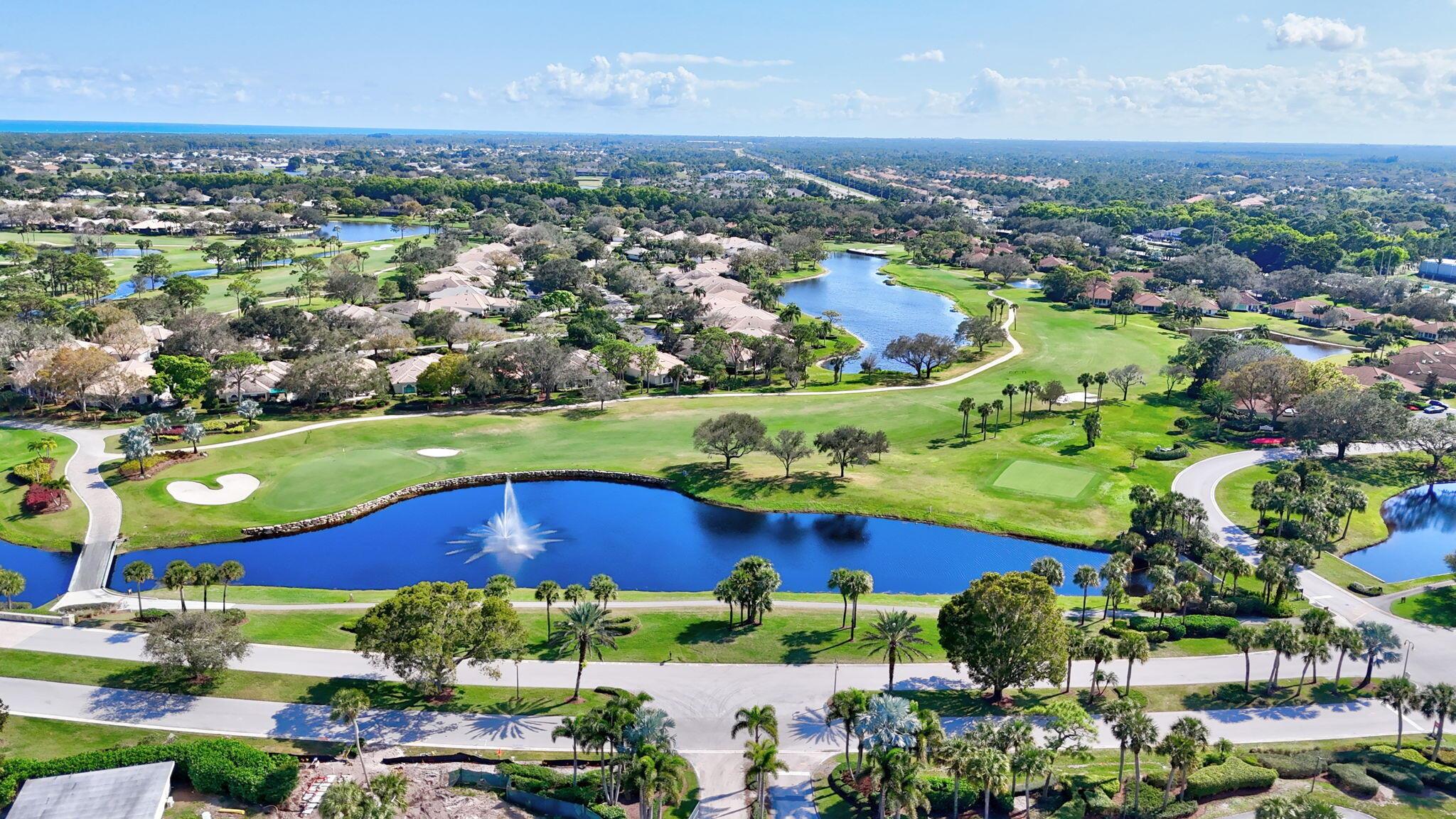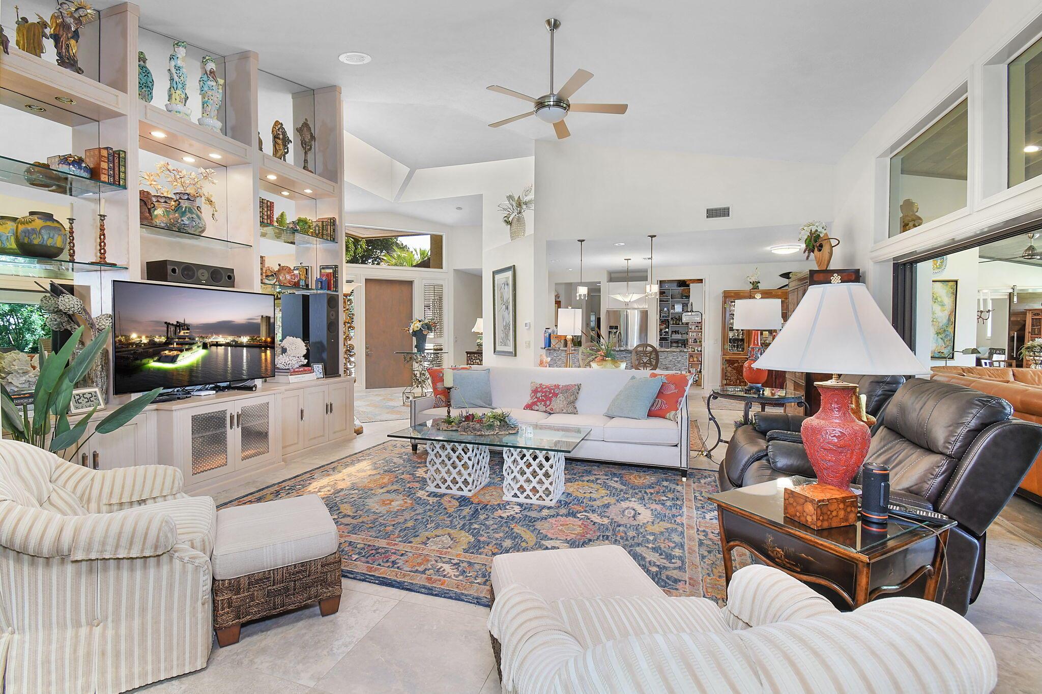 This 4 bedroom 3.5 bath home offers an expansive living space with vaulted ceilings. The recently remodeled kitchen has gorgeous granite countertops, stainless steel appliances, a large pantry & wine fridge that would please any chef. The Florida Room with wood ceilings overlooks a garden that could be easily turned into an inviting pool area. The large primary bedroom includes a sitting area & 2 walk-in closets. The massive primary bathroom has 2 vanities, step-in shower and soak tub. The Music & Recreation rooms at the rear of the home offer panoramic views of the Blue Course 14th fairway through impact glass picture windows. On the other side of the home are 3 bedrooms and 2 bathrooms. The home sits on a high & dry .58 acre lot. Garage doors replaced in 2025.