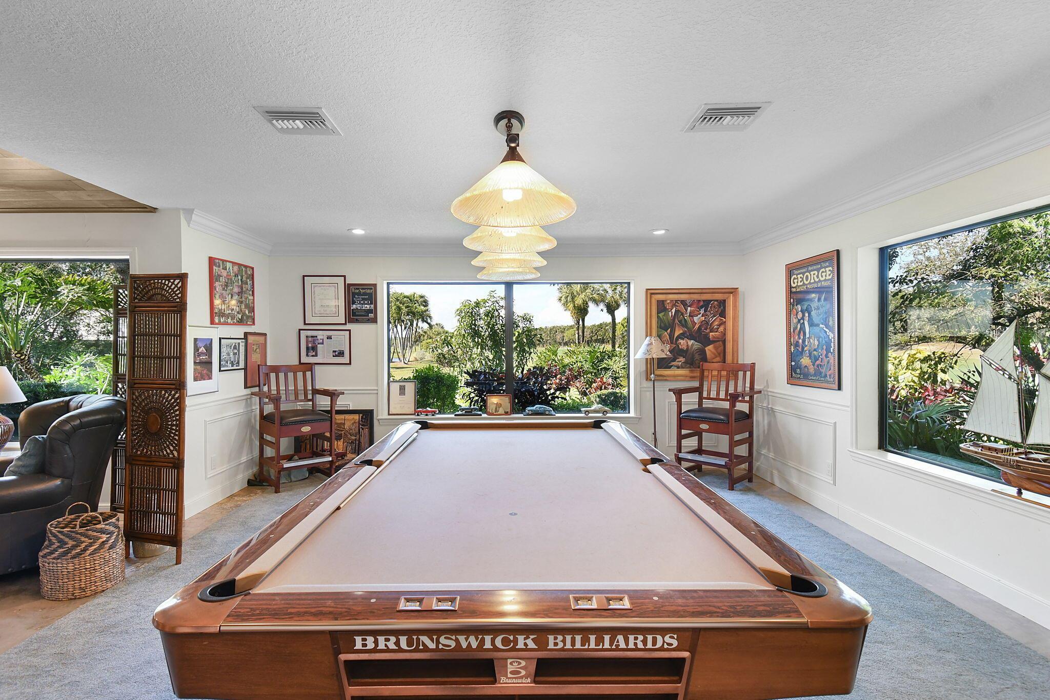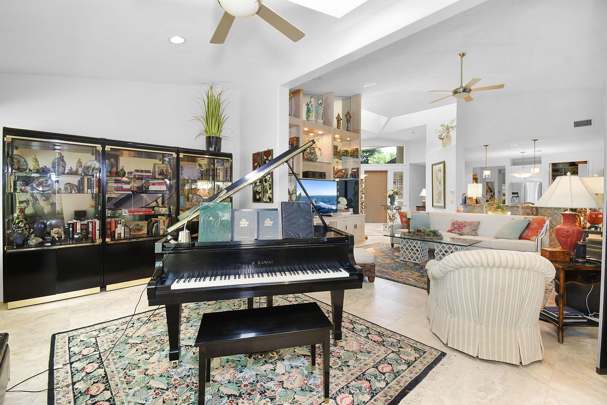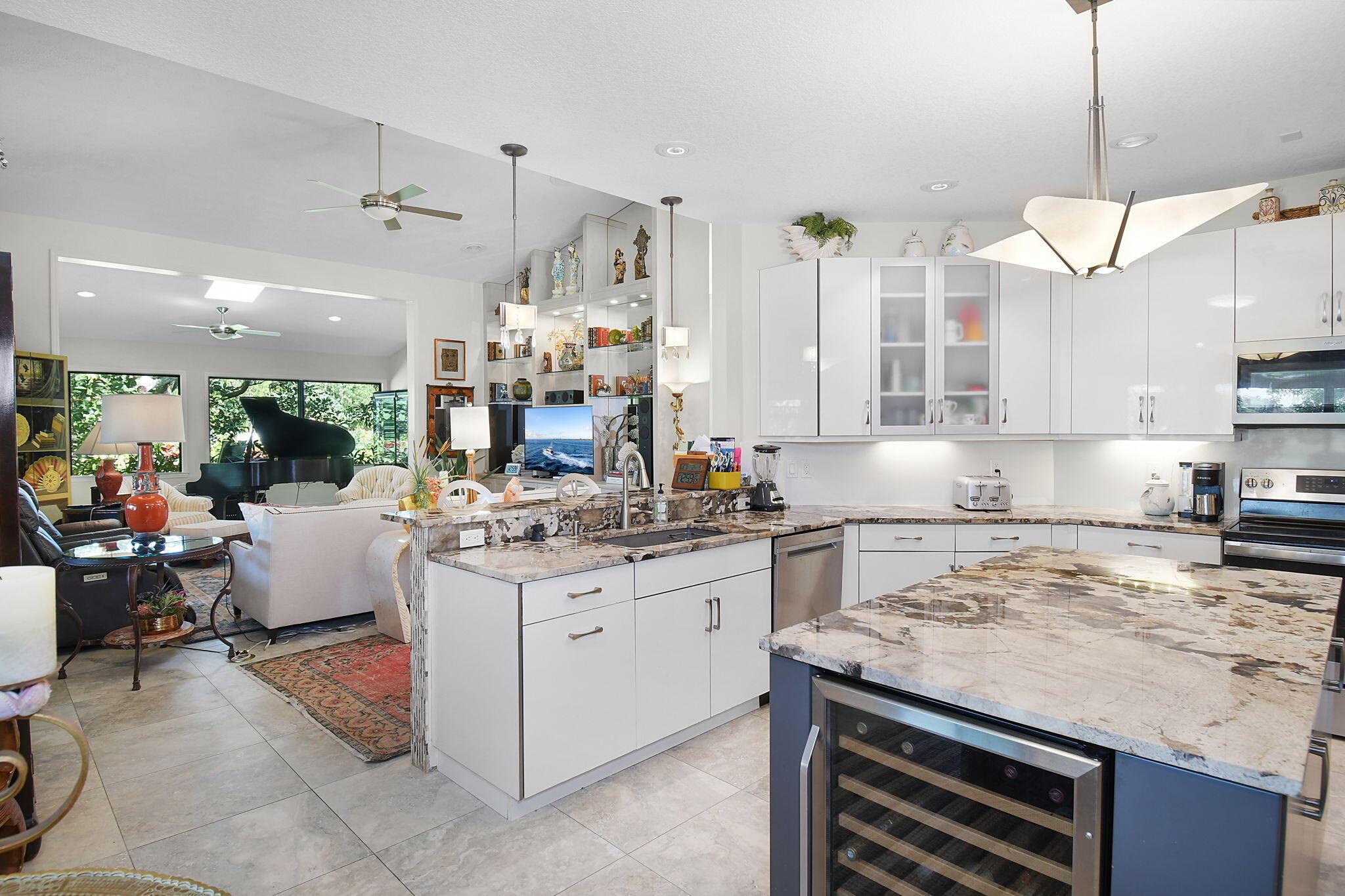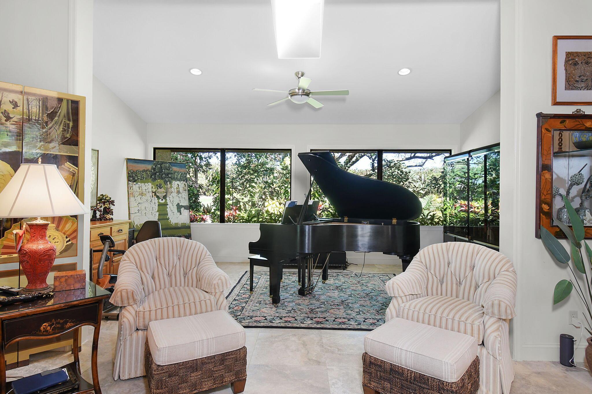 This 4 bedroom 3.5 bath home offers an expansive living space with vaulted ceilings. The recently remodeled kitchen has gorgeous granite countertops, stainless steel appliances, a large pantry & wine fridge that would please any chef. The Florida Room with wood ceilings overlooks a garden that could be easily turned into an inviting pool area. The large primary bedroom includes a sitting area & 2 walk-in closets. The massive primary bathroom has 2 vanities, step-in shower and soak tub. The Music & Recreation rooms at the rear of the home offer panoramic views of the Blue Course 14th fairway through impact glass picture windows. On the other side of the home are 3 bedrooms and 2 bathrooms. The home sits on a high & dry .58 acre lot. Garage doors replaced in 2025.