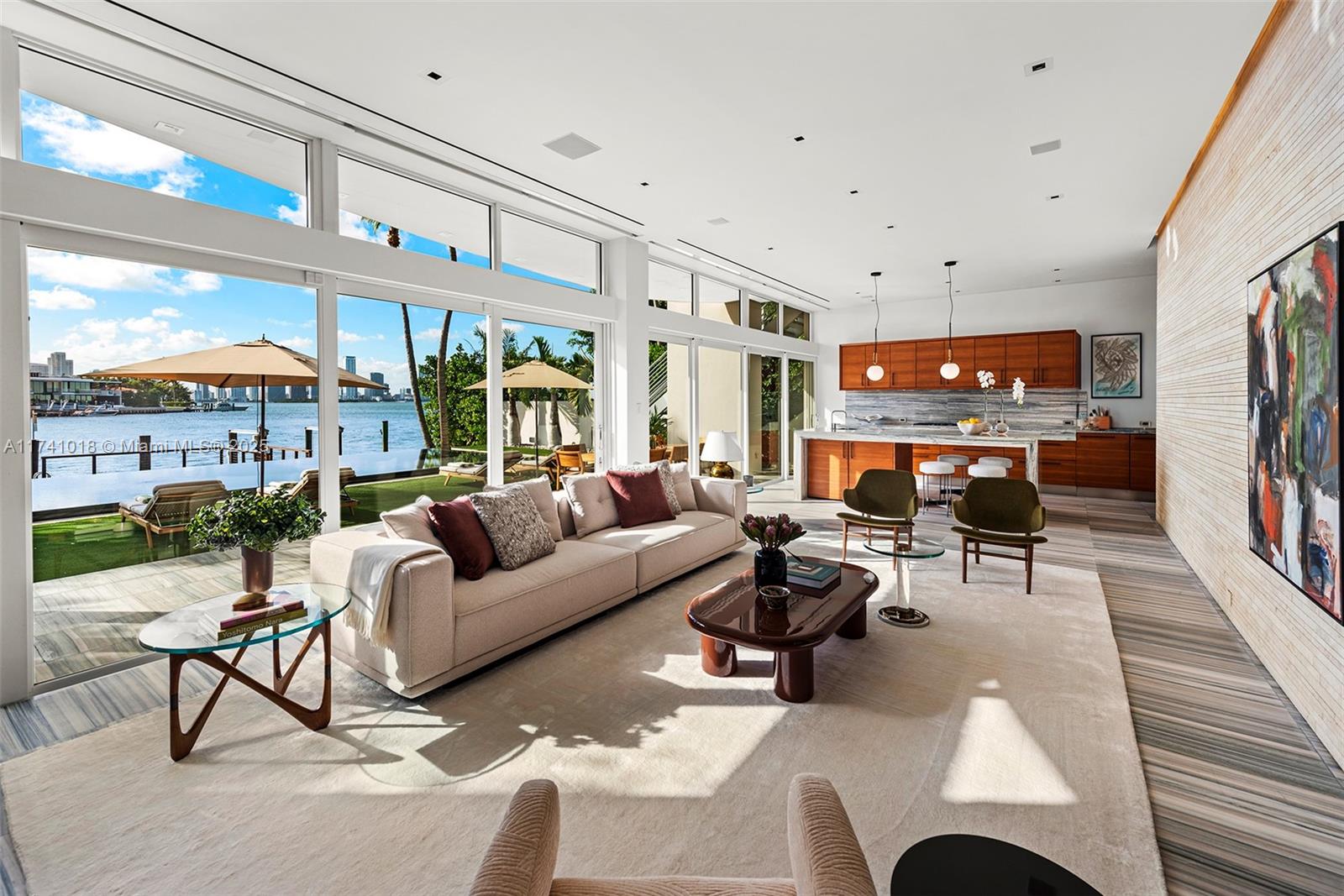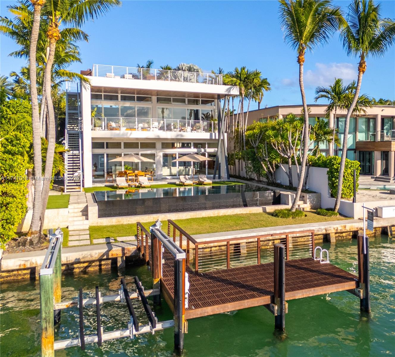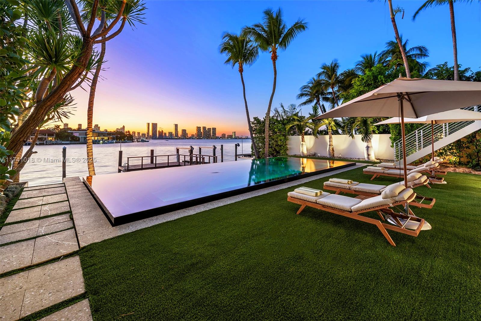 Stunning contemporary home on tropical Venetian Islands with 60-ft waterfrontage and dreamy Miami skyline and sunset views! Manicured to perfection, this luxe home features double-height foyer, sunlit living areas, gourmet kitchen, high ceilings, Crestron Control, terrazzo and marble floors, and elegant wood-paneled ceilings. Upstairs, an exceptional family room and indulgent master suite with generous walk-in closets and luxe bath. Amenities include dock, VIP guest suite, backyard oasis with saltwater infinity pool, patio for outdoor dining, sprawling rooftop with wet-bar, hot tub, and lounge beds, deep terrace with outdoor shower and access to backyard. Enjoy Miami’s waterfront lifestyle and all the best that South Beach and Miami can offer.Ideal for outdoor enthusiasts and entertainers!