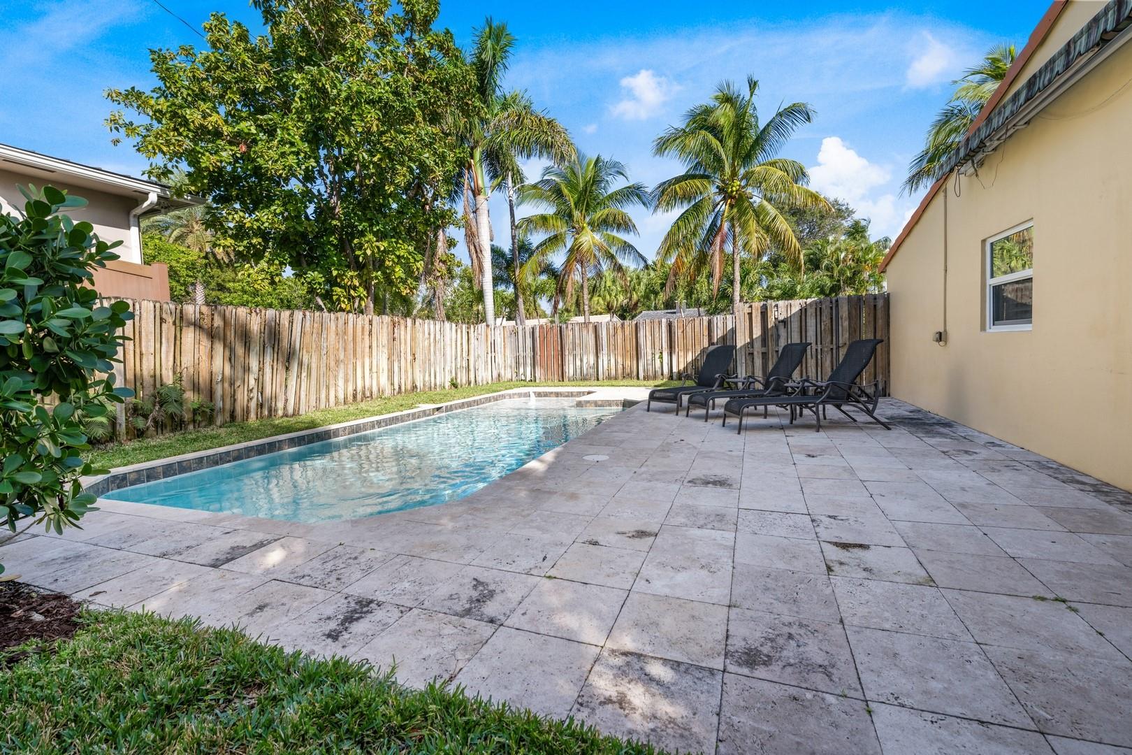 Victoria Park residence is ideally situated near the water in the desirable NE section of the neighborhood. The home has been remodeled, featuring an updated kitchen with granite countertops and high-end fixtures, a double wall oven. The guest bathroom boasts striking floor-to-ceiling mosaic tile. Exterior highlights include impact windows, newer roof, a Chicago brick driveway and patio, a large, fenced yard on both side of the house with in-ground pool, and a storage shed. This property offers convenient access to the Galleria Mall, restaurants, the Gateway movie theater, highly rated schools, very close to the beach.