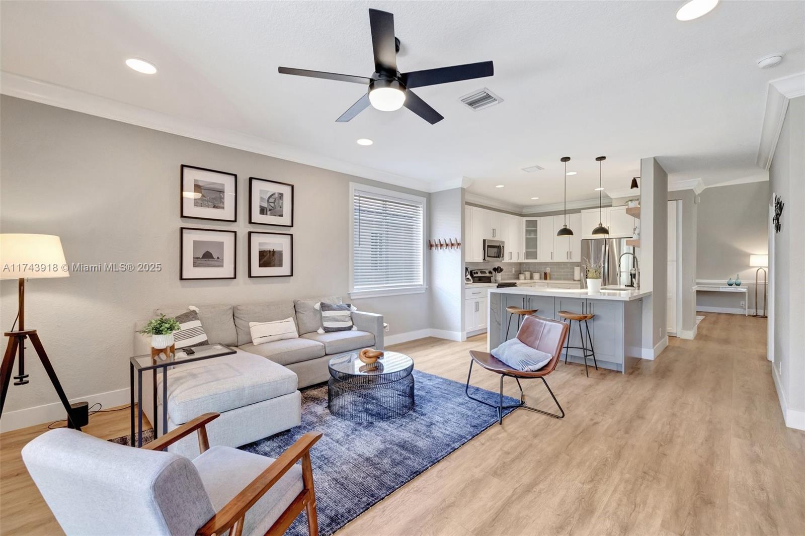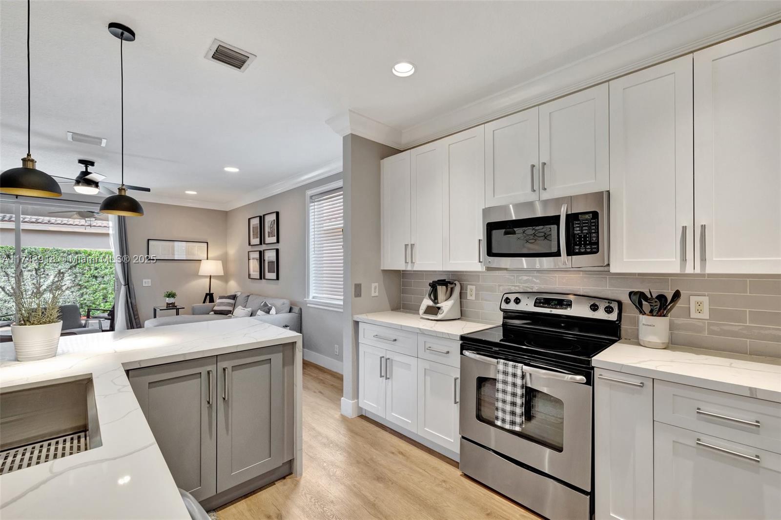 This pristine residence showcases the sought-after Windmill Elite floorplan, featuring upgrades that make this property truly exceptional. High ceilings & elegant foyer welcome you home, leading into the formal living area. Beautifully renovated kitchen meets the highest standards of modern style & functionality. Quartz counters, waterfall edge, two-tone cabinetry in crisp white & sophisticated grey, pullouts, new LG fridge, storage beneath island. Primary suite on 1st floor. Half-bath & 2nd bath renovated. New flooring, baseboards, light fixtures & dimmers. Laundry w/new dryer. Crown molding, trim around windows. Sliding doors to patio & a cozy seating space. New 5-ton A/C. Hurricane shutters, impact front door, workbench in garage perfect for DIY. Your exquisite living experience awaits!