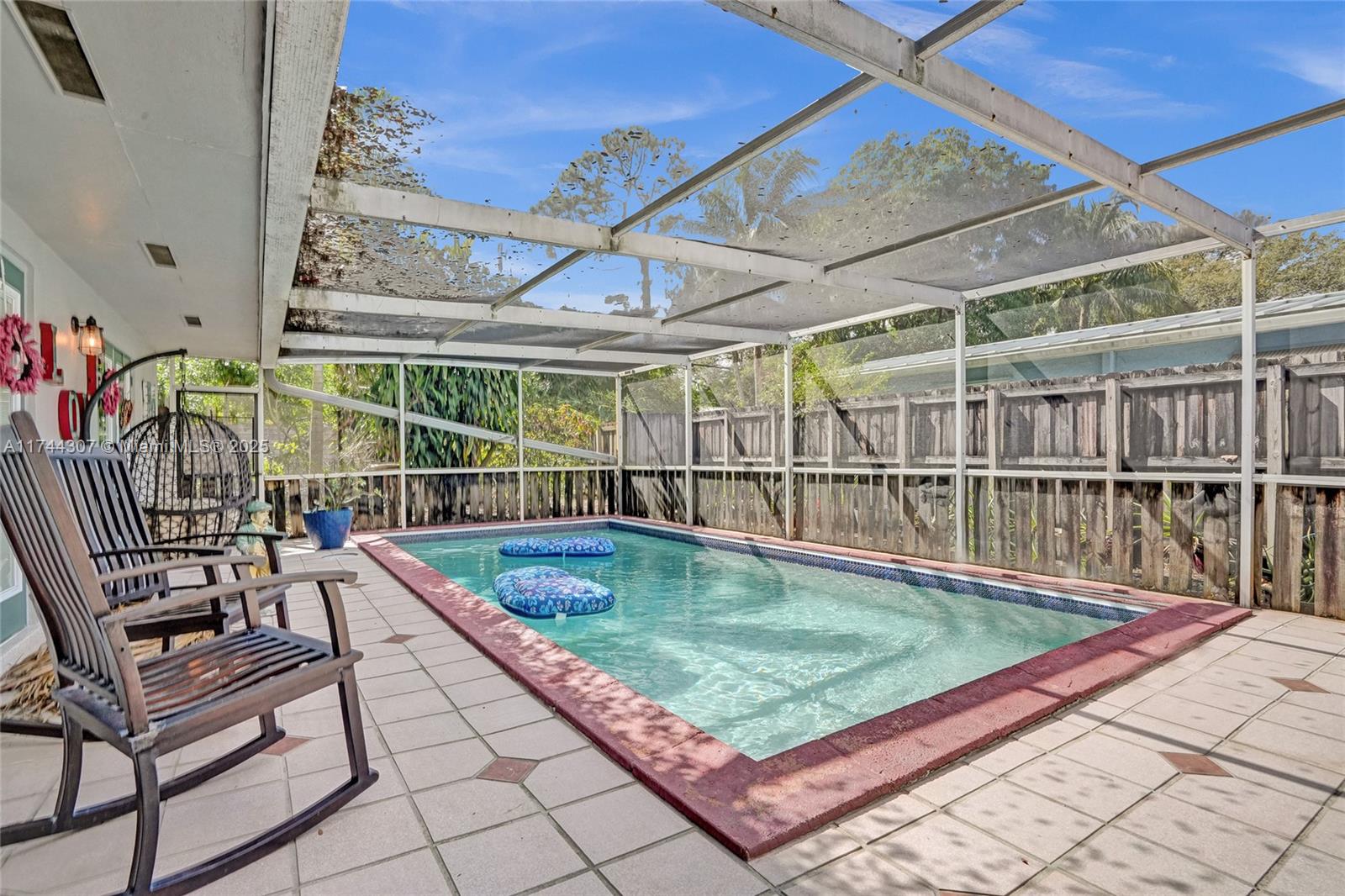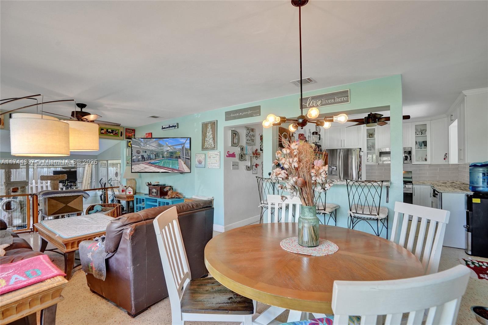 Step inside this beautifully updated 4 bedrooms, 2 bath home in sought after Riverland Village! Featuring terrazzo floors throughout, home offers a spacious living/dining area plus a extra family room. The updated kitchen boasts granite countertops, subway tile backsplash, white cabinets, & a gas range. Both bathrooms have been tastefully updated, w/the primary suite featuring a Cabana bath. Tons of storage throughout, including multiple closets, two well-maintained sheds, & extra storage in the carport area. Outside, enjoy a screened-in pool, a large fenced yard w/a mango tree, & an outdoor laundry area. Additional features include a 1-car carport, 2020 AC & heat pump, 2017 roof, a tankless gas water heater & gas dryer, with all-natural gas.
