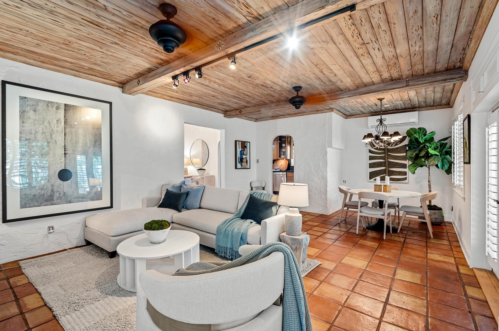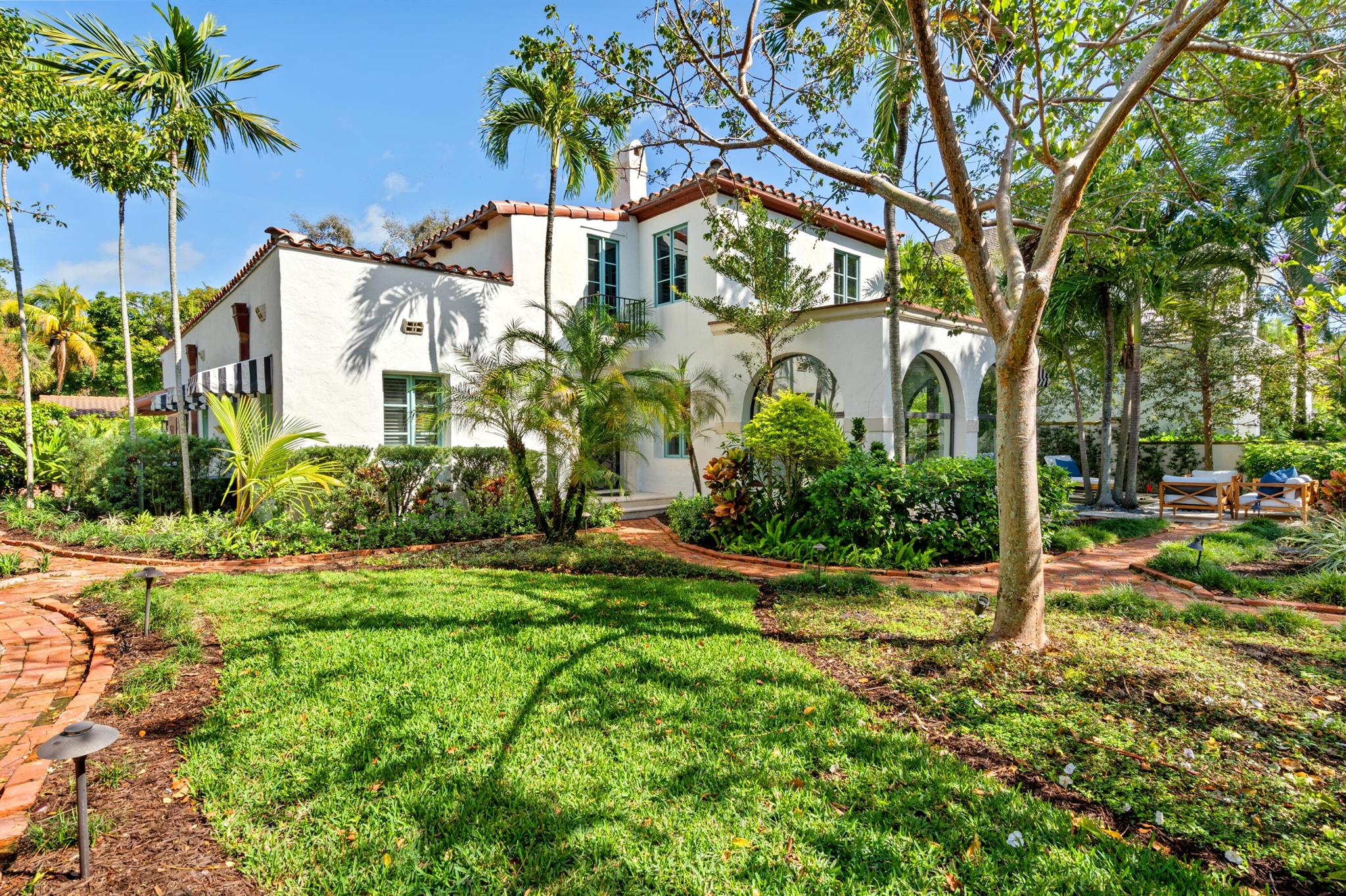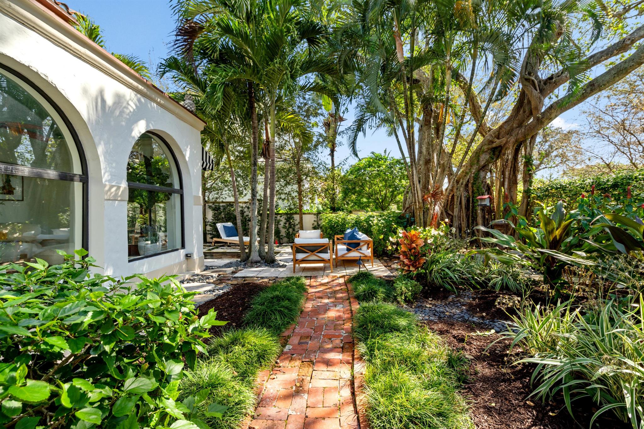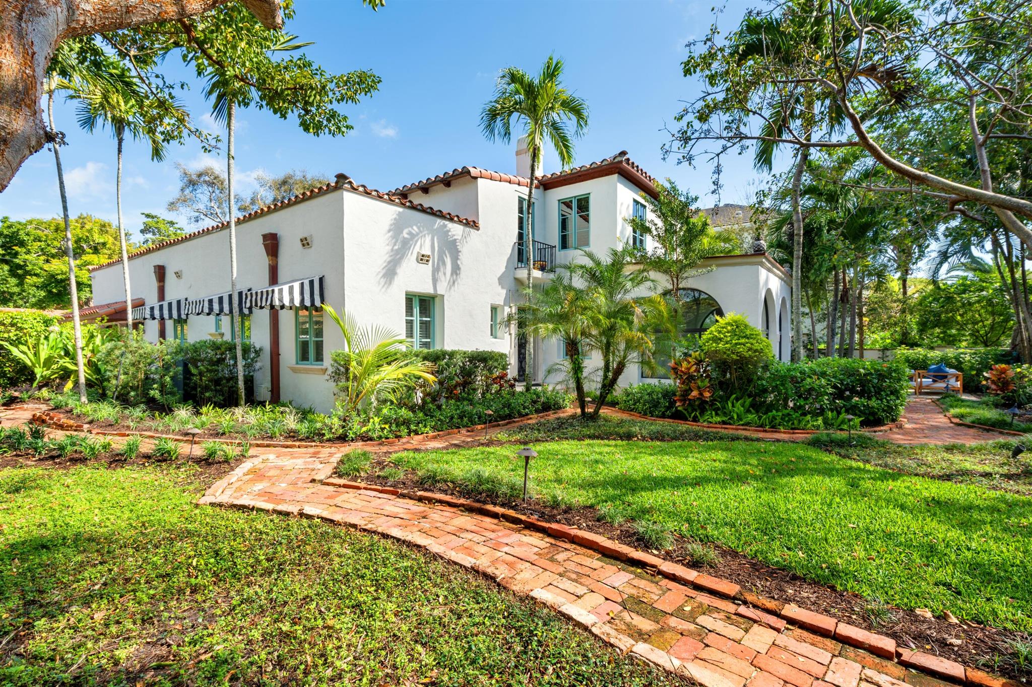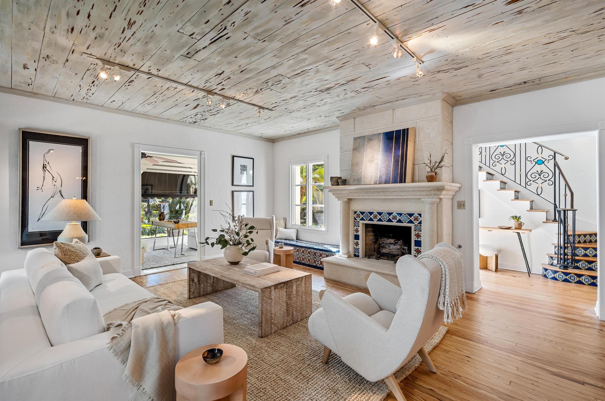 This light-filled Spanish-Colonial residence (circa 1927) incorporates many elements representative of Mizner's style and time: authentic barrel tile roof, iron-wrapped front door, sprung-arch windows, pecky cypress ceilings, original Dade County pine and terra cotta floors, stone fireplace with hearth,It was reimagined to incorporate an updated contemporary kitchen with top-of-the-line stainless steel appliances (Sub-Zero refrigerator, DCS gas range), refrigerated wine storage, remodeled full bathrooms, reconfigured primary boutique closet, renovated staircase with wood treads/hand-painted inset tile risers/scrolled iron railing, refinished wood floors and washed cypress ceilings, a glorious pool-view office, and side-load garage.