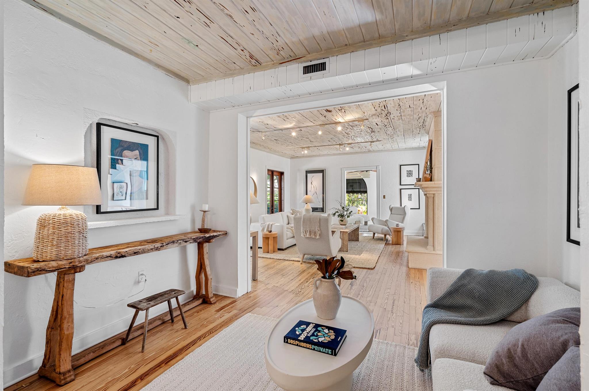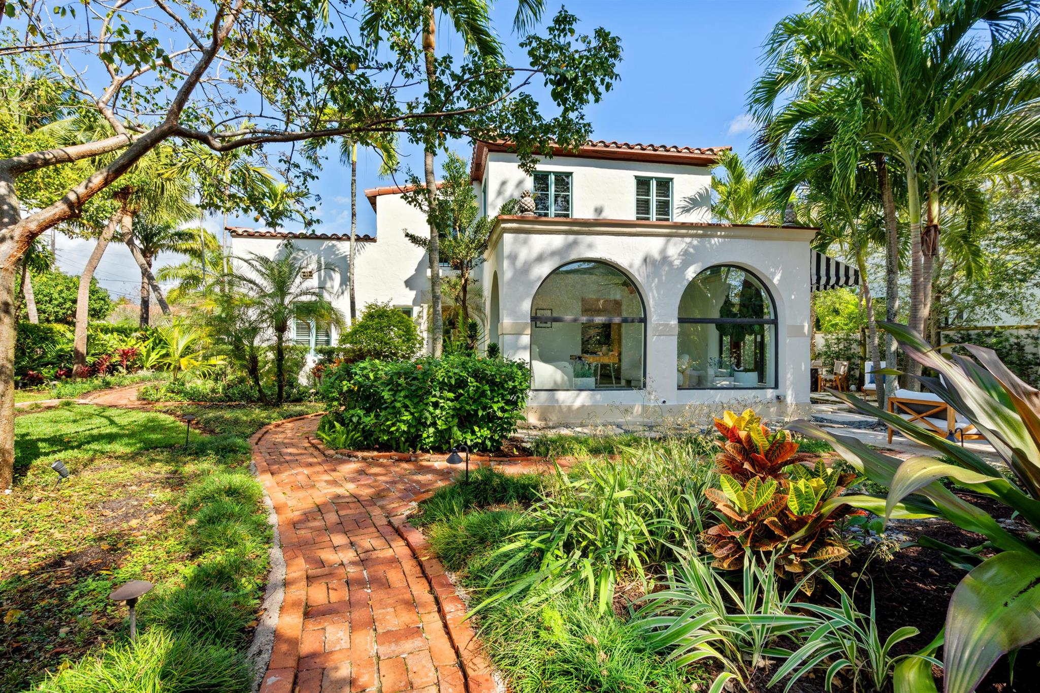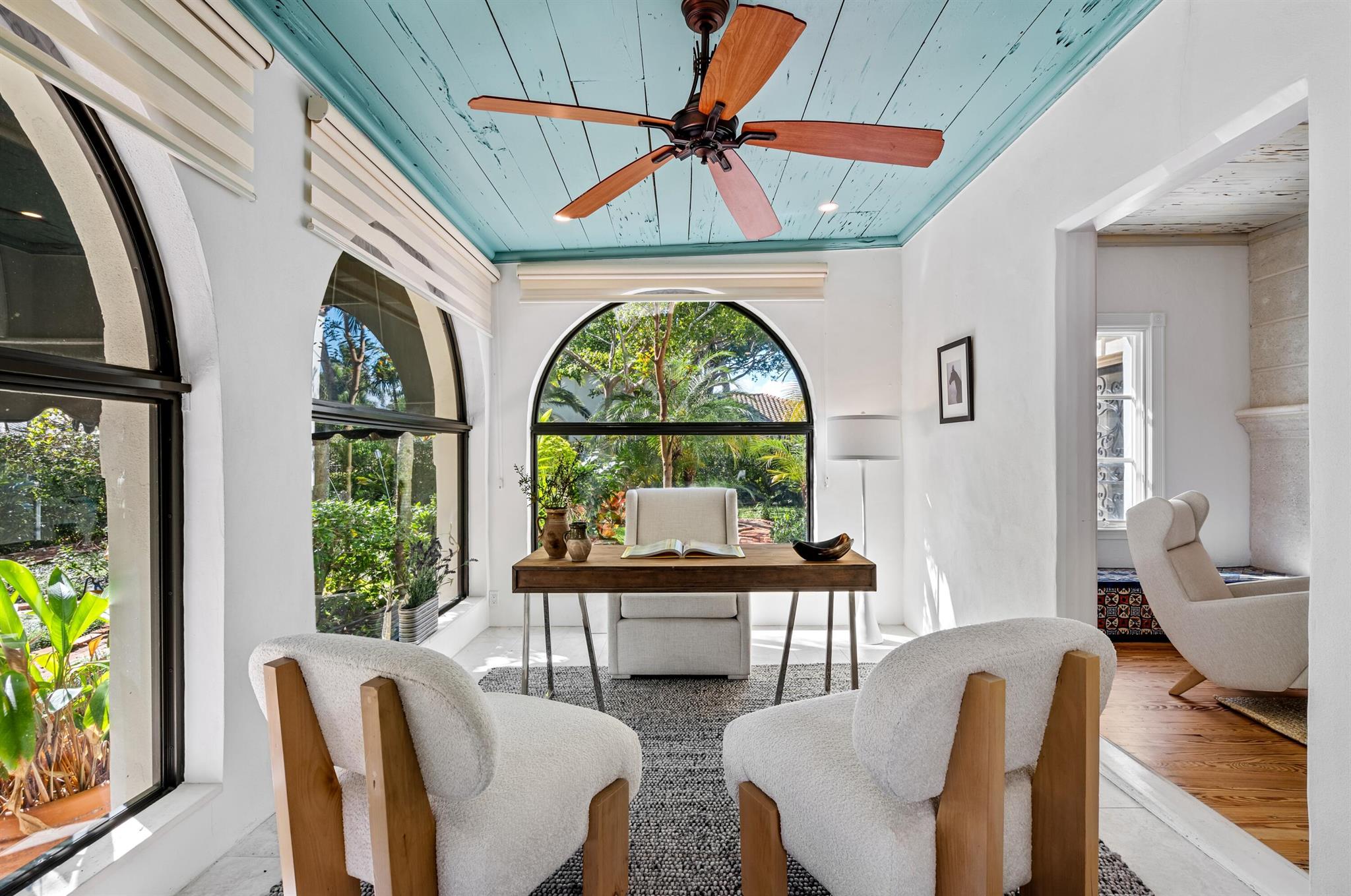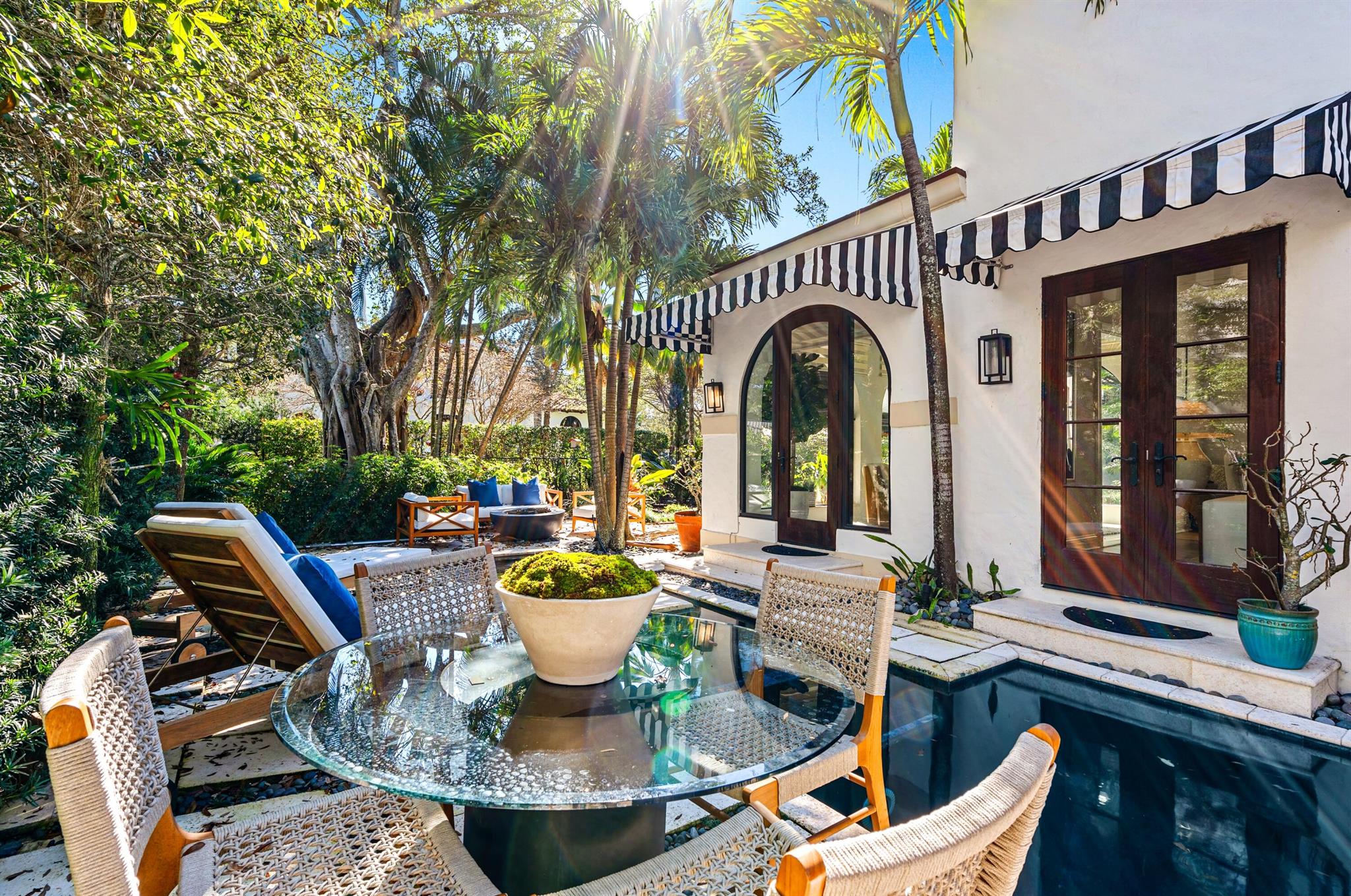 This light-filled Spanish-Colonial residence (circa 1927) incorporates many elements representative of Mizner's style and time: authentic barrel tile roof, iron-wrapped front door, sprung-arch windows, pecky cypress ceilings, original Dade County pine and terra cotta floors, stone fireplace with hearth,It was reimagined to incorporate an updated contemporary kitchen with top-of-the-line stainless steel appliances (Sub-Zero refrigerator, DCS gas range), refrigerated wine storage, remodeled full bathrooms, reconfigured primary boutique closet, renovated staircase with wood treads/hand-painted inset tile risers/scrolled iron railing, refinished wood floors and washed cypress ceilings, a glorious pool-view office, and side-load garage.