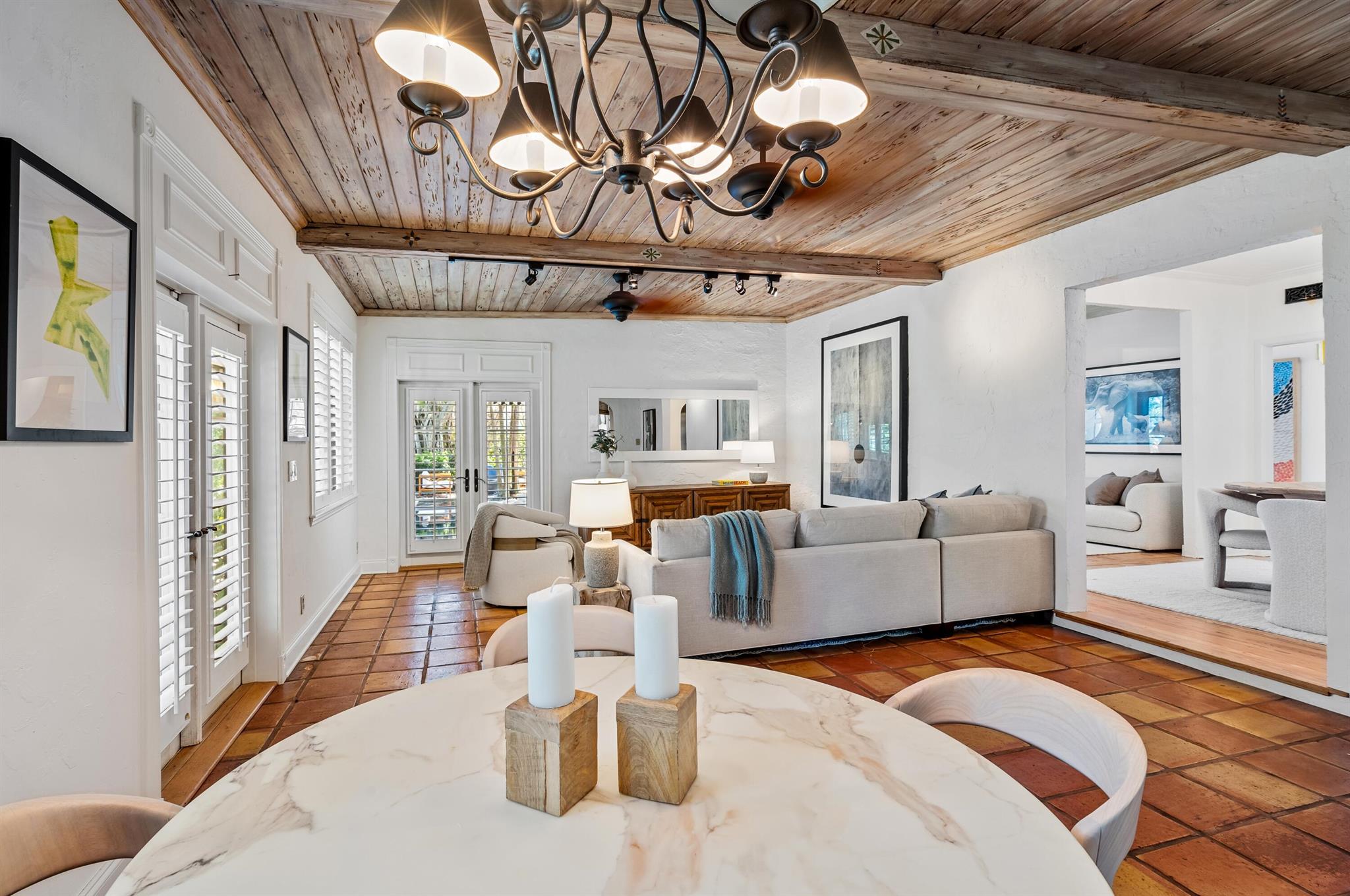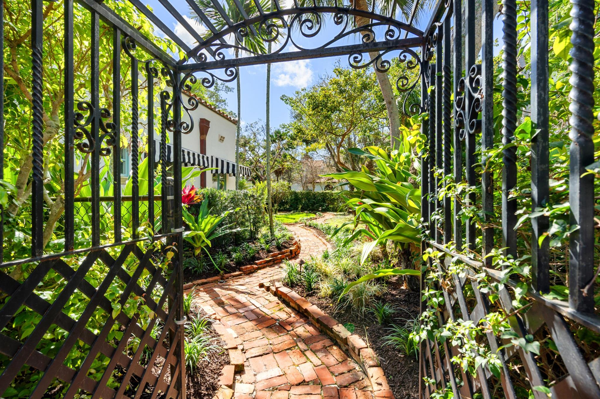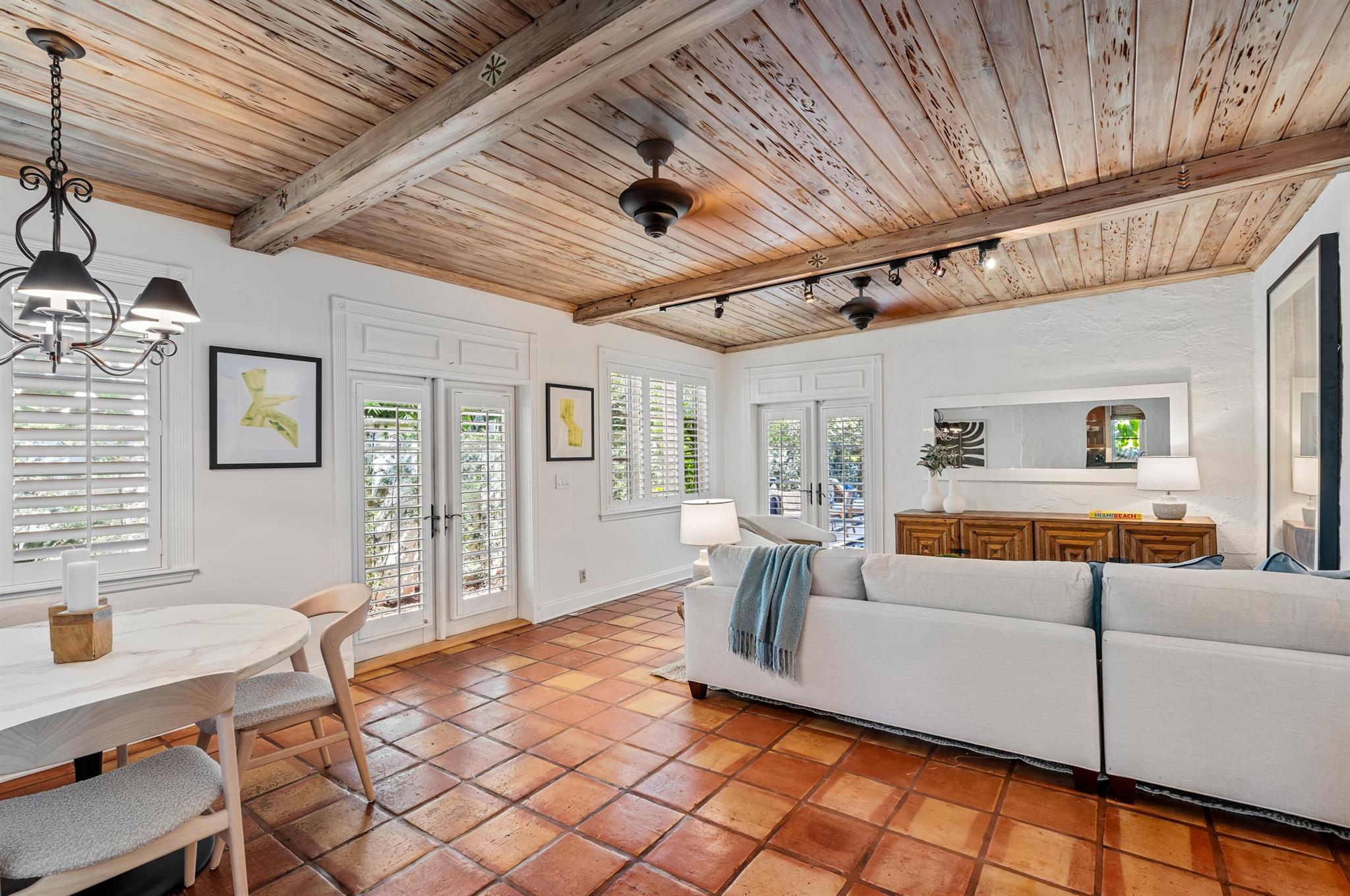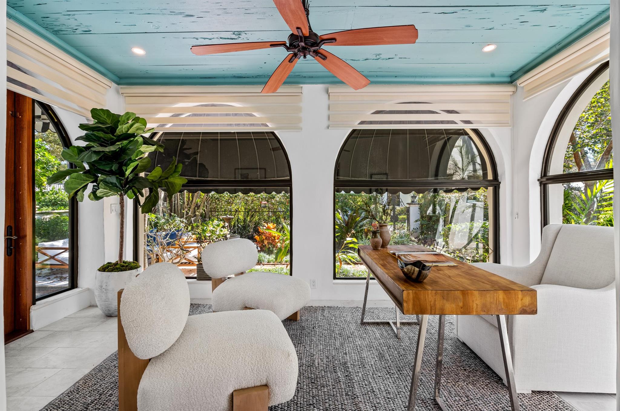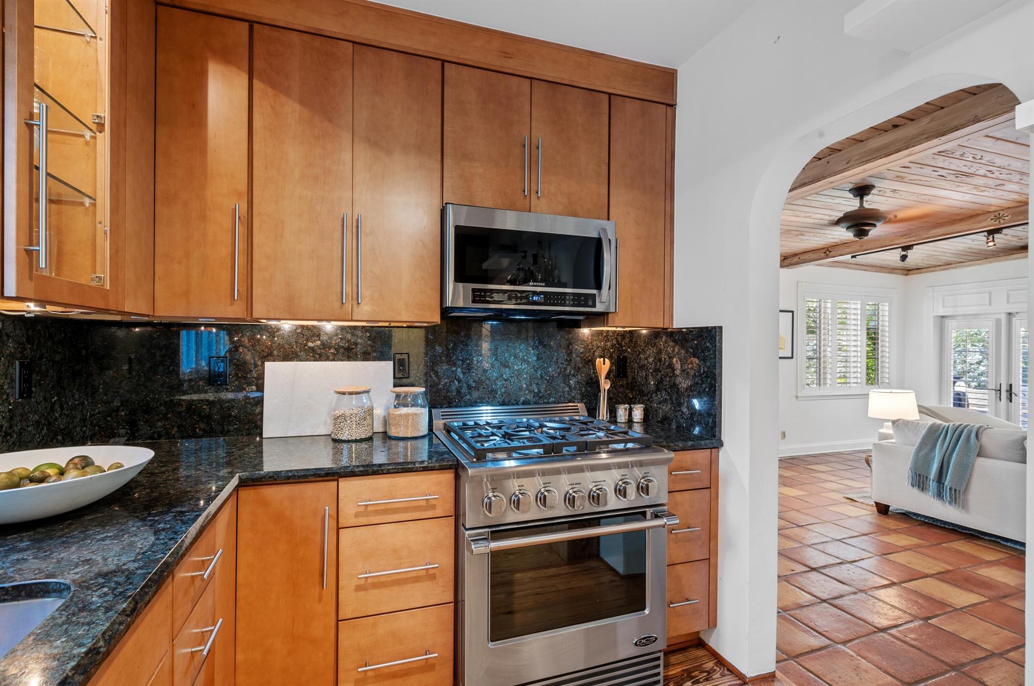 This light-filled Spanish-Colonial residence (circa 1927) incorporates many elements representative of Mizner's style and time: authentic barrel tile roof, iron-wrapped front door, sprung-arch windows, pecky cypress ceilings, original Dade County pine and terra cotta floors, stone fireplace with hearth,It was reimagined to incorporate an updated contemporary kitchen with top-of-the-line stainless steel appliances (Sub-Zero refrigerator, DCS gas range), refrigerated wine storage, remodeled full bathrooms, reconfigured primary boutique closet, renovated staircase with wood treads/hand-painted inset tile risers/scrolled iron railing, refinished wood floors and washed cypress ceilings, a glorious pool-view office, and side-load garage.