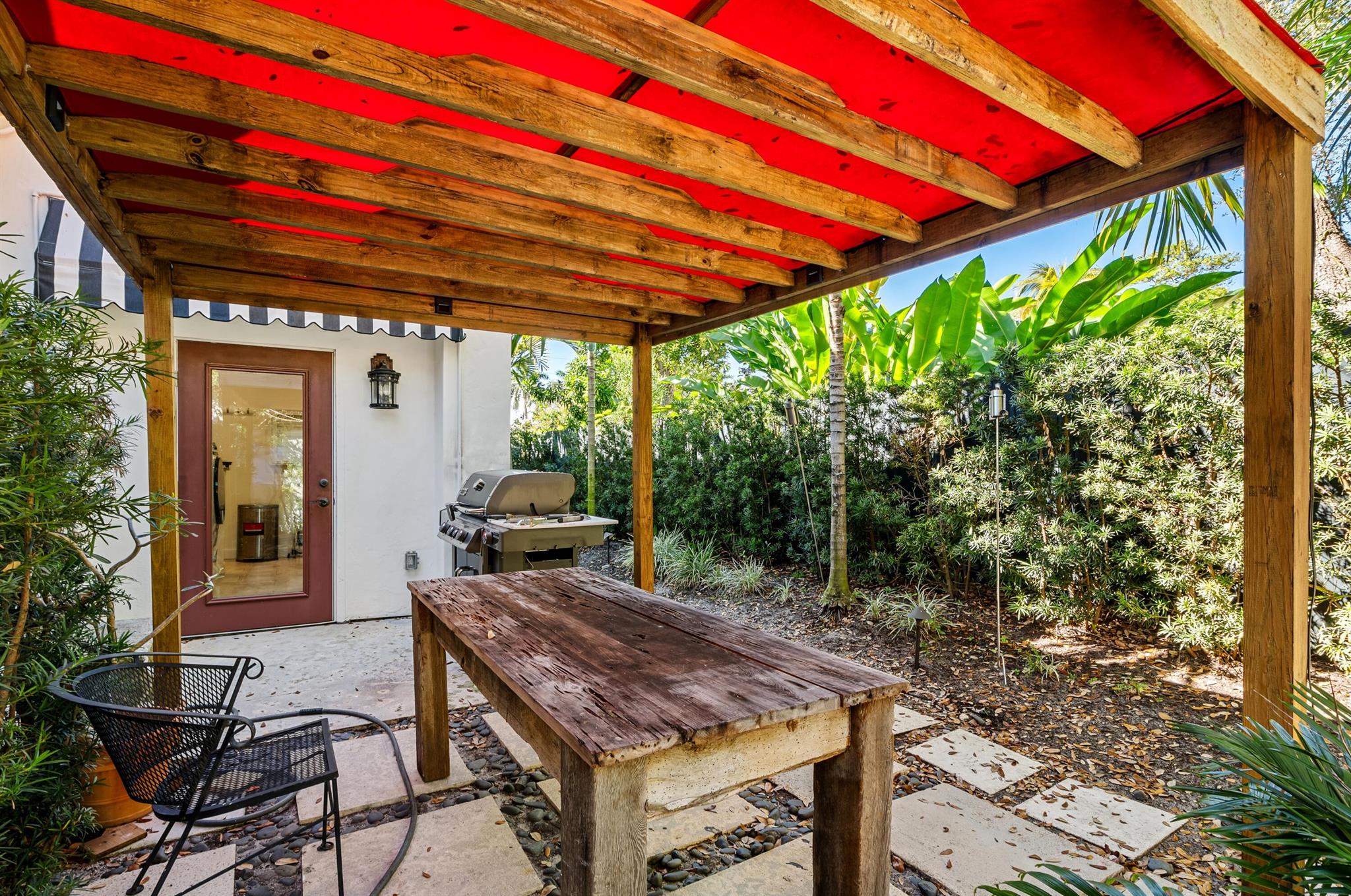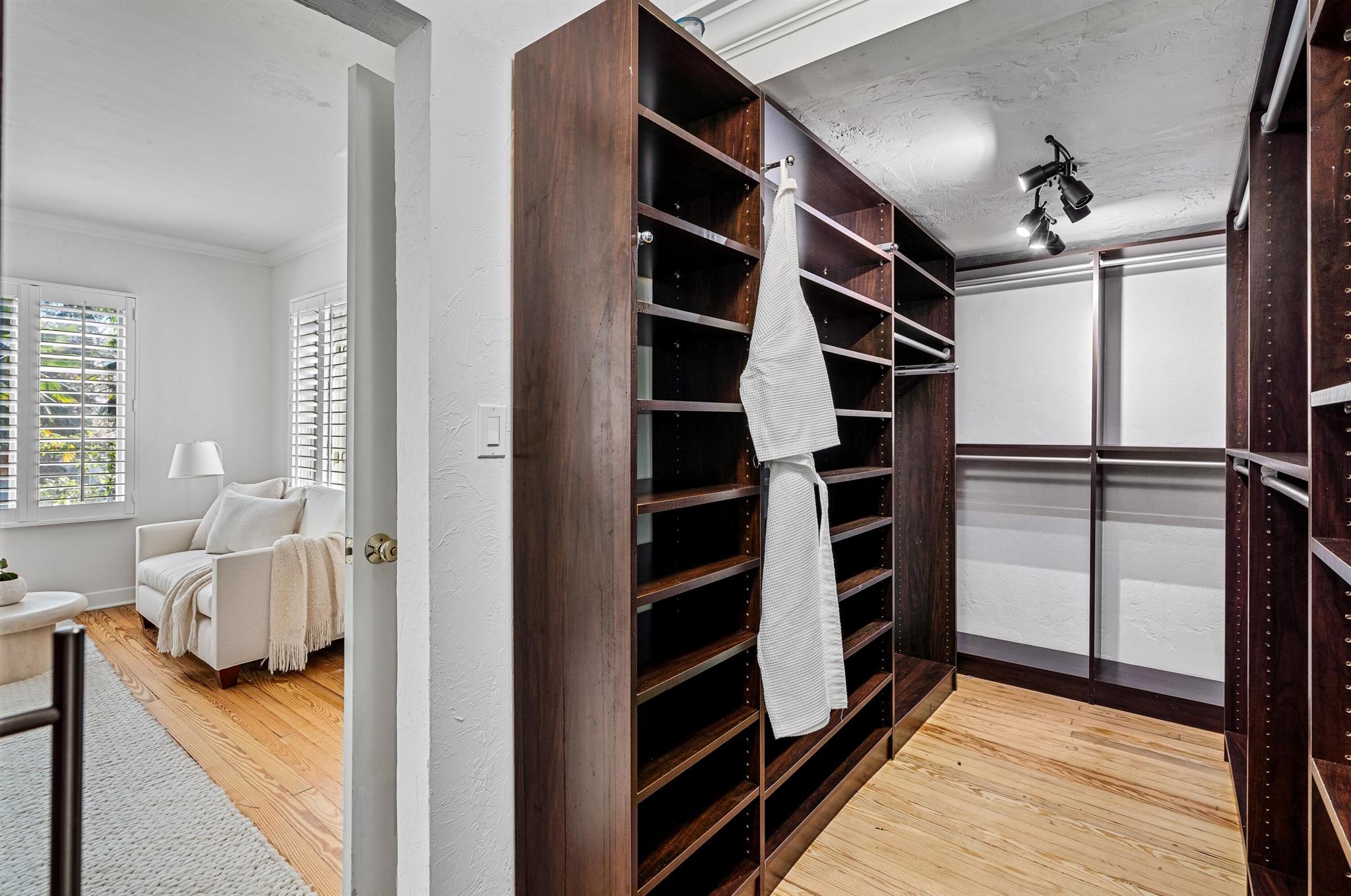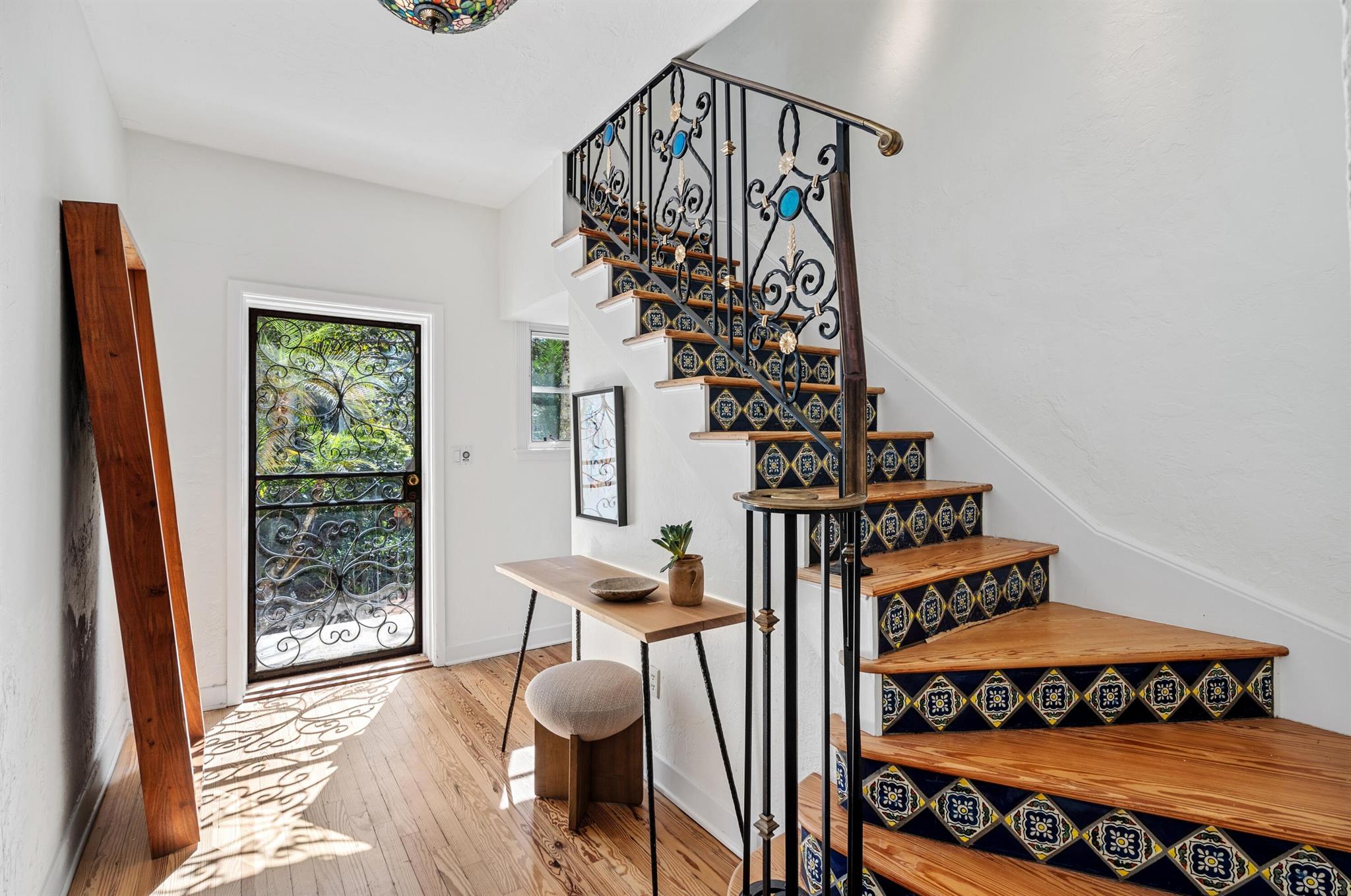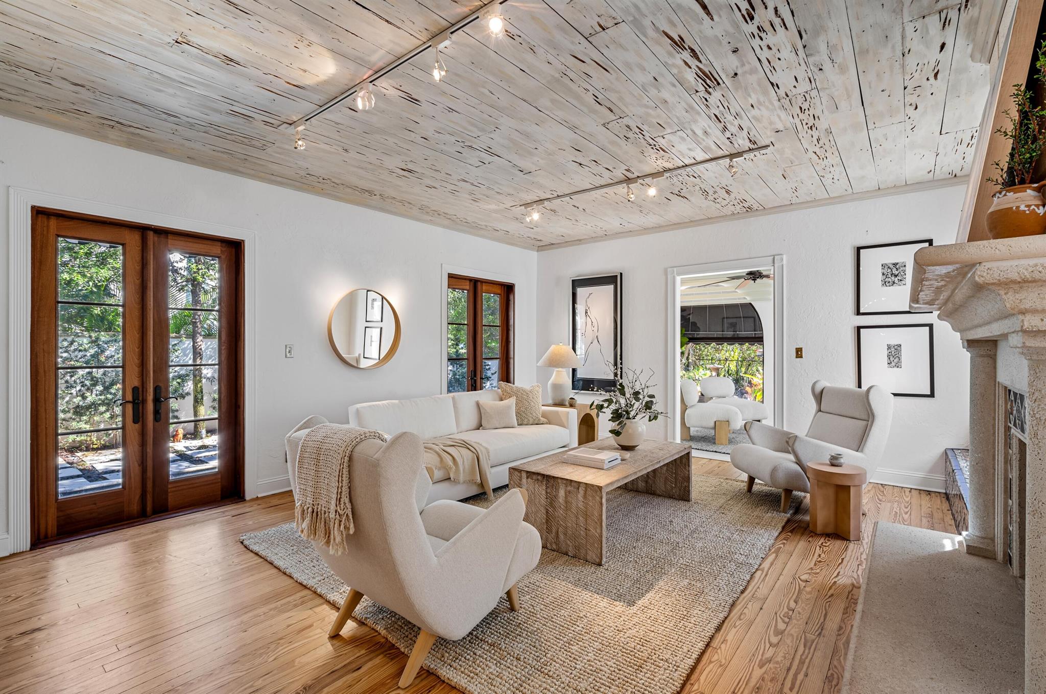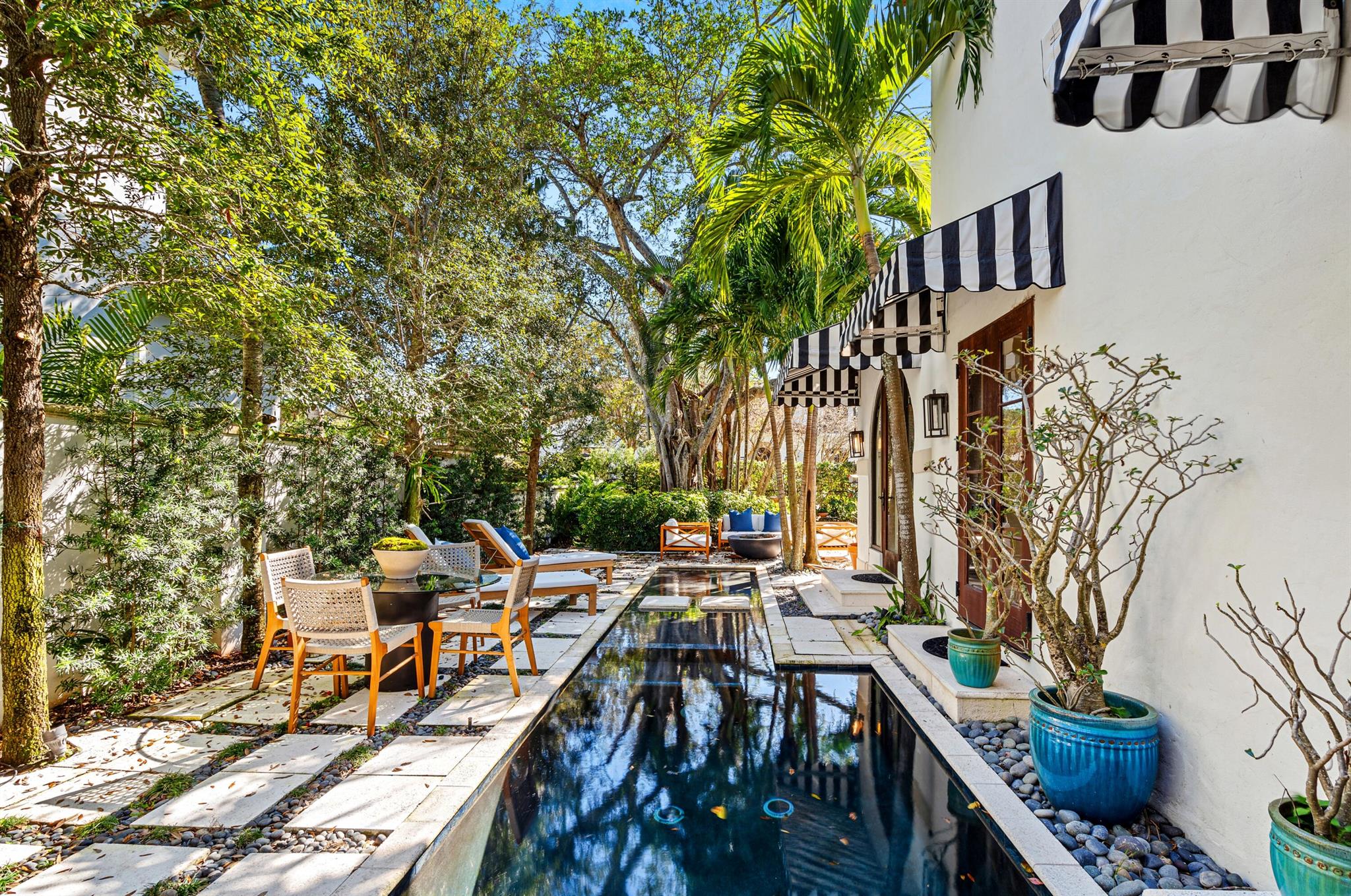 This light-filled Spanish-Colonial residence (circa 1927) incorporates many elements representative of Mizner's style and time: authentic barrel tile roof, iron-wrapped front door, sprung-arch windows, pecky cypress ceilings, original Dade County pine and terra cotta floors, stone fireplace with hearth,It was reimagined to incorporate an updated contemporary kitchen with top-of-the-line stainless steel appliances (Sub-Zero refrigerator, DCS gas range), refrigerated wine storage, remodeled full bathrooms, reconfigured primary boutique closet, renovated staircase with wood treads/hand-painted inset tile risers/scrolled iron railing, refinished wood floors and washed cypress ceilings, a glorious pool-view office, and side-load garage.