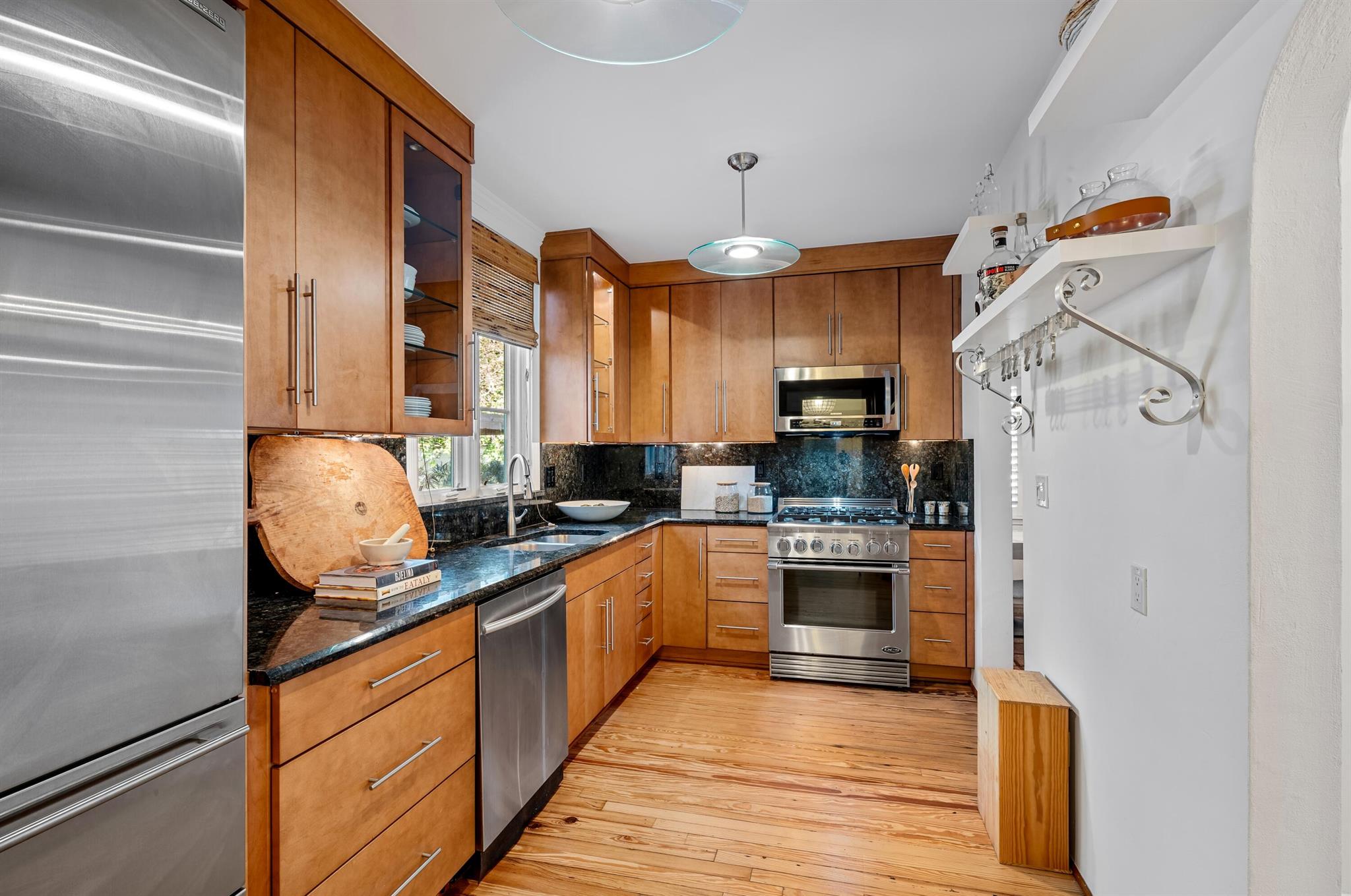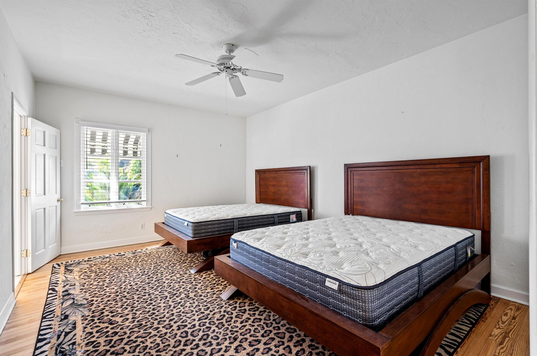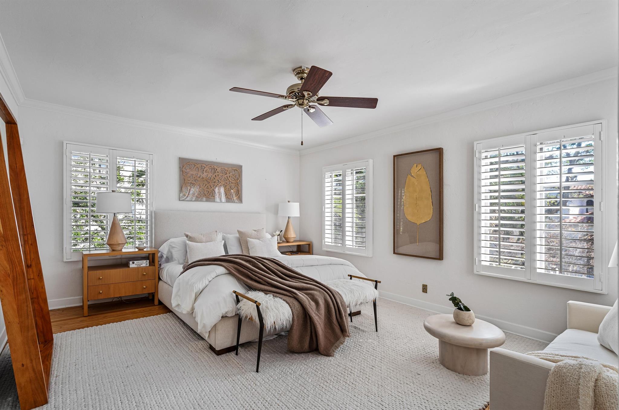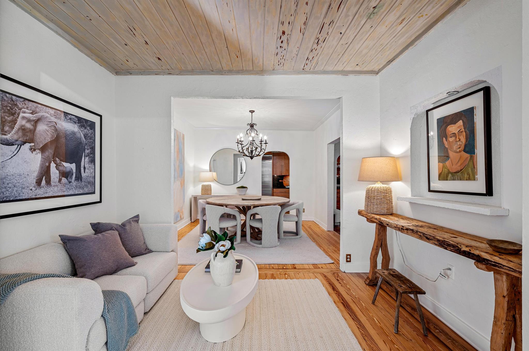 This light-filled Spanish-Colonial residence (circa 1927) incorporates many elements representative of Mizner's style and time: authentic barrel tile roof, iron-wrapped front door, sprung-arch windows, pecky cypress ceilings, original Dade County pine and terra cotta floors, stone fireplace with hearth,It was reimagined to incorporate an updated contemporary kitchen with top-of-the-line stainless steel appliances (Sub-Zero refrigerator, DCS gas range), refrigerated wine storage, remodeled full bathrooms, reconfigured primary boutique closet, renovated staircase with wood treads/hand-painted inset tile risers/scrolled iron railing, refinished wood floors and washed cypress ceilings, a glorious pool-view office, and side-load garage.