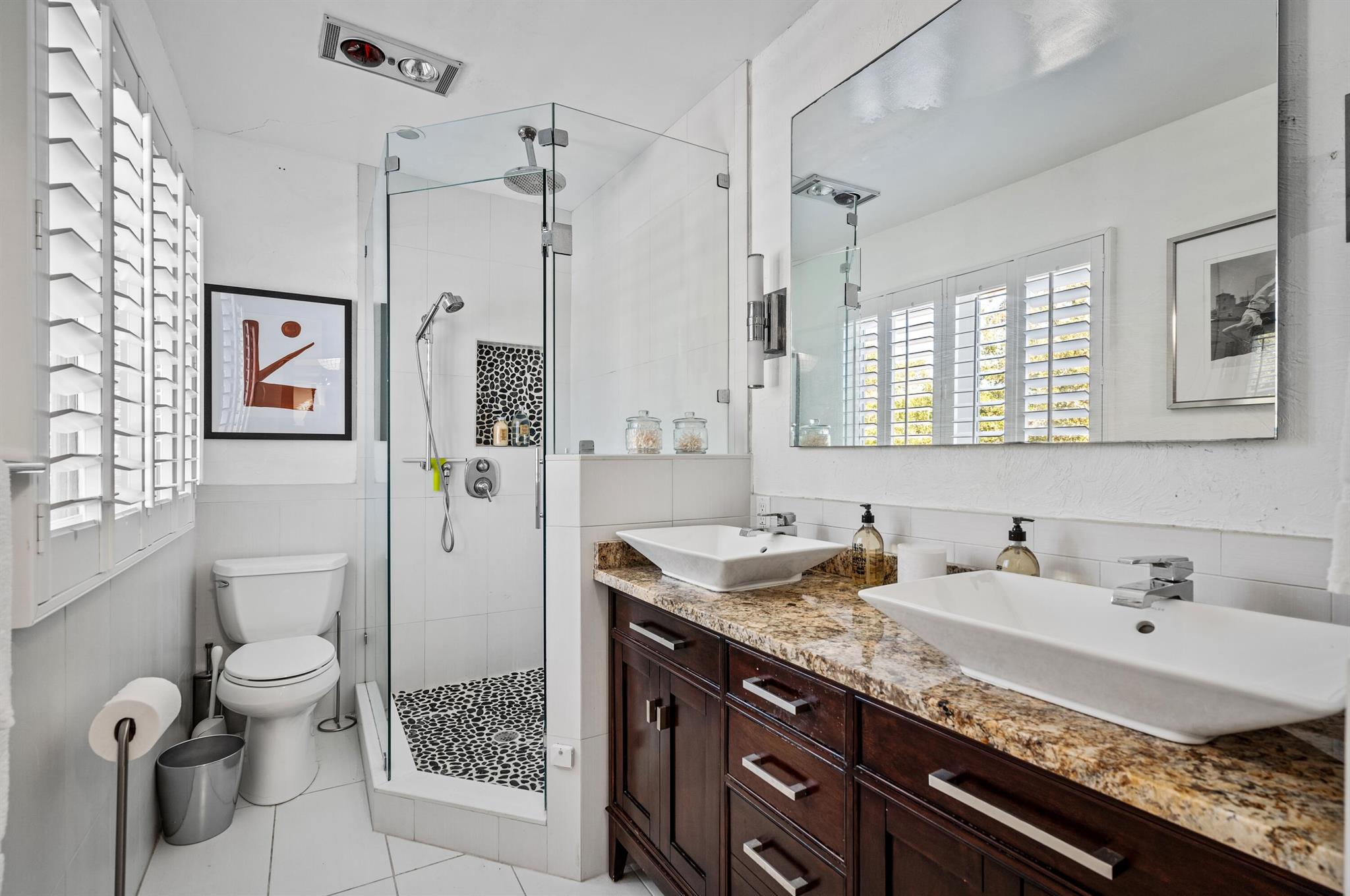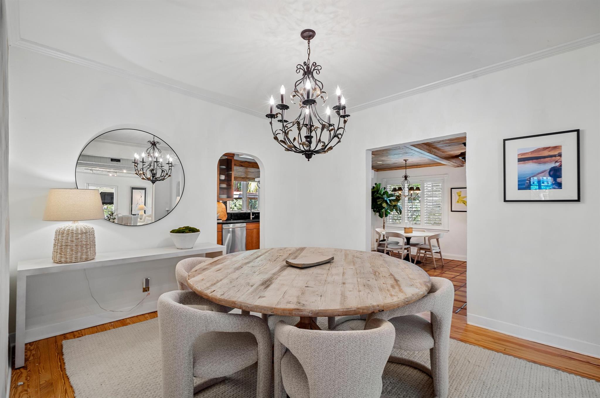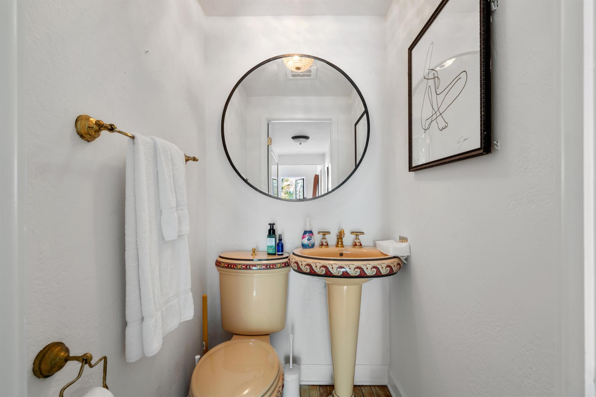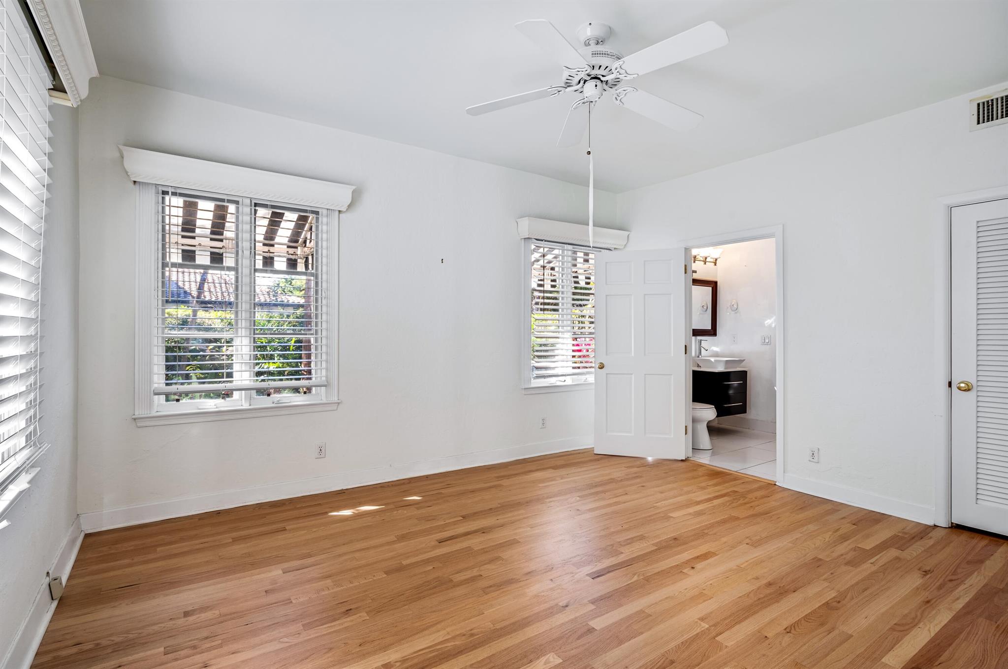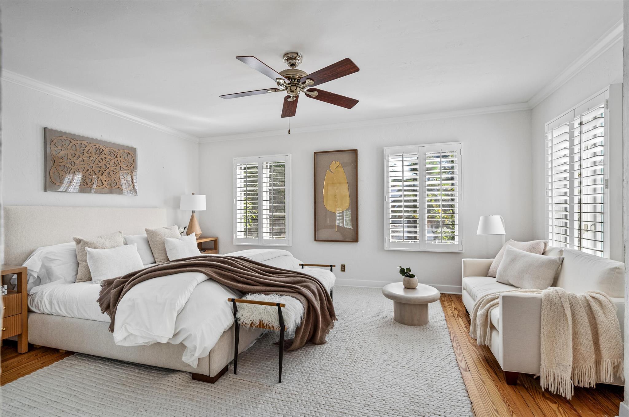 This light-filled Spanish-Colonial residence (circa 1927) incorporates many elements representative of Mizner's style and time: authentic barrel tile roof, iron-wrapped front door, sprung-arch windows, pecky cypress ceilings, original Dade County pine and terra cotta floors, stone fireplace with hearth,It was reimagined to incorporate an updated contemporary kitchen with top-of-the-line stainless steel appliances (Sub-Zero refrigerator, DCS gas range), refrigerated wine storage, remodeled full bathrooms, reconfigured primary boutique closet, renovated staircase with wood treads/hand-painted inset tile risers/scrolled iron railing, refinished wood floors and washed cypress ceilings, a glorious pool-view office, and side-load garage.
