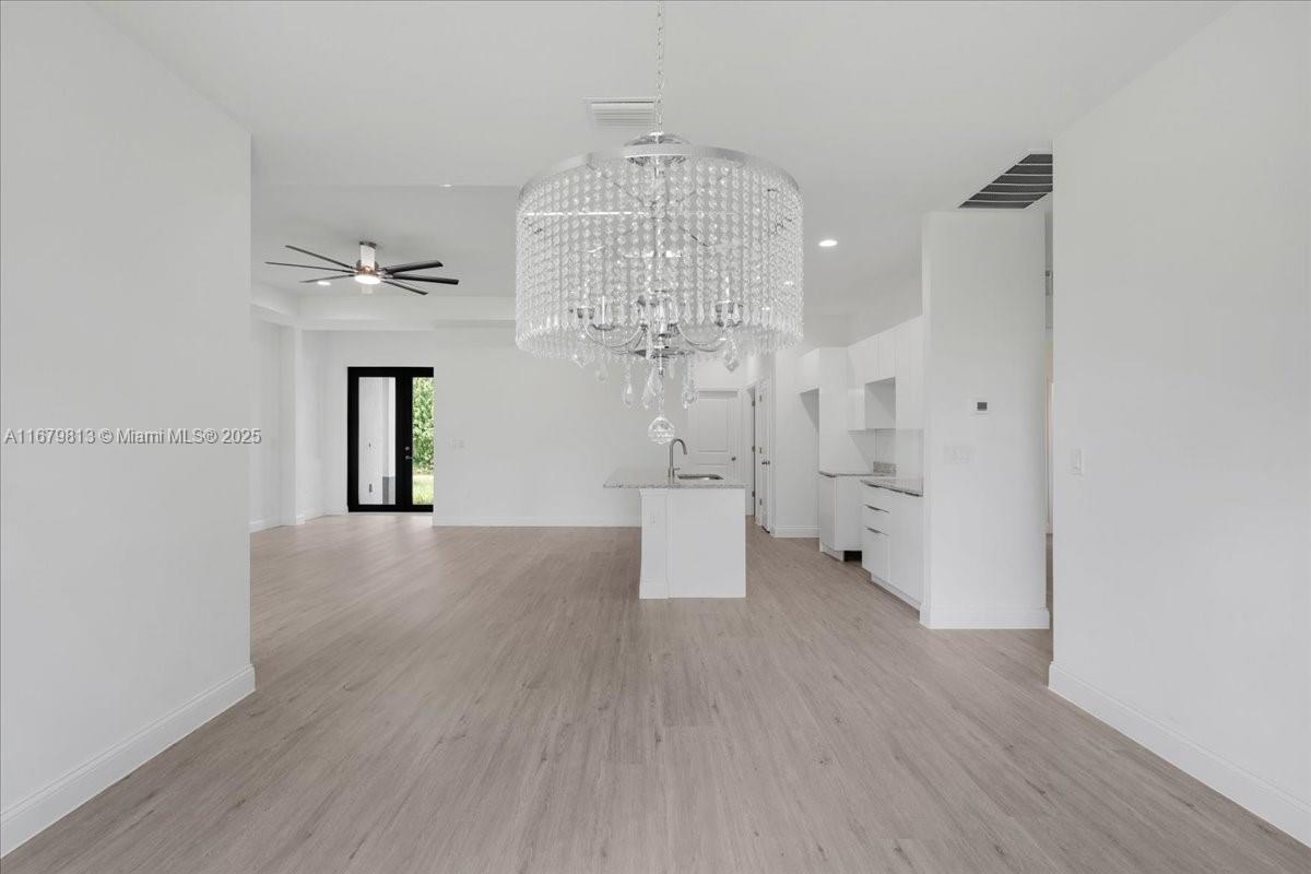 2024 built single-family, move in ready home, boasts 3 spacious bedrooms plus a den, 2.5 bathrooms, and a huge screened in lanai, situated on an oversized 1/2 of an acre, providing ample space. The den/office space is perfect for those need a quiet place to study, or can be used as a guest room. The kitchen features quartz counters, stainless steel appliances including a washer and dryer, large island and modern tall soft-close cabinets, making meal prep a breeze. The huge dining room can accommodate your largest Dining table. Luxurious, 24x48 large tiled flooring flows seamlessly throughout the home. Don't miss your chance to own this beautiful home in a desirable location of Lehigh Acres, close to all amenities and SWFL International Airport. Best deal on a 1/2 Acre Lot.