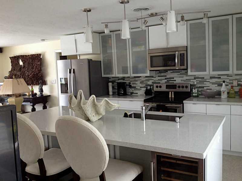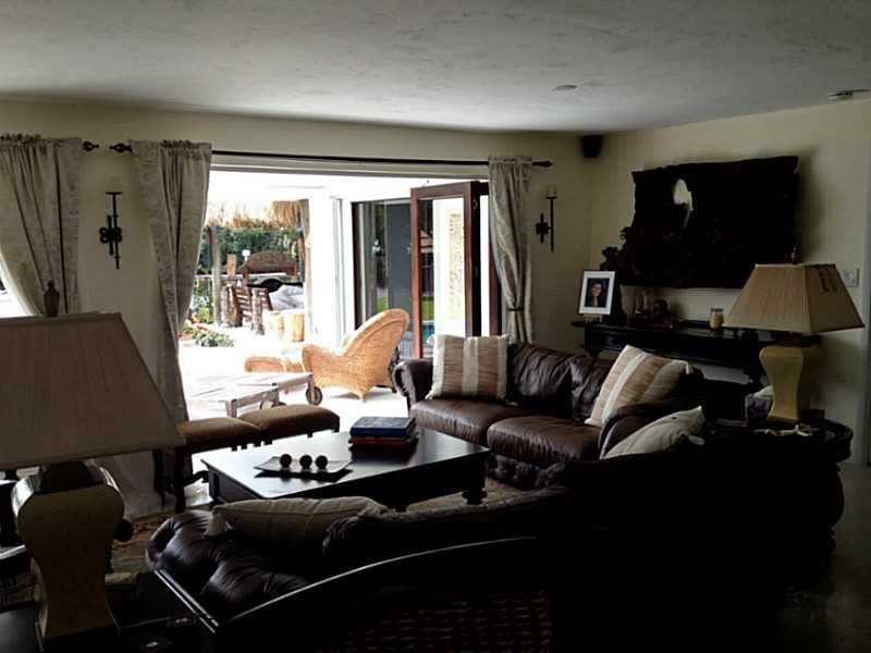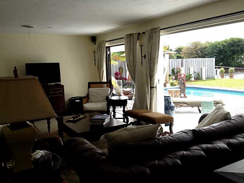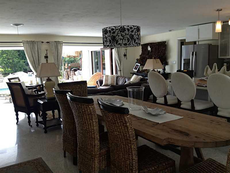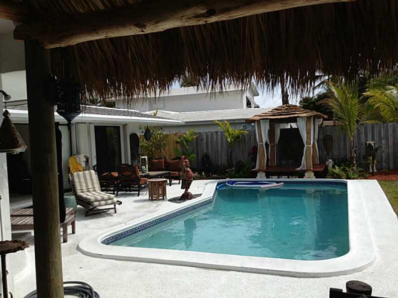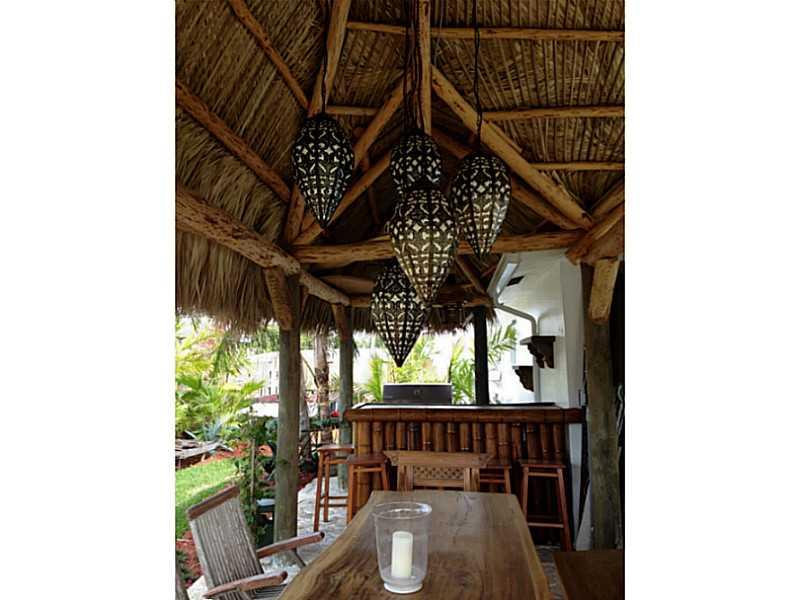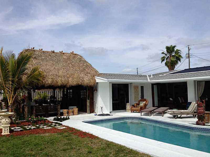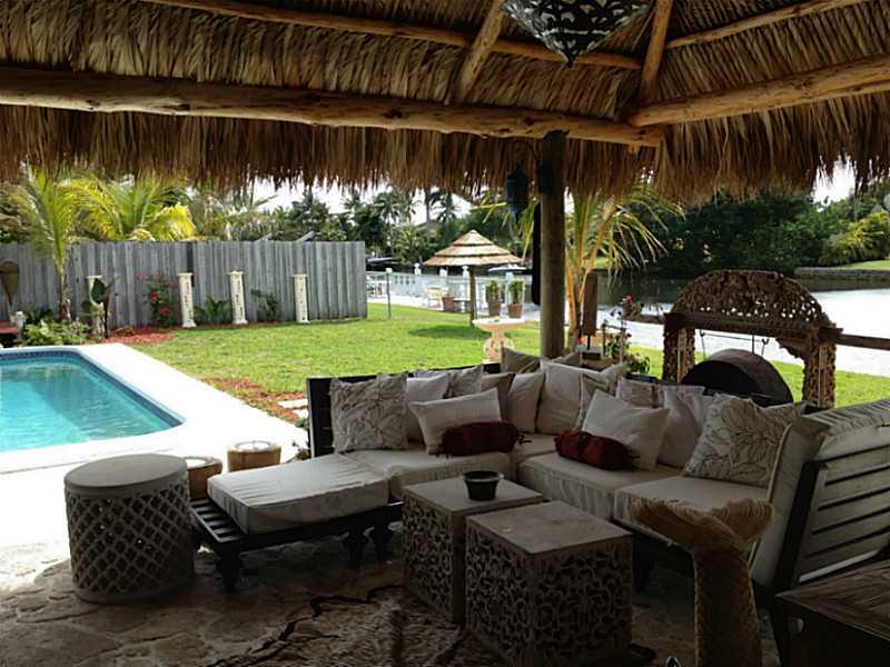 Beautiful Balinese inspired waterfront home overlooking 175foot wide canal, widest in Broward. Refinished light terrazzo floors, white lacquer contemporary kitchen with quartz countertops and ss appliances including wine chiller. Beautiful view out to po ol and water from every room. Southern exposure, dock, new solar heat for pool, nicely updated. 450 sf outdoor Chickee allows for alfresco dining for 12 and an outdoor family room w TV. Tiki Bar. Gorgeous Coralstone floor in tiki reclaimed from 1920s.