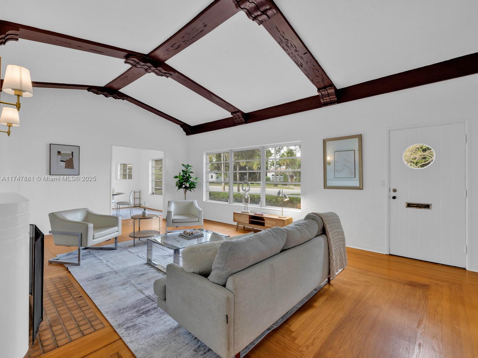 Welcome to Ten Oaks! Create your own dream home in this lovingly maintained, spacious early mid-century home on an oversized 12,900 SF lot enveloped by ten majestic oak trees. Enter into the grand vaulted great room with elegant formal dining, spacious kitchen, and bright sunroom den opening to the huge rear gardens. Three spacious bedrooms and two bathrooms in the main house, plus a separate detached 200+ SF bonus unit with powder room-- great as a home office, gym, zen den, or guest nook. Great features: timeless character and period charm, new roof (2024), vintage fireplace, retro custom built-ins, volume ceilings, plus a one-car garage, an additional carport, and bonus rear alley driveway. All in an amazing downtown Miami Shores non-flood zone location, with upside galore!