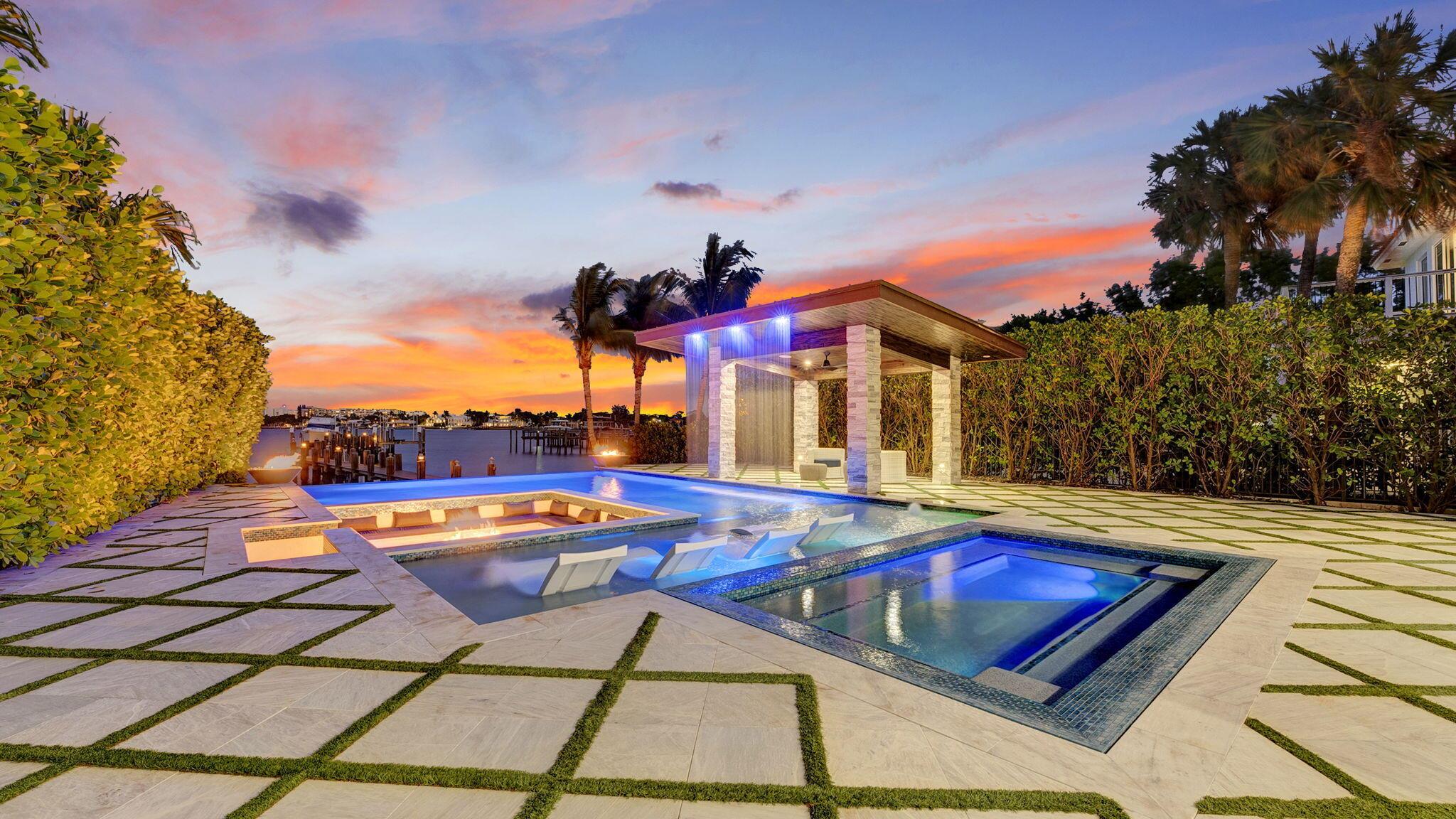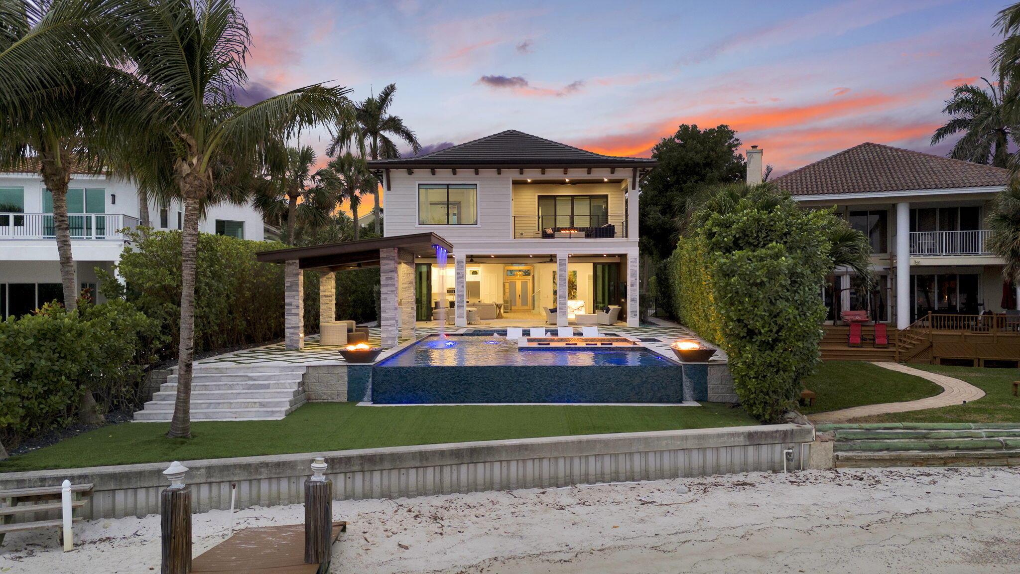 Luxury Waterfront Oasis - An Entertainer's Dream HomeExperience the pinnacle of coastal luxury in this magnificent five-bedroom, five-bathroom estate, perfectly positioned along the Intracoastal Waterway with breathtaking views of the ocean and Palm Beach Island. Designed for those who appreciate impeccable craftsmanship and top-tier amenities, this home offers the ultimate entertainer's paradise.Unrivaled Outdoor LivingInfinity-edge pool & spa overlooking the IntracoastalSunken fire pit with built-in seating for intimate waterfront gatheringsPrivate sandy beach--your own personal waterfront escapeCustom waterfall feature enhancing the tropical ambiancePrivate boat dock with 25,000-lb boat lift, perfect for yacht enthusiasts