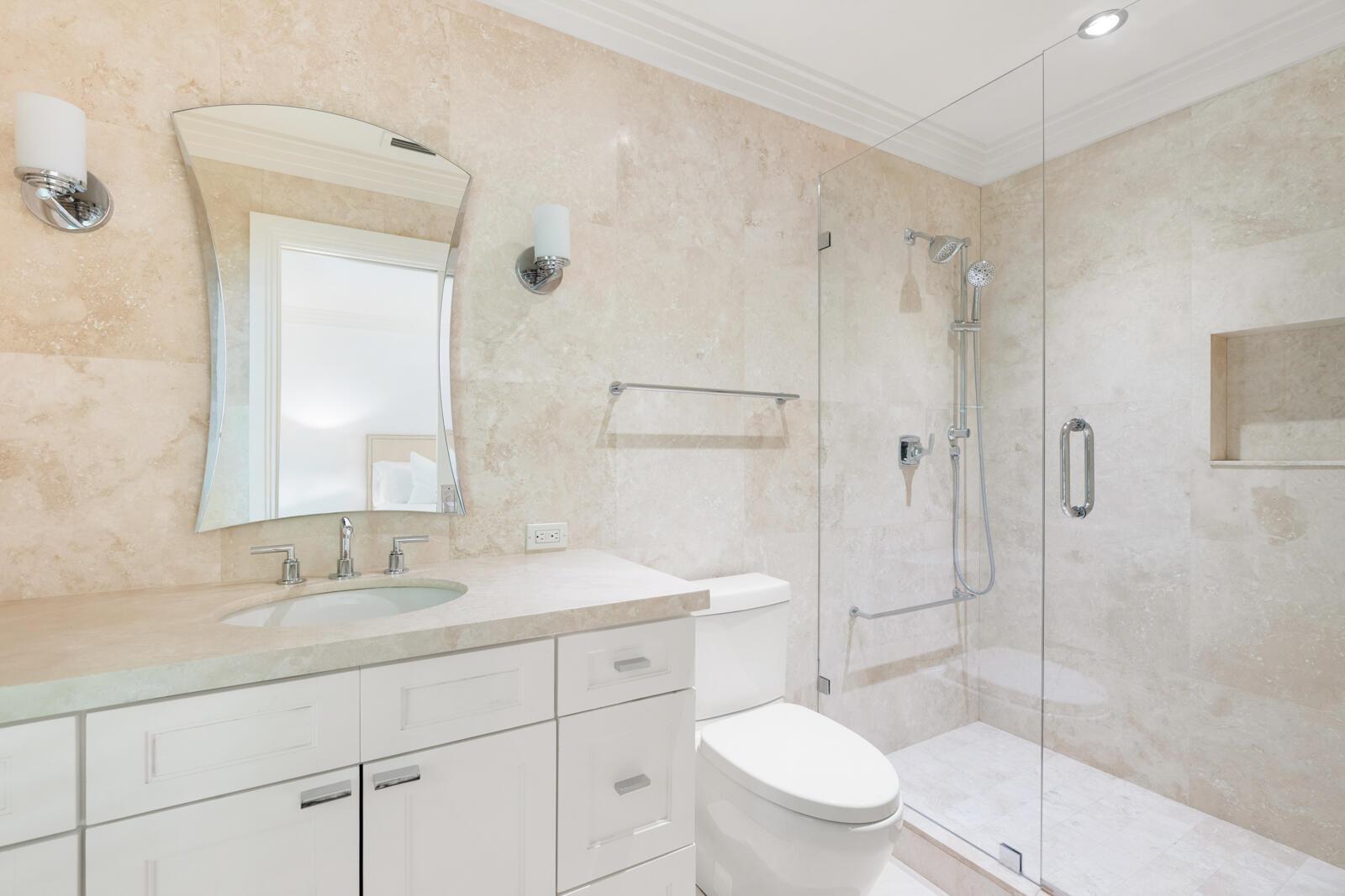 Located on a quiet street in Palm Beach's North End, this modern beach house offers 3,803+/- total square feet with four bedrooms and four and a half bathrooms. Set on a 12,206+/- square foot lot, the property features a large pool, spacious yard, and an air-conditioned two-car garage.The interior blends comfort and coastal style, with wood flooring throughout the main living areas and marble finishes in the bathrooms. The living room opens through sliding glass doors to the pool and patio area, creating a natural flow between indoor and outdoor spaces. The kitchen includes a breakfast area, full-size Sub-Zero refrigerator and freezer, double ovens, and an electric cooktop. The adjacent dining room overlooks the lushly landscaped grounds.